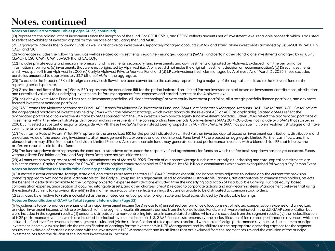 R-14 7 G-19 5 B-19 7 R-88 G-15 9 B-16 5 R-13 6 G-18 0 B-83 R-16 3 G-14 3 B-18 7 R-0 G-74 B-13 6 R-18 5 G-21 1 B-15 3 R-11 8 G-92 B-15 0 R-22 0 G-22 1 B-23 2 R-14 0 G-14 1 B-15 2R-12 0 G-16 9 B-22 2 Old Colors R-88 G-89 B-91 58595B R-23 G-234 B-234 EAEAEA R-208 G-232 B-247 D0E8F7 R-65 G-64 B-66 414042 R-8 G-51 B-94 08335E R-167 G-169 B-171 A7A9AB R-9 G-102 B-112 096670 R-220 G-221 B-222 DCDDDE R-97 G-161 B-224 61A1E0 R-237 G-217 B-157 EDD99D R-147 G-195 B-197 93C3C5 Notes, continued Notes on Fund Performance Tables (Pages 24-27)(continued) (19) Represents the original cost of investments since the inception of the fund. For CSP II, CSP III, and CSP IV, reflects amounts net of investment level recallable proceeds which is adjusted to reflect recyclability of invested capital for the purpose of calculating the fund MOIC. (20) Aggregate includes the following funds, as well as all active co-investments, separately managed accounts (SMAs), and stand-alone investments arranged by us: SASOF IV, SASOF V, CALF, and CICF. (21) Aggregate includes the following funds, as well as related co-investments, separately managed accounts (SMAs), and certain other stand-alone investments arranged by us: CSP I, CEMOF I, CSC, CMP I, CMP II, SASOF II, and CASCOF. (22) Includes private equity and mezzanine primary fund investments, secondary fund investments and co-investments originated by AlpInvest. Excluded from the performance information shown are: (a) investments that were not originated by AlpInvest (i.e., AlpInvest did not make the original investment decision or recommendation); (b) Direct Investments, which was spun off from AlpInvest in 2005; (c) Carlyle AlpInvest Private Markets Fund; and (d) LP co-investment vehicles managed by AlpInvest. As of March 31, 2023, these excluded portfolios amounted to approximately $3.7 billion of AUM in the aggregate. (23) To exclude the impact of FX, all foreign currency cash flows have been converted to the currency representing a majority of the capital committed to the relevant fund at the reporting period spot rate. (24) Gross Internal Rate of Return (“Gross IRR”) represents the annualized IRR for the period indicated on Limited Partner invested capital based on investment contributions, distributions and unrealized value of the underlying investments, before management fees, expenses and carried interest at the AlpInvest level. (25) Includes AlpInvest Atom Fund, all mezzanine investment portfolios, all ‘clean technology’ private equity investment portfolios, all strategic portfolio finance portfolios, and any state- focused investment mandate portfolios. (26) “ASF” stands for AlpInvest Secondaries Fund, “ACF” stands forAlpInvest Co-Investment Fund, and “SMAs” are Separately Managed Accounts. “ASF - SMAs” and “ACF - SMAs” reflect the aggregated portfolios of investments held by SMAs within the relevant strategy, which invest alongside the relevant ASF or ACF (as applicable). Strategic SMAs reflect the aggregated portfolios of co-investments made by SMAs sourced from the SMA investor’s own private equity fund investment portfolio. Other SMAs reflect the aggregated portfolios of investments within the relevant strategy that began making investments in the corresponding time periods. Co-Investments SMAs 2014-2016 does not include two SMAs that started in 2016 but invested a substantial majority alongside ACF VII. These two SMAs have instead been grouped with ACF VII - SMAs. An SMA may pursue multiple investment strategies and make commitments over multiple years. (27) Net Internal Rate of Return (“Net IRR”) represents the annualized IRR for the period indicated on Limited Partner invested capital based on investment contributions, distributions and unrealized value of the underlying investments, after management fees, expenses and carried interest. Fund level IRRs are based on aggregate Limited Partner cash flows, and this blended return may differ from that of individual Limited Partners. As a result, certain funds may generate accrued performance revenues with a blended Net IRR that is below the preferred return hurdle for that fund. (28) The fund stepdown date represents the contractual stepdown date under the respective fund agreements for funds on which the fee basis stepdown has not yet occurred. Funds without a listed Fee Initiation Date and Stepdown Date have not yet initiated fees. (29) All amounts shown represent total capital commitments as of March 31, 2023. Certain of our recent vintage funds are currently in fundraising and total capital commitments are subject to change. Capital Committed for CEMOF II reflects original committed capital of $2.8 billion, less $1.1 billion in commitments which were extinguished following a Key Person Event. Notes on Reconciliation for Distributable Earnings per Share (Page 29) (1) Estimated current corporate, foreign, state and local taxes represents the total U.S. GAAP Provision (benefit) for income taxes adjusted to include only the current tax provision (benefit) applied to Net income (loss) attributable to The Carlyle Group Inc. This adjustment, used to calculate Distributable Earnings, Net attributable to common stockholders, reflects the benefit of deductions available to the Company on certain expense items that are excluded from the underlying calculation of Distributable Earnings, such as equity-based compensation expense, amortization of acquired intangible assets, and other charges (credits) related to corporate actions and non-recurring items. Management believes that using the estimated current tax provision (benefit) in this manner more accurately reflects earnings that are available to be distributed to common stockholders. (2) Estimated DE effective tax rate is calculated as the estimated current corporate, foreign, state and local taxes divided by Distributable Earnings. Notes on Reconciliation of GAAP to Total Segment Information (Page 32) (1) Adjustments to performance