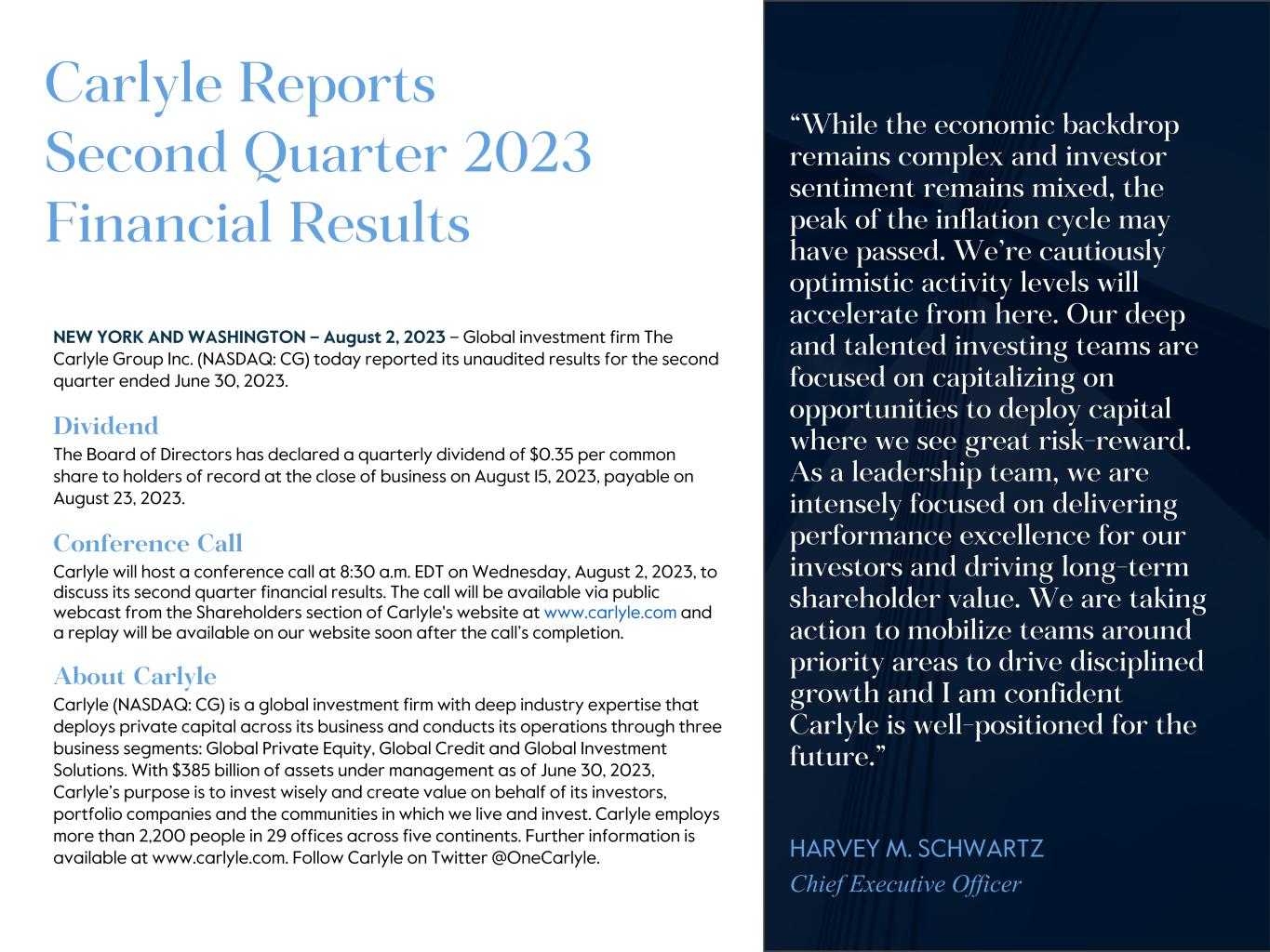 Carlyle Reports Second Quarter 2023 Financial Results NEW YORK AND WASHINGTON – August 2, 2023 – Global investment firm The Carlyle Group Inc. (NASDAQ: CG) today reported its unaudited results for the second quarter ended June 30, 2023. Dividend The Board of Directors has declared a quarterly dividend of $0.35 per common share to holders of record at the close of business on August 15, 2023, payable on August 23, 2023. Conference Call Carlyle will host a conference call at 8:30 a.m. EDT on Wednesday, August 2, 2023, to discuss its second quarter financial results. The call will be available via public webcast from the Shareholders section of Carlyle's website at www.carlyle.com and a replay will be available on our website soon after the call’s completion. About Carlyle Carlyle (NASDAQ: CG) is a global investment firm with deep industry expertise that deploys private capital across its business and conducts its operations through three business segments: Global Private Equity, Global Credit and Global Investment Solutions. With $385 billion of assets under management as of June 30, 2023, Carlyle’s purpose is to invest wisely and create value on behalf of its investors, portfolio companies and the communities in which we live and invest. Carlyle employs more than 2,200 people in 29 offices across five continents. Further information is available at www.carlyle.com. Follow Carlyle on Twitter @OneCarlyle. 2 “While the economic backdrop remains complex and investor sentiment remains mixed, the peak of the inflation cycle may have passed. We’re cautiously optimistic activity levels will accelerate from here. Our deep and talented investing teams are focused on capitalizing on opportunities to deploy capital where we see great risk-reward. As a leadership team, we are intensely focused on delivering performance excellence for our investors and driving long-term shareholder value. We are taking action to mobilize teams around priority areas to drive disciplined growth and I am confident Carlyle is well-positioned for the future.” HARVEY M. SCHWARTZ Chief Executive Officer