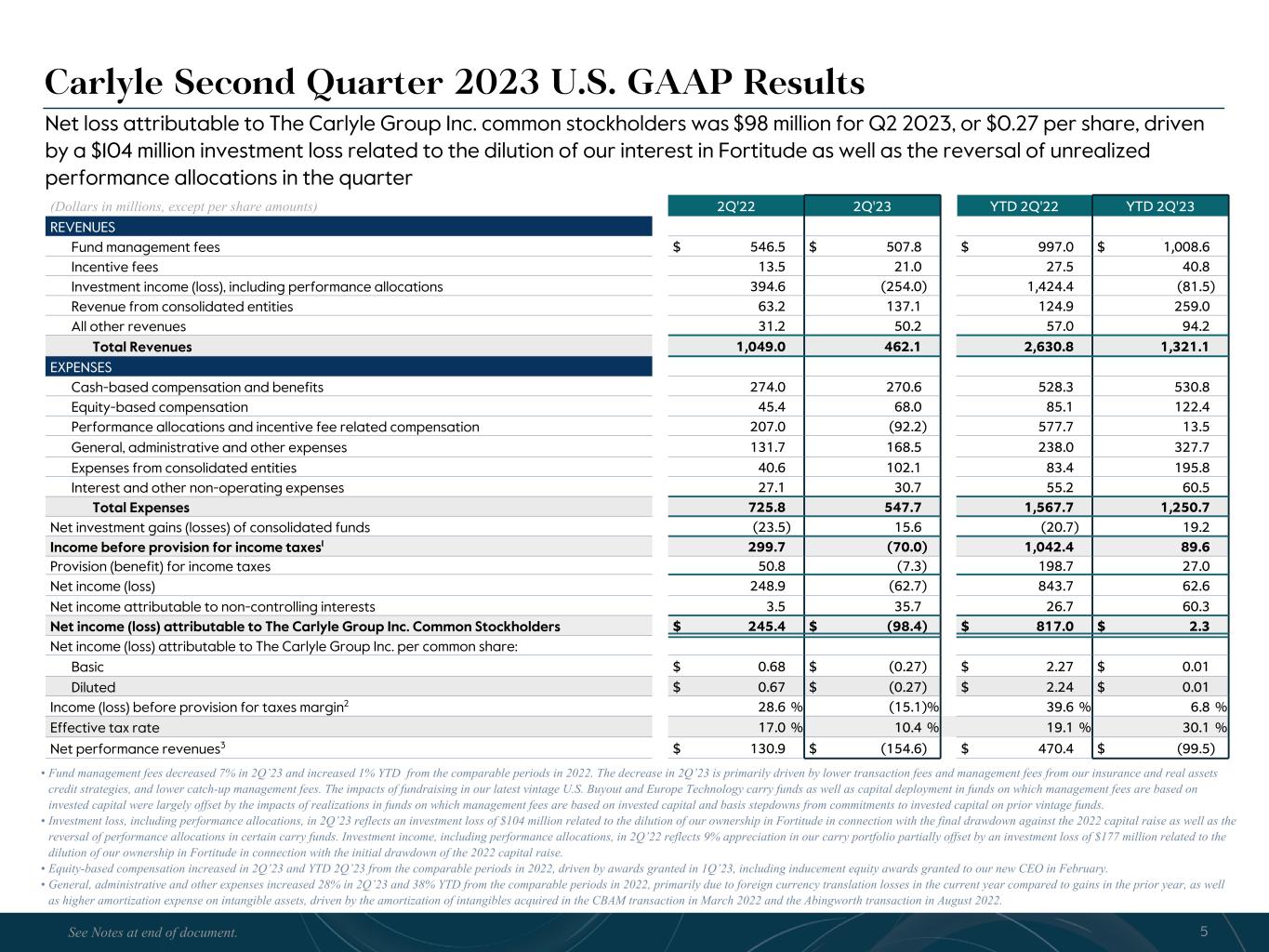 R-14 7 G-19 5 B-19 7 R-88 G-15 9 B-16 5 R-13 6 G-18 0 B-83 R-16 3 G-14 3 B-18 7 R-0 G-74 B-13 6 R-18 5 G-21 1 B-15 3 R-11 8 G-92 B-15 0 R-22 0 G-22 1 B-23 2 R-14 0 G-14 1 B-15 2R-12 0 G-16 9 B-22 2 Old Colors R-88 G-89 B-91 58595B R-23 G-234 B-234 EAEAEA R-208 G-232 B-247 D0E8F7 R-65 G-64 B-66 414042 R-8 G-51 B-94 08335E R-167 G-169 B-171 A7A9AB R-9 G-102 B-112 096670 R-220 G-221 B-222 DCDDDE R-97 G-161 B-224 61A1E0 R-237 G-217 B-157 EDD99D R-147 G-195 B-197 93C3C5 • Fund management fees decreased 7% in 2Q’23 and increased 1% YTD from the comparable periods in 2022. The decrease in 2Q’23 is primarily driven by lower transaction fees and management fees from our insurance and real assets credit strategies, and lower catch-up management fees. The impacts of fundraising in our latest vintage U.S. Buyout and Europe Technology carry funds as well as capital deployment in funds on which management fees are based on invested capital were largely offset by the impacts of realizations in funds on which management fees are based on invested capital and basis stepdowns from commitments to invested capital on prior vintage funds. • Investment loss, including performance allocations, in 2Q’23 reflects an investment loss of $104 million related to the dilution of our ownership in Fortitude in connection with the final drawdown against the 2022 capital raise as well as the reversal of performance allocations in certain carry funds. Investment income, including performance allocations, in 2Q’22 reflects 9% appreciation in our carry portfolio partially offset by an investment loss of $177 million related to the dilution of our ownership in Fortitude in connection with the initial drawdown of the 2022 capital raise. • Equity-based compensation increased in 2Q’23 and YTD 2Q’23 from the comparable periods in 2022, driven by awards granted in 1Q’23, including inducement equity awards granted to our new CEO in February. • General, administrative and other expenses increased 28% in 2Q’23 and 38% YTD from the comparable periods in 2022, primarily due to foreign currency translation losses in the current year compared to gains in the prior year, as well as higher amortization expense on intangible assets, driven by the amortization of intangibles acquired in the CBAM transaction in March 2022 and the Abingworth transaction in August 2022. (Dollars in millions, except per share amounts) 2Q'22 2Q'23 YTD 2Q'22 YTD 2Q'23 REVENUES Fund management fees $ 546.5 $ 507.8 $ 997.0 $ 1,008.6 Incentive fees 13.5 21.0 27.5 40.8 Investment income (loss), including performance allocations 394.6 (254.0) 1,424.4 (81.5) Revenue from consolidated entities 63.2 137.1 124.9 259.0 All other revenues 31.2 50.2 57.0 94.2 Total Revenues 1,049.0 462.1 2,630.8 1,321.1 EXPENSES Cash-based compensation and benefits 274.0 270.6 528.3 530.8 Equity-based compensation 45.4 68.0 85.1 122.4 Performance allocations and incentive fee related compensation 207.0 (92.2) 577.7 13.5 General, administrative and other expenses 131.7 168.5 238.0 327.7 Expenses from consolidated entities 40.6 102.1 83.4 195.8 Interest and other non-operating expenses 27.1 30.7 55.2 60.5 Total Expenses 725.8 547.7 1,567.7 1,250.7 Net investment gains (losses) of consolidated funds (23.5) 15.6 (20.7) 19.2 Income before provision for income taxes1 299.7 (70.0) 1,042.4 89.6 Provision (benefit) for income taxes 50.8 (7.3) 198.7 27.0 Net income (loss) 248.9 (62.7) 843.7 62.6 Net income attributable to non-controlling interests 3.5 35.7 26.7 60.3 Net income (loss) attributable to The Carlyle Group Inc. Common Stockholders $ 245.4 $ (98.4) $ 817.0 $ 2.3 Net income (loss) attributable to The Carlyle Group Inc. per common share: Basic $ 0.68 $ (0.27) $ 2.27 $ 0.01 Diluted $ 0.67 $ (0.27) $ 2.24 $ 0.01 Income (loss) before provision for taxes margin2 28.6 % (15.1) % 39.6 % 6.8 % Effective tax rate 17.0 % 10.4 % 19.1 % 30.1 % Net performance revenues3 $ 130.9 $ (154.6) $ 470.4 $ (99.5) Carlyle Second Quarter 2023 U.S. GAAP Results Net loss attributable to The Carlyle Group Inc. common stockholders was $98 million for Q2 2023, or $0.27 per share, driven by a $104 million investment loss related to the dilution of our interest in Fortitude as well as the reversal of unrealized performance allocations in the quarter 5See Notes at end of document.