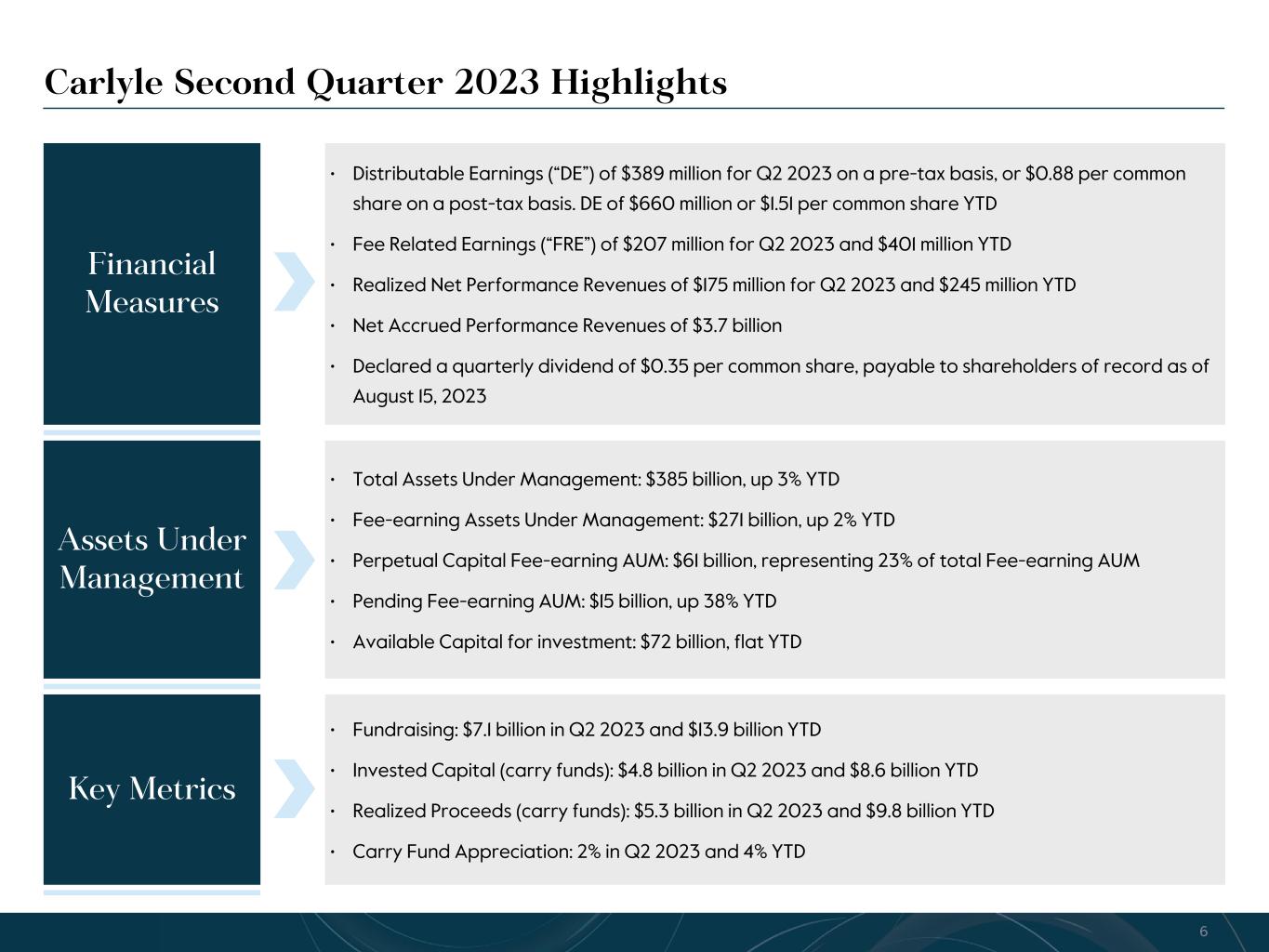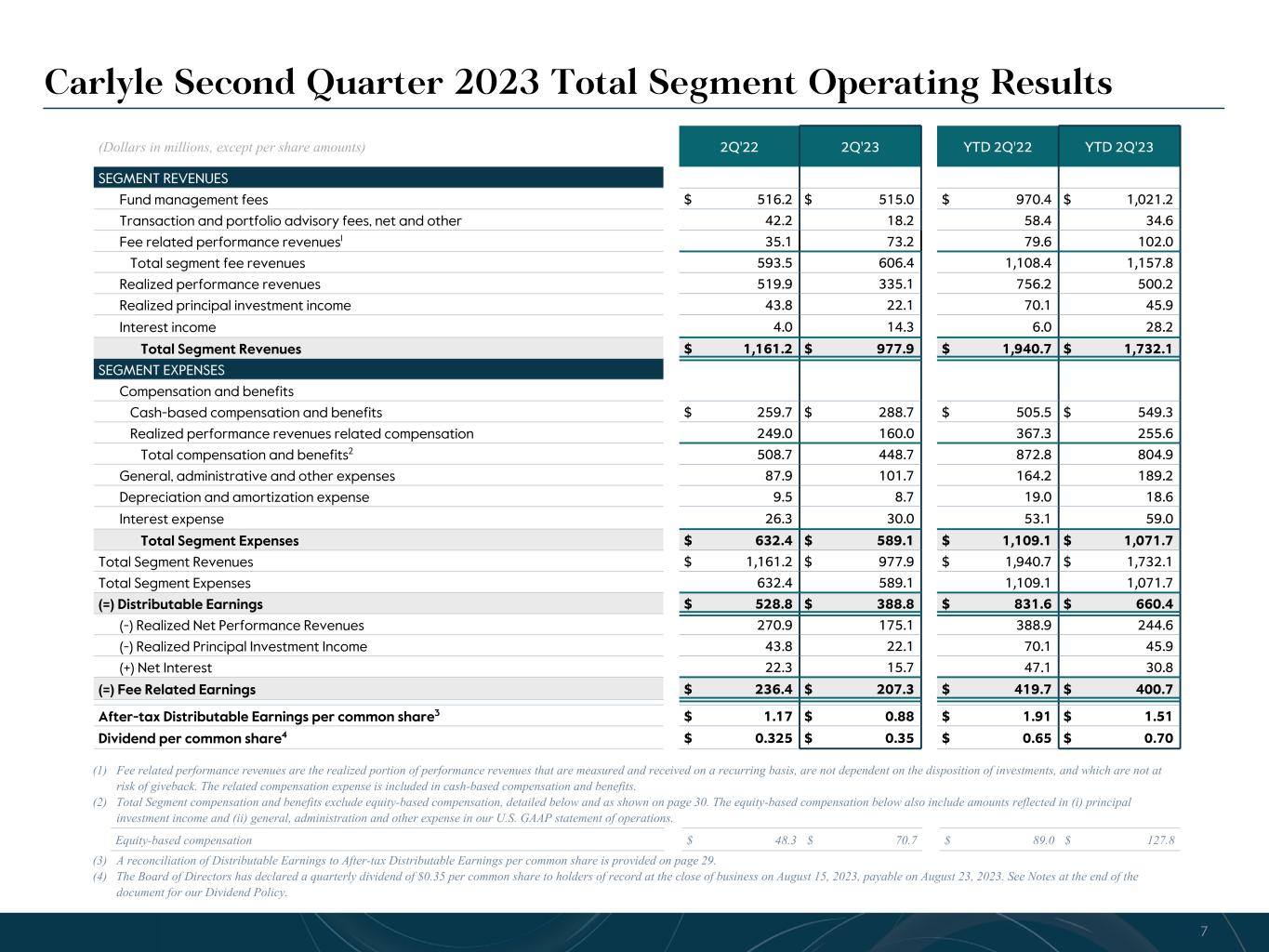 R-14 7 G-19 5 B-19 7 R-88 G-15 9 B-16 5 R-13 6 G-18 0 B-83 R-16 3 G-14 3 B-18 7 R-0 G-74 B-13 6 R-18 5 G-21 1 B-15 3 R-11 8 G-92 B-15 0 R-22 0 G-22 1 B-23 2 R-14 0 G-14 1 B-15 2R-12 0 G-16 9 B-22 2 Old Colors R-88 G-89 B-91 58595B R-23 G-234 B-234 EAEAEA R-208 G-232 B-247 D0E8F7 R-65 G-64 B-66 414042 R-8 G-51 B-94 08335E R-167 G-169 B-171 A7A9AB R-9 G-102 B-112 096670 R-220 G-221 B-222 DCDDDE R-97 G-161 B-224 61A1E0 R-237 G-217 B-157 EDD99D R-147 G-195 B-197 93C3C5 (1) Fee related performance revenues are the realized portion of performance revenues that are measured and received on a recurring basis, are not dependent on the disposition of investments, and which are not at risk of giveback. The related compensation expense is included in cash-based compensation and benefits. (2) Total Segment compensation and benefits exclude equity-based compensation, detailed below and as shown on page 30. The equity-based compensation below also include amounts reflected in (i) principal investment income and (ii) general, administration and other expense in our U.S. GAAP statement of operations. (3) A reconciliation of Distributable Earnings to After-tax Distributable Earnings per common share is provided on page 29. (4) The Board of Directors has declared a quarterly dividend of $0.35 per common share to holders of record at the close of business on August 15, 2023, payable on August 23, 2023. See Notes at the end of the document for our Dividend Policy. Carlyle Second Quarter 2023 Total Segment Operating Results (Dollars in millions, except per share amounts) 2Q'22 2Q'23 YTD 2Q'22 YTD 2Q'23 SEGMENT REVENUES Fund management fees $ 516.2 $ 515.0 $ 970.4 $ 1,021.2 Transaction and portfolio advisory fees, net and other 42.2 18.2 58.4 34.6 Fee related performance revenues1 35.1 73.2 79.6 102.0 Total segment fee revenues 593.5 606.4 1,108.4 1,157.8 Realized performance revenues 519.9 335.1 756.2 500.2 Realized principal investment income 43.8 22.1 70.1 45.9 Interest income 4.0 14.3 6.0 28.2 Total Segment Revenues $ 1,161.2 $ 977.9 $ 1,940.7 $ 1,732.1 SEGMENT EXPENSES Compensation and benefits Cash-based compensation and benefits $ 259.7 $ 288.7 $ 505.5 $ 549.3 Realized performance revenues related compensation 249.0 160.0 367.3 255.6 Total compensation and benefits2 508.7 448.7 872.8 804.9 General, administrative and other expenses 87.9 101.7 164.2 189.2 Depreciation and amortization expense 9.5 8.7 19.0 18.6 Interest expense 26.3 30.0 53.1 59.0 Total Segment Expenses $ 632.4 $ 589.1 $ 1,109.1 $ 1,071.7 Total Segment Revenues $ 1,161.2 $ 977.9 $ 1,940.7 $ 1,732.1 Total Segment Expenses 632.4 589.1 1,109.1 1,071.7 (=) Distributable Earnings $ 528.8 $ 388.8 $ 831.6 $ 660.4 (-) Realized Net Performance Revenues 270.9 175.1 388.9 244.6 (-) Realized Principal Investment Income 43.8 22.1 70.1 45.9 (+) Net Interest 22.3 15.7 47.1 30.8 (=) Fee Related Earnings $ 236.4 $ 207.3 $ 419.7 $ 400.7 After-tax Distributable Earnings per common share3 $ 1.17 $ 0.88 $ 1.91 $ 1.51 Dividend per common share4 $ 0.325 $ 0.35 $ 0.65 $ 0.70 Equity-based compensation $ 48.3 $ 70.7 $ 89.0 $ 127.8 7