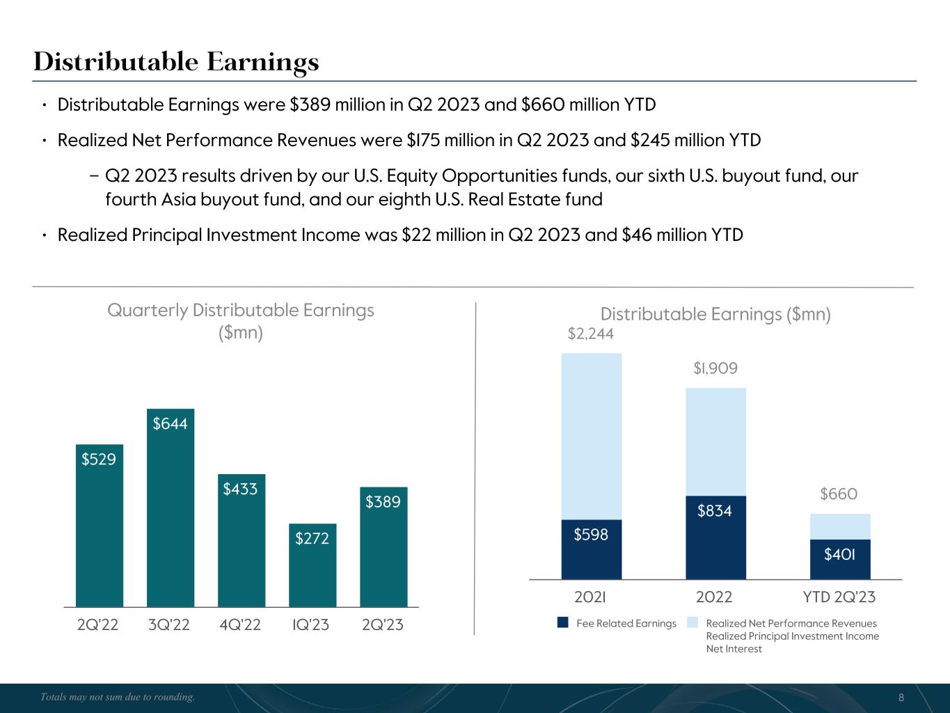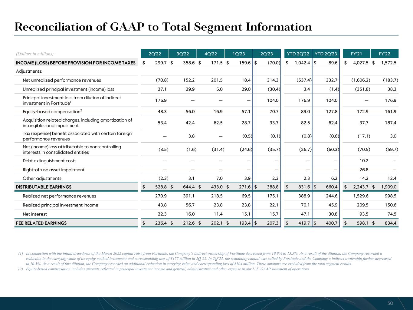 R-14 7 G-19 5 B-19 7 R-88 G-15 9 B-16 5 R-13 6 G-18 0 B-83 R-16 3 G-14 3 B-18 7 R-0 G-74 B-13 6 R-18 5 G-21 1 B-15 3 R-11 8 G-92 B-15 0 R-22 0 G-22 1 B-23 2 R-14 0 G-14 1 B-15 2R-12 0 G-16 9 B-22 2 Old Colors R-88 G-89 B-91 58595B R-23 G-234 B-234 EAEAEA R-208 G-232 B-247 D0E8F7 R-65 G-64 B-66 414042 R-8 G-51 B-94 08335E R-167 G-169 B-171 A7A9AB R-9 G-102 B-112 096670 R-220 G-221 B-222 DCDDDE R-97 G-161 B-224 61A1E0 R-237 G-217 B-157 EDD99D R-147 G-195 B-197 93C3C5 Reconciliation of GAAP to Total Segment Information (1) In connection with the initial drawdown of the March 2022 capital raise from Fortitude, the Company’s indirect ownership of Fortitude decreased from 19.9% to 13.5%. As a result of the dilution, the Company recorded a reduction in the carrying value of its equity method investment and corresponding loss of $177 million in 2Q’22. In 2Q’23, the remaining capital was called by Fortitude and the Company’s indirect ownership further decreased to 10.5%. As a result of this dilution, the Company recorded an additional reduction in carrying value and corresponding loss of $104 million. These amounts are excluded from the total segment results. (2) Equity-based compensation includes amounts reflected in principal investment income and general, administrative and other expense in our U.S. GAAP statement of operations. (Dollars in millions) 2Q'22 3Q'22 4Q'22 1Q'23 2Q'23 YTD 2Q'22 YTD 2Q'23 FY'21 FY'22 INCOME (LOSS) BEFORE PROVISION FOR INCOME TAXES $ 299.7 $ 358.6 $ 171.5 $ 159.6 $ (70.0) $ 1,042.4 $ 89.6 $ 4,027.5 $ 1,572.5 Adjustments: Net unrealized performance revenues (70.8) 152.2 201.5 18.4 314.3 (537.4) 332.7 (1,606.2) (183.7) Unrealized principal investment (income) loss 27.1 29.9 5.0 29.0 (30.4) 3.4 (1.4) (351.8) 38.3 Prinicpal investment loss from dilution of indirect investment in Fortitude1 176.9 — — — 104.0 176.9 104.0 — 176.9 Equity-based compensation2 48.3 56.0 16.9 57.1 70.7 89.0 127.8 172.9 161.9 Acquisition related charges, including amortization of intangibles and impairment 53.4 42.4 62.5 28.7 33.7 82.5 62.4 37.7 187.4 Tax (expense) benefit associated with certain foreign performance revenues — 3.8 — (0.5) (0.1) (0.8) (0.6) (17.1) 3.0 Net (income) loss attributable to non-controlling interests in consolidated entities (3.5) (1.6) (31.4) (24.6) (35.7) (26.7) (60.3) (70.5) (59.7) Debt extinguishment costs — — — — — — — 10.2 — Right-of-use asset impairment — — — — — — — 26.8 — Other adjustments (2.3) 3.1 7.0 3.9 2.3 2.3 6.2 14.2 12.4 DISTRIBUTABLE EARNINGS $ 528.8 $ 644.4 $ 433.0 $ 271.6 $ 388.8 $ 831.6 $ 660.4 $ 2,243.7 $ 1,909.0 Realized net performance revenues 270.9 391.1 218.5 69.5 175.1 388.9 244.6 1,529.6 998.5 Realized principal investment income 43.8 56.7 23.8 23.8 22.1 70.1 45.9 209.5 150.6 Net interest 22.3 16.0 11.4 15.1 15.7 47.1 30.8 93.5 74.5 FEE RELATED EARNINGS $ 236.4 $ 212.6 $ 202.1 $ 193.4 $ 207.3 $ 419.7 $ 400.7 $ 598.1 $ 834.4 30