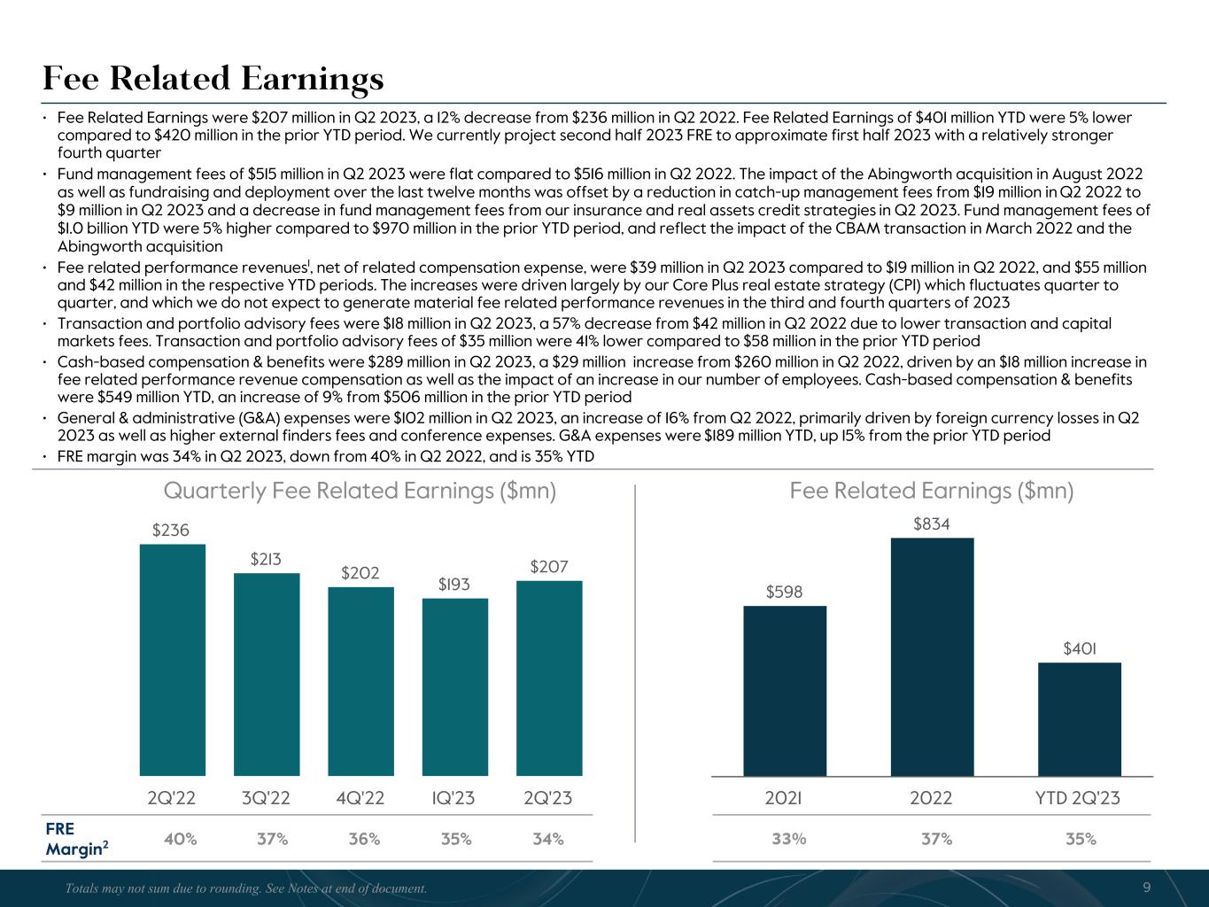 R-14 7 G-19 5 B-19 7 R-88 G-15 9 B-16 5 R-13 6 G-18 0 B-83 R-16 3 G-14 3 B-18 7 R-0 G-74 B-13 6 R-18 5 G-21 1 B-15 3 R-11 8 G-92 B-15 0 R-22 0 G-22 1 B-23 2 R-14 0 G-14 1 B-15 2R-12 0 G-16 9 B-22 2 Old Colors R-88 G-89 B-91 58595B R-23 G-234 B-234 EAEAEA R-208 G-232 B-247 D0E8F7 R-65 G-64 B-66 414042 R-8 G-51 B-94 08335E R-167 G-169 B-171 A7A9AB R-9 G-102 B-112 096670 R-220 G-221 B-222 DCDDDE R-97 G-161 B-224 61A1E0 R-237 G-217 B-157 EDD99D R-147 G-195 B-197 93C3C5 Fee Related Earnings • Fee Related Earnings were $207 million in Q2 2023, a 12% decrease from $236 million in Q2 2022. Fee Related Earnings of $401 million YTD were 5% lower compared to $420 million in the prior YTD period. We currently project second half 2023 FRE to approximate first half 2023 with a relatively stronger fourth quarter • Fund management fees of $515 million in Q2 2023 were flat compared to $516 million in Q2 2022. The impact of the Abingworth acquisition in August 2022 as well as fundraising and deployment over the last twelve months was offset by a reduction in catch-up management fees from $19 million in Q2 2022 to $9 million in Q2 2023 and a decrease in fund management fees from our insurance and real assets credit strategies in Q2 2023. Fund management fees of $1.0 billion YTD were 5% higher compared to $970 million in the prior YTD period, and reflect the impact of the CBAM transaction in March 2022 and the Abingworth acquisition • Fee related performance revenues1, net of related compensation expense, were $39 million in Q2 2023 compared to $19 million in Q2 2022, and $55 million and $42 million in the respective YTD periods. The increases were driven largely by our Core Plus real estate strategy (CPI) which fluctuates quarter to quarter, and which we do not expect to generate material fee related performance revenues in the third and fourth quarters of 2023 • Transaction and portfolio advisory fees were $18 million in Q2 2023, a 57% decrease from $42 million in Q2 2022 due to lower transaction and capital markets fees. Transaction and portfolio advisory fees of $35 million were 41% lower compared to $58 million in the prior YTD period • Cash-based compensation & benefits were $289 million in Q2 2023, a $29 million increase from $260 million in Q2 2022, driven by an $18 million increase in fee related performance revenue compensation as well as the impact of an increase in our number of employees. Cash-based compensation & benefits were $549 million YTD, an increase of 9% from $506 million in the prior YTD period • General & administrative (G&A) expenses were $102 million in Q2 2023, an increase of 16% from Q2 2022, primarily driven by foreign currency losses in Q2 2023 as well as higher external finders fees and conference expenses. G&A expenses were $189 million YTD, up 15% from the prior YTD period • FRE margin was 34% in Q2 2023, down from 40% in Q2 2022, and is 35% YTD Quarterly Fee Related Earnings ($mn) $236 $213 $202 $193 $207 2Q'22 3Q'22 4Q'22 1Q'23 2Q'23 Fee Related Earnings ($mn) $598 $834 $401 2021 2022 YTD 2Q'23 FRE Margin2 40% 37% 36% 35% 34% 33% 37% 35% 9Totals may not sum due to rounding. See Notes at end of document.