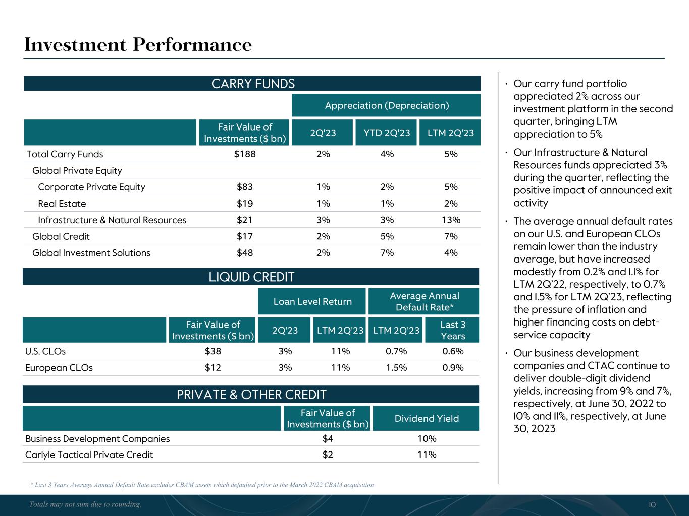 R-14 7 G-19 5 B-19 7 R-88 G-15 9 B-16 5 R-13 6 G-18 0 B-83 R-16 3 G-14 3 B-18 7 R-0 G-74 B-13 6 R-18 5 G-21 1 B-15 3 R-11 8 G-92 B-15 0 R-22 0 G-22 1 B-23 2 R-14 0 G-14 1 B-15 2R-12 0 G-16 9 B-22 2 Old Colors R-88 G-89 B-91 58595B R-23 G-234 B-234 EAEAEA R-208 G-232 B-247 D0E8F7 R-65 G-64 B-66 414042 R-8 G-51 B-94 08335E R-167 G-169 B-171 A7A9AB R-9 G-102 B-112 096670 R-220 G-221 B-222 DCDDDE R-97 G-161 B-224 61A1E0 R-237 G-217 B-157 EDD99D R-147 G-195 B-197 93C3C5 Investment Performance • Our carry fund portfolio appreciated 2% across our investment platform in the second quarter, bringing LTM appreciation to 5% • Our Infrastructure & Natural Resources funds appreciated 3% during the quarter, reflecting the positive impact of announced exit activity • The average annual default rates on our U.S. and European CLOs remain lower than the industry average, but have increased modestly from 0.2% and 1.1% for LTM 2Q’22, respectively, to 0.7% and 1.5% for LTM 2Q’23, reflecting the pressure of inflation and higher financing costs on debt- service capacity • Our business development companies and CTAC continue to deliver double-digit dividend yields, increasing from 9% and 7%, respectively, at June 30, 2022 to 10% and 11%, respectively, at June 30, 2023 10Totals may not sum due to rounding. LIQUID CREDIT Loan Level Return Average Annual Default Rate* Fair Value of Investments ($ bn) 2Q'23 LTM 2Q'23 LTM 2Q'23 Last 3 Years U.S. CLOs $38 3% 11% 0.7% 0.6% European CLOs $12 3% 11% 1.5% 0.9% CARRY FUNDS Appreciation (Depreciation) Fair Value of Investments ($ bn) 2Q'23 YTD 2Q'23 LTM 2Q'23 Total Carry Funds $188 2% 4% 5% Global Private Equity Corporate Private Equity $83 1% 2% 5% Real Estate $19 1% 1% 2% Infrastructure & Natural Resources $21 3% 3% 13% Global Credit $17 2% 5% 7% Global Investment Solutions $48 2% 7% 4% PRIVATE & OTHER CREDIT Fair Value of Investments ($ bn) Dividend Yield Business Development Companies $4 10% Carlyle Tactical Private Credit $2 11% * Last 3 Years Average Annual Default Rate excludes CBAM assets which defaulted prior to the March 2022 CBAM acquisition