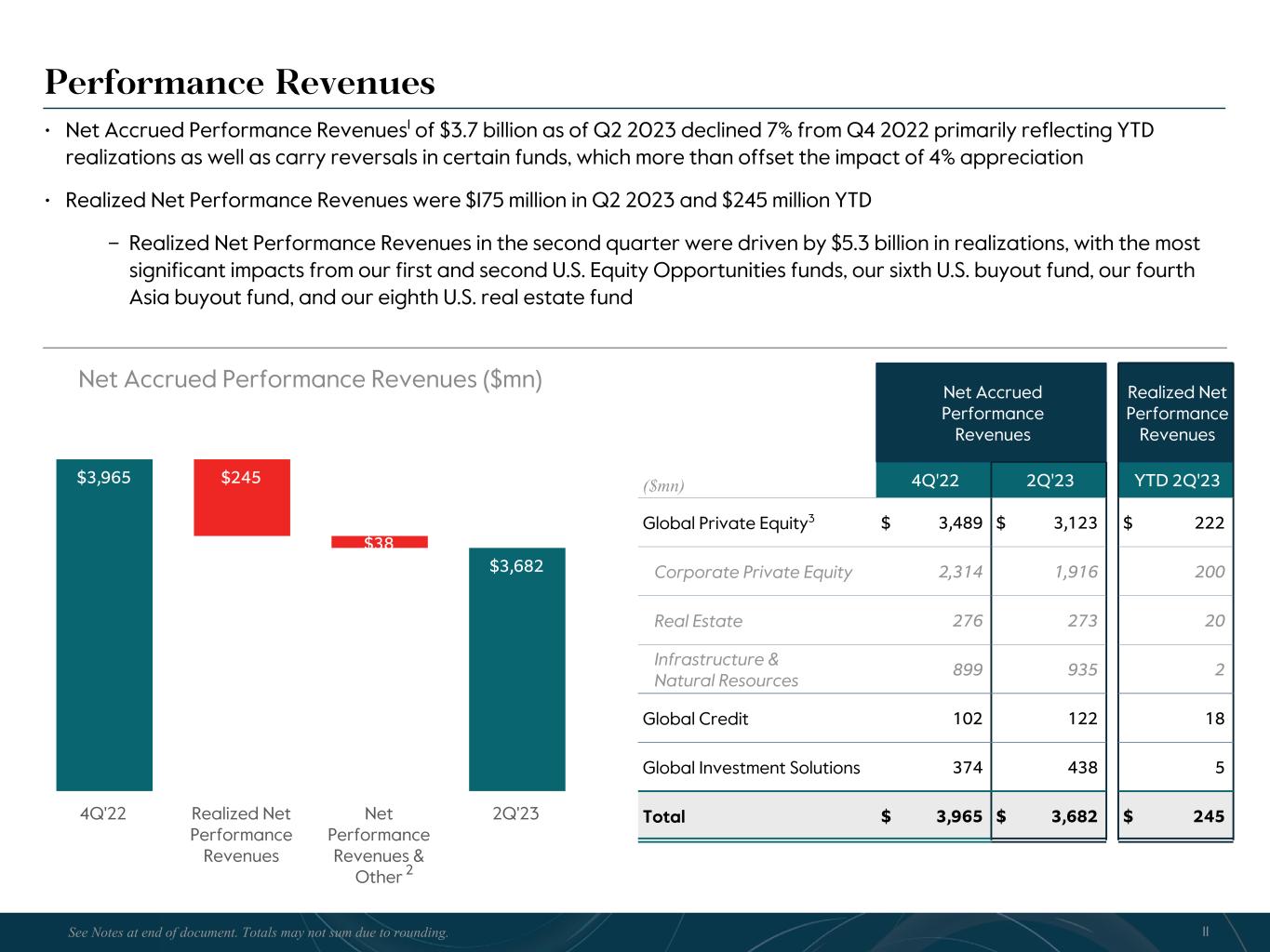 R-14 7 G-19 5 B-19 7 R-88 G-15 9 B-16 5 R-13 6 G-18 0 B-83 R-16 3 G-14 3 B-18 7 R-0 G-74 B-13 6 R-18 5 G-21 1 B-15 3 R-11 8 G-92 B-15 0 R-22 0 G-22 1 B-23 2 R-14 0 G-14 1 B-15 2R-12 0 G-16 9 B-22 2 Old Colors R-88 G-89 B-91 58595B R-23 G-234 B-234 EAEAEA R-208 G-232 B-247 D0E8F7 R-65 G-64 B-66 414042 R-8 G-51 B-94 08335E R-167 G-169 B-171 A7A9AB R-9 G-102 B-112 096670 R-220 G-221 B-222 DCDDDE R-97 G-161 B-224 61A1E0 R-237 G-217 B-157 EDD99D R-147 G-195 B-197 93C3C5 Performance Revenues • Net Accrued Performance Revenues1 of $3.7 billion as of Q2 2023 declined 7% from Q4 2022 primarily reflecting YTD realizations as well as carry reversals in certain funds, which more than offset the impact of 4% appreciation • Realized Net Performance Revenues were $175 million in Q2 2023 and $245 million YTD – Realized Net Performance Revenues in the second quarter were driven by $5.3 billion in realizations, with the most significant impacts from our first and second U.S. Equity Opportunities funds, our sixth U.S. buyout fund, our fourth Asia buyout fund, and our eighth U.S. real estate fund Net Accrued Performance Revenues ($mn) $3,965 $3,720 $3,682 $3,682 $245 $38 4Q'22 Realized Net Performance Revenues Net Performance Revenues & Other 2Q'23 2 Net Accrued Performance Revenues Realized Net Performance Revenues ($mn) 4Q'22 2Q'23 YTD 2Q'23 Global Private Equity3 $ 3,489 $ 3,123 $ 222 Corporate Private Equity 2,314 1,916 200 Real Estate 276 273 20 Infrastructure & Natural Resources 899 935 2 Global Credit 102 122 18 Global Investment Solutions 374 438 5 Total $ 3,965 $ 3,682 $ 245 11See Notes at end of document. Totals may not sum due to rounding.
