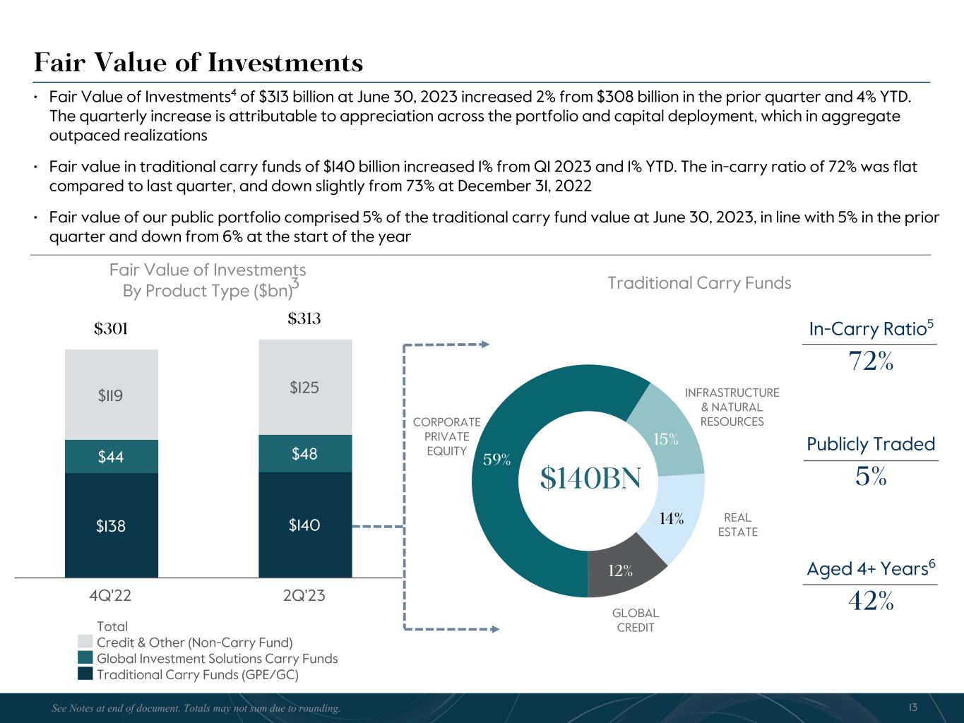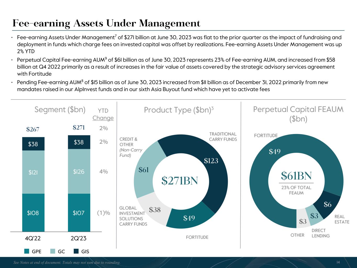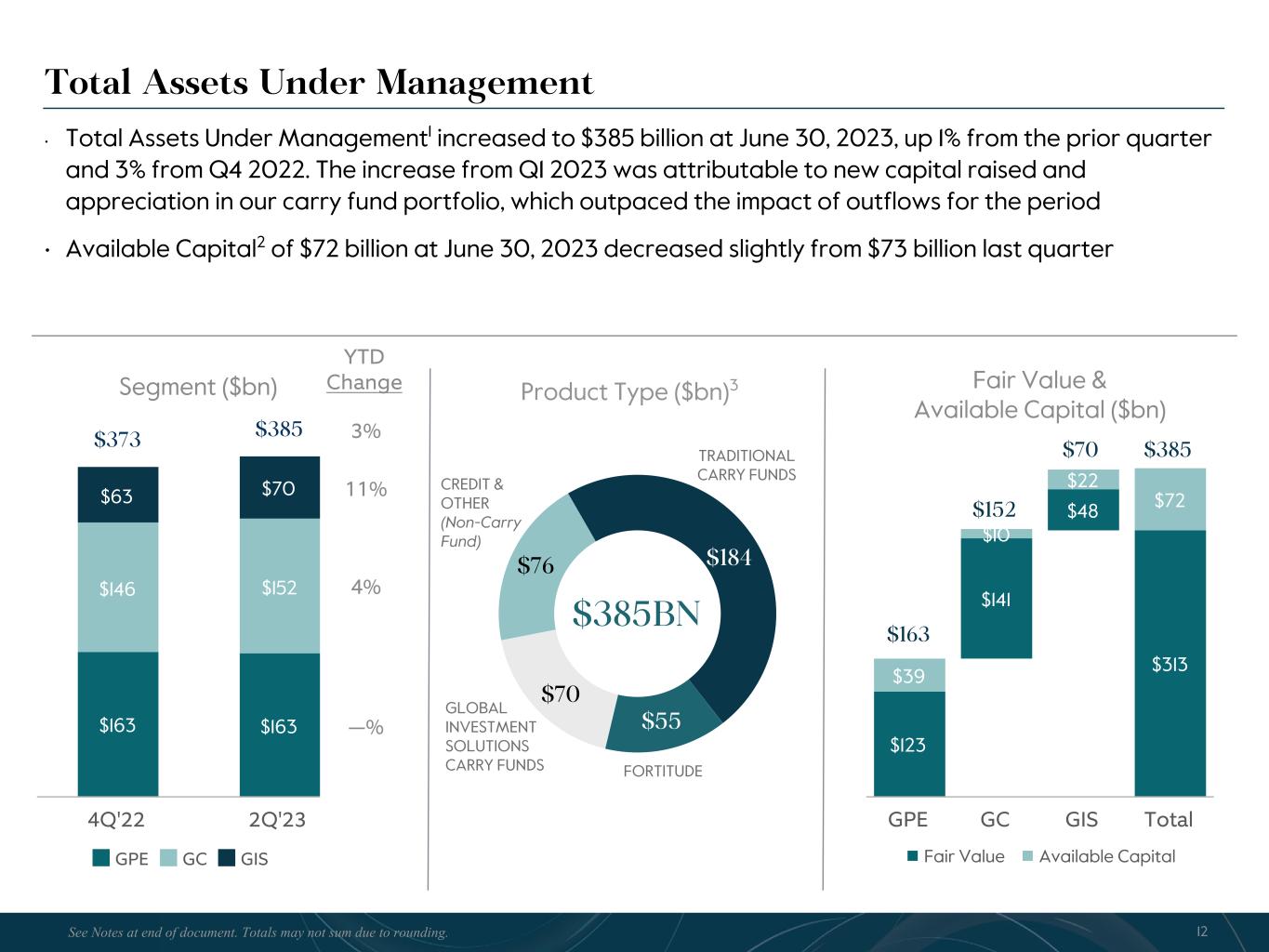 R-14 7 G-19 5 B-19 7 R-88 G-15 9 B-16 5 R-13 6 G-18 0 B-83 R-16 3 G-14 3 B-18 7 R-0 G-74 B-13 6 R-18 5 G-21 1 B-15 3 R-11 8 G-92 B-15 0 R-22 0 G-22 1 B-23 2 R-14 0 G-14 1 B-15 2R-12 0 G-16 9 B-22 2 Old Colors R-88 G-89 B-91 58595B R-23 G-234 B-234 EAEAEA R-208 G-232 B-247 D0E8F7 R-65 G-64 B-66 414042 R-8 G-51 B-94 08335E R-167 G-169 B-171 A7A9AB R-9 G-102 B-112 096670 R-220 G-221 B-222 DCDDDE R-97 G-161 B-224 61A1E0 R-237 G-217 B-157 EDD99D R-147 G-195 B-197 93C3C5 $184 $55 $70 $76 • Total Assets Under Management1 increased to $385 billion at June 30, 2023, up 1% from the prior quarter and 3% from Q4 2022. The increase from Q1 2023 was attributable to new capital raised and appreciation in our carry fund portfolio, which outpaced the impact of outflows for the period • Available Capital2 of $72 billion at June 30, 2023 decreased slightly from $73 billion last quarter Fair Value & Available Capital ($bn) $123 $141 $48 $313$39 $10 $22 $72 GPE GC GIS Total Total Assets Under Management n Fair Value n Available Capital 12See Notes at end of document. Totals may not sum due to rounding. Segment ($bn) $163 $163 $146 $152 $63 $70 $373 $385 GPE GC GIS 4Q'22 2Q'23 YTD Change 3% 11% 4% —% $385BN TRADITIONAL CARRY FUNDS GLOBAL INVESTMENT SOLUTIONS CARRY FUNDS CREDIT & OTHER (Non-Carry Fund) Product Type ($bn)3 $163 $152 $70 $385 FORTITUDE