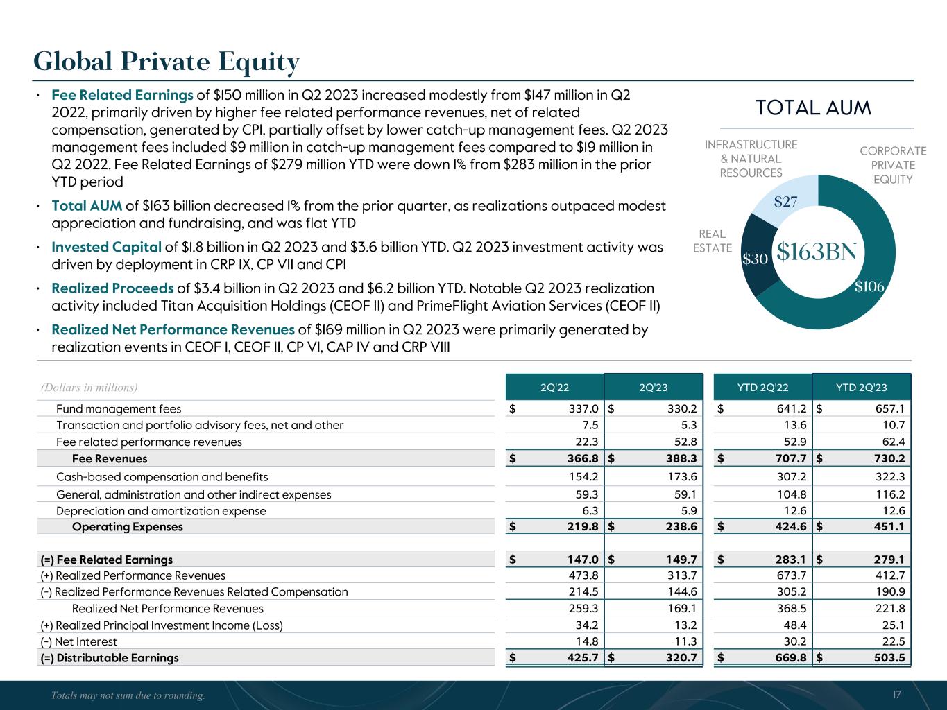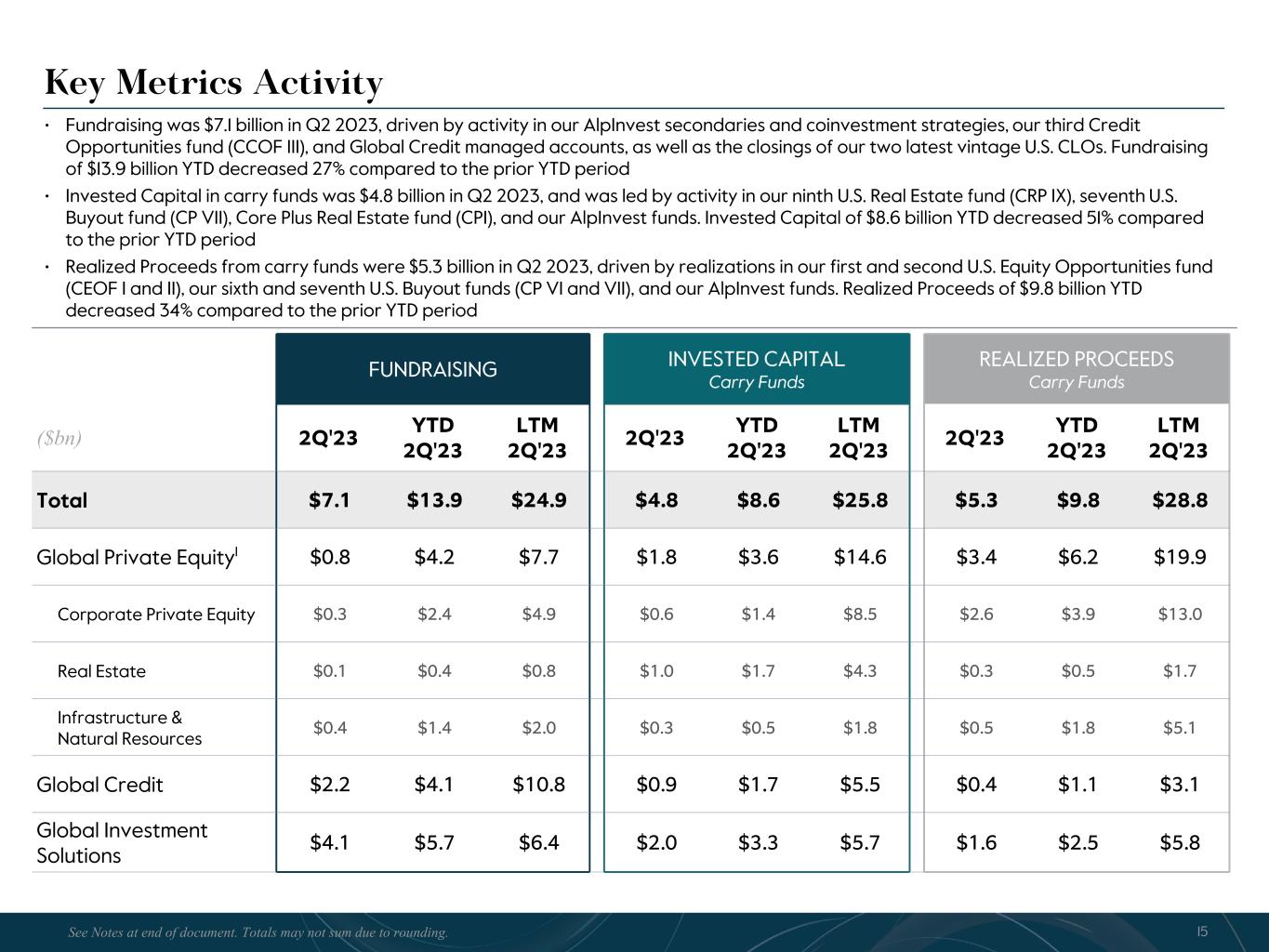 R-14 7 G-19 5 B-19 7 R-88 G-15 9 B-16 5 R-13 6 G-18 0 B-83 R-16 3 G-14 3 B-18 7 R-0 G-74 B-13 6 R-18 5 G-21 1 B-15 3 R-11 8 G-92 B-15 0 R-22 0 G-22 1 B-23 2 R-14 0 G-14 1 B-15 2R-12 0 G-16 9 B-22 2 Old Colors R-88 G-89 B-91 58595B R-23 G-234 B-234 EAEAEA R-208 G-232 B-247 D0E8F7 R-65 G-64 B-66 414042 R-8 G-51 B-94 08335E R-167 G-169 B-171 A7A9AB R-9 G-102 B-112 096670 R-220 G-221 B-222 DCDDDE R-97 G-161 B-224 61A1E0 R-237 G-217 B-157 EDD99D R-147 G-195 B-197 93C3C5 Key Metrics Activity • Fundraising was $7.1 billion in Q2 2023, driven by activity in our AlpInvest secondaries and coinvestment strategies, our third Credit Opportunities fund (CCOF III), and Global Credit managed accounts, as well as the closings of our two latest vintage U.S. CLOs. Fundraising of $13.9 billion YTD decreased 27% compared to the prior YTD period • Invested Capital in carry funds was $4.8 billion in Q2 2023, and was led by activity in our ninth U.S. Real Estate fund (CRP IX), seventh U.S. Buyout fund (CP VII), Core Plus Real Estate fund (CPI), and our AlpInvest funds. Invested Capital of $8.6 billion YTD decreased 51% compared to the prior YTD period • Realized Proceeds from carry funds were $5.3 billion in Q2 2023, driven by realizations in our first and second U.S. Equity Opportunities fund (CEOF I and II), our sixth and seventh U.S. Buyout funds (CP VI and VII), and our AlpInvest funds. Realized Proceeds of $9.8 billion YTD decreased 34% compared to the prior YTD period FUNDRAISING INVESTED CAPITAL Carry Funds REALIZED PROCEEDS Carry Funds ($bn) 2Q'23 YTD 2Q'23 LTM 2Q'23 2Q'23 YTD 2Q'23 LTM 2Q'23 2Q'23 YTD 2Q'23 LTM 2Q'23 Total $7.1 $13.9 $24.9 $4.8 $8.6 $25.8 $5.3 $9.8 $28.8 Global Private Equity1 $0.8 $4.2 $7.7 $1.8 $3.6 $14.6 $3.4 $6.2 $19.9 Corporate Private Equity $0.3 $2.4 $4.9 $0.6 $1.4 $8.5 $2.6 $3.9 $13.0 Real Estate $0.1 $0.4 $0.8 $1.0 $1.7 $4.3 $0.3 $0.5 $1.7 Infrastructure & Natural Resources $0.4 $1.4 $2.0 $0.3 $0.5 $1.8 $0.5 $1.8 $5.1 Global Credit $2.2 $4.1 $10.8 $0.9 $1.7 $5.5 $0.4 $1.1 $3.1 Global Investment Solutions $4.1 $5.7 $6.4 $2.0 $3.3 $5.7 $1.6 $2.5 $5.8 15See Notes at end of document. Totals may not sum due to rounding.