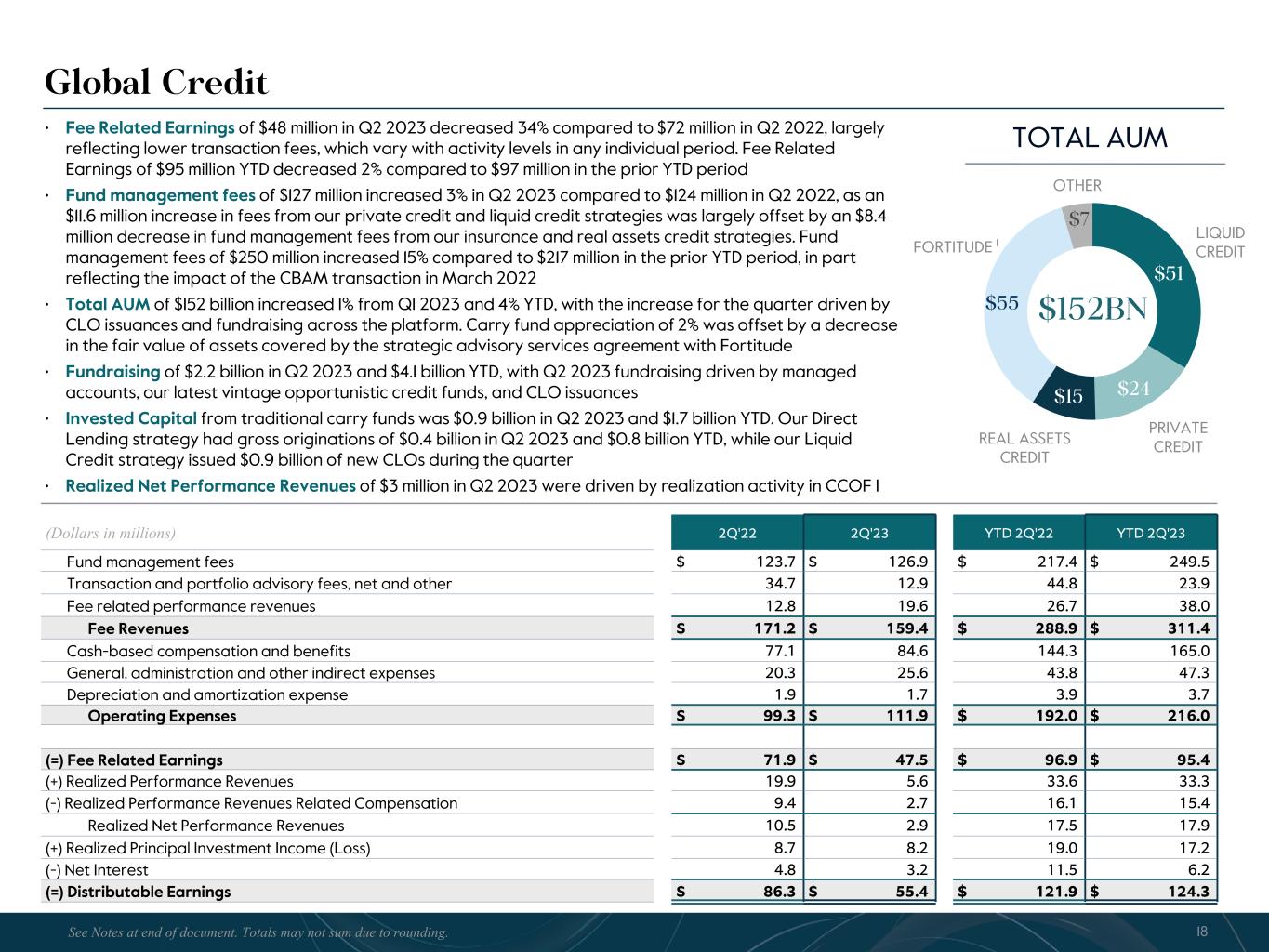R-14 7 G-19 5 B-19 7 R-88 G-15 9 B-16 5 R-13 6 G-18 0 B-83 R-16 3 G-14 3 B-18 7 R-0 G-74 B-13 6 R-18 5 G-21 1 B-15 3 R-11 8 G-92 B-15 0 R-22 0 G-22 1 B-23 2 R-14 0 G-14 1 B-15 2R-12 0 G-16 9 B-22 2 Old Colors R-88 G-89 B-91 58595B R-23 G-234 B-234 EAEAEA R-208 G-232 B-247 D0E8F7 R-65 G-64 B-66 414042 R-8 G-51 B-94 08335E R-167 G-169 B-171 A7A9AB R-9 G-102 B-112 096670 R-220 G-221 B-222 DCDDDE R-97 G-161 B-224 61A1E0 R-237 G-217 B-157 EDD99D R-147 G-195 B-197 93C3C5 Global Credit (Dollars in millions) 2Q'22 2Q'23 YTD 2Q'22 YTD 2Q'23 Fund management fees $ 123.7 $ 126.9 $ 217.4 $ 249.5 Transaction and portfolio advisory fees, net and other 34.7 12.9 44.8 23.9 Fee related performance revenues 12.8 19.6 26.7 38.0 Fee Revenues $ 171.2 $ 159.4 $ 288.9 $ 311.4 Cash-based compensation and benefits 77.1 84.6 144.3 165.0 General, administration and other indirect expenses 20.3 25.6 43.8 47.3 Depreciation and amortization expense 1.9 1.7 3.9 3.7 Operating Expenses $ 99.3 $ 111.9 $ 192.0 $ 216.0 (=) Fee Related Earnings $ 71.9 $ 47.5 $ 96.9 $ 95.4 (+) Realized Performance Revenues 19.9 5.6 33.6 33.3 (-) Realized Performance Revenues Related Compensation 9.4 2.7 16.1 15.4 Realized Net Performance Revenues 10.5 2.9 17.5 17.9 (+) Realized Principal Investment Income (Loss) 8.7 8.2 19.0 17.2 (-) Net Interest 4.8 3.2 11.5 6.2 (=) Distributable Earnings $ 86.3 $ 55.4 $ 121.9 $ 124.3 $51 $24$15 $55 $7 LIQUID CREDIT REAL ASSETS CREDIT $152BN • Fee Related Earnings of $48 million in Q2 2023 decreased 34% compared to $72 million in Q2 2022, largely reflecting lower transaction fees, which vary with activity levels in any individual period. Fee Related Earnings of $95 million YTD decreased 2% compared to $97 million in the prior YTD period • Fund management fees of $127 million increased 3% in Q2 2023 compared to $124 million in Q2 2022, as an $11.6 million increase in fees from our private credit and liquid credit strategies was largely offset by an $8.4 million decrease in fund management fees from our insurance and real assets credit strategies. Fund management fees of $250 million increased 15% compared to $217 million in the prior YTD period, in part reflecting the impact of the CBAM transaction in March 2022 • Total AUM of $152 billion increased 1% from Q1 2023 and 4% YTD, with the increase for the quarter driven by CLO issuances and fundraising across the platform. Carry fund appreciation of 2% was offset by a decrease in the fair value of assets covered by the strategic advisory services agreement with Fortitude • Fundraising of $2.2 billion in Q2 2023 and $4.1 billion YTD, with Q2 2023 fundraising driven by managed accounts, our latest vintage opportunistic credit funds, and CLO issuances • Invested Capital from traditional carry funds was $0.9 billion in Q2 2023 and $1.7 billion YTD. Our Direct Lending strategy had gross originations of $0.4 billion in Q2 2023 and $0.8 billion YTD, while our Liquid Credit strategy issued $0.9 billion of new CLOs during the quarter • Realized Net Performance Revenues of $3 million in Q2 2023 were driven by realization activity in CCOF I OTHER 18 PRIVATE CREDIT TOTAL AUM FORTITUDE 1 See Notes at end of document. Totals may not sum due to rounding.