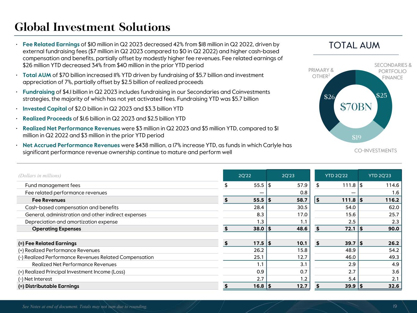 R-14 7 G-19 5 B-19 7 R-88 G-15 9 B-16 5 R-13 6 G-18 0 B-83 R-16 3 G-14 3 B-18 7 R-0 G-74 B-13 6 R-18 5 G-21 1 B-15 3 R-11 8 G-92 B-15 0 R-22 0 G-22 1 B-23 2 R-14 0 G-14 1 B-15 2R-12 0 G-16 9 B-22 2 Old Colors R-88 G-89 B-91 58595B R-23 G-234 B-234 EAEAEA R-208 G-232 B-247 D0E8F7 R-65 G-64 B-66 414042 R-8 G-51 B-94 08335E R-167 G-169 B-171 A7A9AB R-9 G-102 B-112 096670 R-220 G-221 B-222 DCDDDE R-97 G-161 B-224 61A1E0 R-237 G-217 B-157 EDD99D R-147 G-195 B-197 93C3C5 Global Investment Solutions • Fee Related Earnings of $10 million in Q2 2023 decreased 42% from $18 million in Q2 2022, driven by external fundraising fees ($7 million in Q2 2023 compared to $0 in Q2 2022) and higher cash-based compensation and benefits, partially offset by modestly higher fee revenues. Fee related earnings of $26 million YTD decreased 34% from $40 million in the prior YTD period • Total AUM of $70 billion increased 11% YTD driven by fundraising of $5.7 billion and investment appreciation of 7%, partially offset by $2.5 billion of realized proceeds • Fundraising of $4.1 billion in Q2 2023 includes fundraising in our Secondaries and Coinvestments strategies, the majority of which has not yet activated fees. Fundraising YTD was $5.7 billion • Invested Capital of $2.0 billion in Q2 2023 and $3.3 billion YTD • Realized Proceeds of $1.6 billion in Q2 2023 and $2.5 billion YTD • Realized Net Performance Revenues were $3 million in Q2 2023 and $5 million YTD, compared to $1 million in Q2 2022 and $3 million in the prior YTD period • Net Accrued Performance Revenues were $438 million, a 17% increase YTD, as funds in which Carlyle has significant performance revenue ownership continue to mature and perform well (Dollars in millions) 2Q'22 2Q'23 YTD 2Q'22 YTD 2Q'23 Fund management fees $ 55.5 $ 57.9 $ 111.8 $ 114.6 Fee related performance revenues — 0.8 — 1.6 Fee Revenues $ 55.5 $ 58.7 $ 111.8 $ 116.2 Cash-based compensation and benefits 28.4 30.5 54.0 62.0 General, administration and other indirect expenses 8.3 17.0 15.6 25.7 Depreciation and amortization expense 1.3 1.1 2.5 2.3 Operating Expenses $ 38.0 $ 48.6 $ 72.1 $ 90.0 (=) Fee Related Earnings $ 17.5 $ 10.1 $ 39.7 $ 26.2 (+) Realized Performance Revenues 26.2 15.8 48.9 54.2 (-) Realized Performance Revenues Related Compensation 25.1 12.7 46.0 49.3 Realized Net Performance Revenues 1.1 3.1 2.9 4.9 (+) Realized Principal Investment Income (Loss) 0.9 0.7 2.7 3.6 (-) Net Interest 2.7 1.2 5.4 2.1 (=) Distributable Earnings $ 16.8 $ 12.7 $ 39.9 $ 32.6 $25 $19 $26 SECONDARIES & PORTFOLIO FINANCE CO-INVESTMENTS PRIMARY & OTHER2 $70BN 19See Notes at end of document. Totals may not sum due to rounding. TOTAL AUM