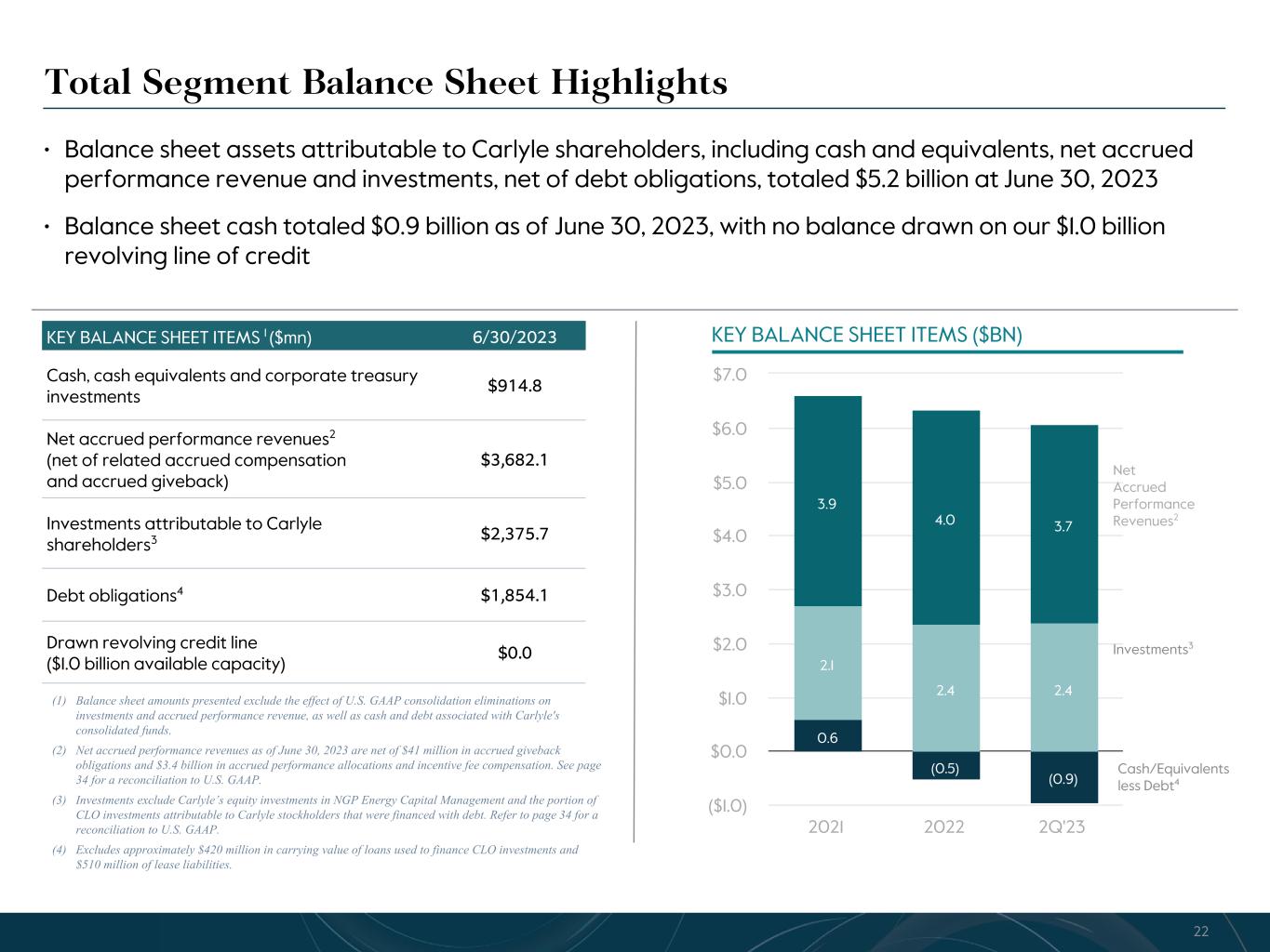 R-14 7 G-19 5 B-19 7 R-88 G-15 9 B-16 5 R-13 6 G-18 0 B-83 R-16 3 G-14 3 B-18 7 R-0 G-74 B-13 6 R-18 5 G-21 1 B-15 3 R-11 8 G-92 B-15 0 R-22 0 G-22 1 B-23 2 R-14 0 G-14 1 B-15 2R-12 0 G-16 9 B-22 2 Old Colors R-88 G-89 B-91 58595B R-23 G-234 B-234 EAEAEA R-208 G-232 B-247 D0E8F7 R-65 G-64 B-66 414042 R-8 G-51 B-94 08335E R-167 G-169 B-171 A7A9AB R-9 G-102 B-112 096670 R-220 G-221 B-222 DCDDDE R-97 G-161 B-224 61A1E0 R-237 G-217 B-157 EDD99D R-147 G-195 B-197 93C3C5 Total Segment Balance Sheet Highlights • Balance sheet assets attributable to Carlyle shareholders, including cash and equivalents, net accrued performance revenue and investments, net of debt obligations, totaled $5.2 billion at June 30, 2023 • Balance sheet cash totaled $0.9 billion as of June 30, 2023, with no balance drawn on our $1.0 billion revolving line of credit KEY BALANCE SHEET ITEMS 1 ($mn) 6/30/2023 Cash, cash equivalents and corporate treasury investments $914.8 Net accrued performance revenues2 (net of related accrued compensation and accrued giveback) $3,682.1 Investments attributable to Carlyle shareholders3 $2,375.7 Debt obligations4 $1,854.1 Drawn revolving credit line ($1.0 billion available capacity) $0.0 (1) Balance sheet amounts presented exclude the effect of U.S. GAAP consolidation eliminations on investments and accrued performance revenue, as well as cash and debt associated with Carlyle's consolidated funds. (2) Net accrued performance revenues as of June 30, 2023 are net of $41 million in accrued giveback obligations and $3.4 billion in accrued performance allocations and incentive fee compensation. See page 34 for a reconciliation to U.S. GAAP. (3) Investments exclude Carlyle’s equity investments in NGP Energy Capital Management and the portion of CLO investments attributable to Carlyle stockholders that were financed with debt. Refer to page 34 for a reconciliation to U.S. GAAP. (4) Excludes approximately $420 million in carrying value of loans used to finance CLO investments and $510 million of lease liabilities. 0.6 (0.5) (0.9) 2.1 2.4 2.4 3.9 4.0 3.7 2021 2022 2Q'23 ($1.0) $0.0 $1.0 $2.0 $3.0 $4.0 $5.0 $6.0 $7.0 KEY BALANCE SHEET ITEMS ($BN) Net Accrued Performance Revenues2 Investments3 Cash/Equivalents less Debt4 22