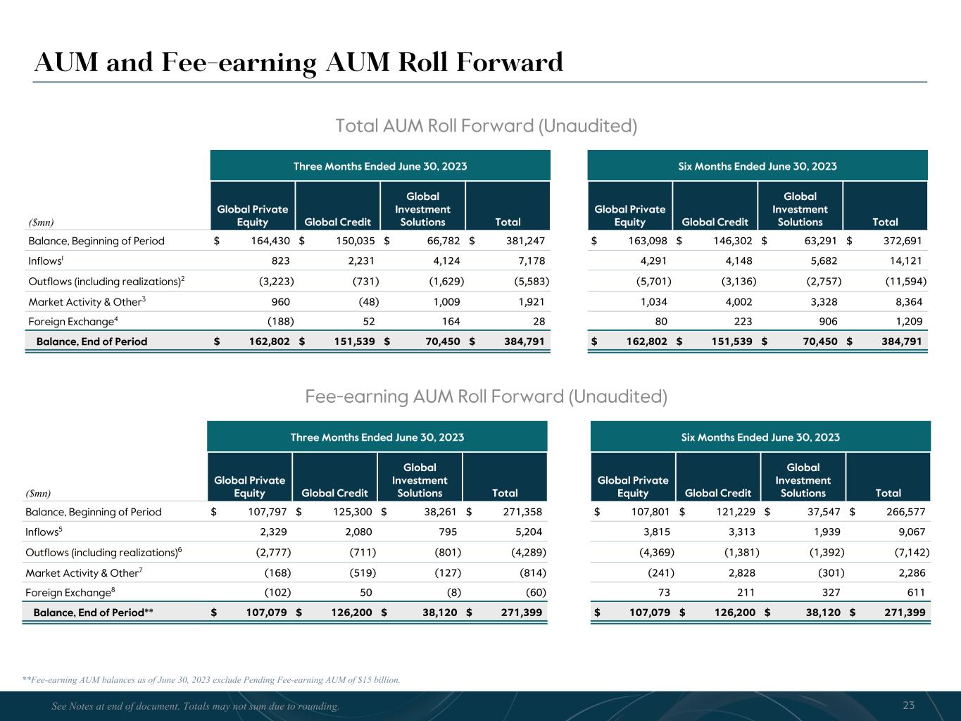 R-14 7 G-19 5 B-19 7 R-88 G-15 9 B-16 5 R-13 6 G-18 0 B-83 R-16 3 G-14 3 B-18 7 R-0 G-74 B-13 6 R-18 5 G-21 1 B-15 3 R-11 8 G-92 B-15 0 R-22 0 G-22 1 B-23 2 R-14 0 G-14 1 B-15 2R-12 0 G-16 9 B-22 2 Old Colors R-88 G-89 B-91 58595B R-23 G-234 B-234 EAEAEA R-208 G-232 B-247 D0E8F7 R-65 G-64 B-66 414042 R-8 G-51 B-94 08335E R-167 G-169 B-171 A7A9AB R-9 G-102 B-112 096670 R-220 G-221 B-222 DCDDDE R-97 G-161 B-224 61A1E0 R-237 G-217 B-157 EDD99D R-147 G-195 B-197 93C3C5 AUM and Fee-earning AUM Roll Forward Total AUM Roll Forward (Unaudited) Three Months Ended June 30, 2023 Six Months Ended June 30, 2023 ($mn) Global Private Equity Global Credit Global Investment Solutions Total Global Private Equity Global Credit Global Investment Solutions Total Balance, Beginning of Period $ 164,430 $ 150,035 $ 66,782 $ 381,247 $ 163,098 $ 146,302 $ 63,291 $ 372,691 Inflows1 823 2,231 4,124 7,178 4,291 4,148 5,682 14,121 Outflows (including realizations)2 (3,223) (731) (1,629) (5,583) (5,701) (3,136) (2,757) (11,594) Market Activity & Other3 960 (48) 1,009 1,921 1,034 4,002 3,328 8,364 Foreign Exchange4 (188) 52 164 28 80 223 906 1,209 Balance, End of Period $ 162,802 $ 151,539 $ 70,450 $ 384,791 $ 162,802 $ 151,539 $ 70,450 $ 384,791 Fee-earning AUM Roll Forward (Unaudited) Three Months Ended June 30, 2023 Six Months Ended June 30, 2023 ($mn) Global Private Equity Global Credit Global Investment Solutions Total Global Private Equity Global Credit Global Investment Solutions Total Balance, Beginning of Period $ 107,797 $ 125,300 $ 38,261 $ 271,358 $ 107,801 $ 121,229 $ 37,547 $ 266,577 Inflows5 2,329 2,080 795 5,204 3,815 3,313 1,939 9,067 Outflows (including realizations)6 (2,777) (711) (801) (4,289) (4,369) (1,381) (1,392) (7,142) Market Activity & Other7 (168) (519) (127) (814) (241) 2,828 (301) 2,286 Foreign Exchange8 (102) 50 (8) (60) 73 211 327 611 Balance, End of Period** $ 107,079 $ 126,200 $ 38,120 $ 271,399 $ 107,079 $ 126,200 $ 38,120 $ 271,399 23See Notes at end of document. Totals may not sum due to rounding. **Fee-earning AUM balances as of June 30, 2023 exclude Pending Fee-earning AUM of $15 billion.
