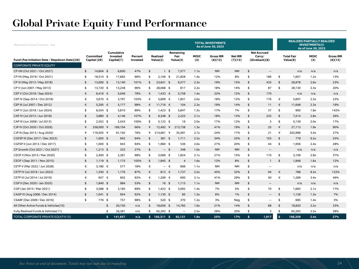 R-14 7 G-19 5 B-19 7 R-88 G-15 9 B-16 5 R-13 6 G-18 0 B-83 R-16 3 G-14 3 B-18 7 R-0 G-74 B-13 6 R-18 5 G-21 1 B-15 3 R-11 8 G-92 B-15 0 R-22 0 G-22 1 B-23 2 R-14 0 G-14 1 B-15 2R-12 0 G-16 9 B-22 2 Old Colors R-88 G-89 B-91 58595B R-23 G-234 B-234 EAEAEA R-208 G-232 B-247 D0E8F7 R-65 G-64 B-66 414042 R-8 G-51 B-94 08335E R-167 G-169 B-171 A7A9AB R-9 G-102 B-112 096670 R-220 G-221 B-222 DCDDDE R-97 G-161 B-224 61A1E0 R-237 G-217 B-157 EDD99D R-147 G-195 B-197 93C3C5 Global Private Equity Fund Performance (Reported in Local Currency, mn) TOTAL INVESTMENTS As of June 30, 2023 REALIZED/PARTIALLY REALIZED INVESTMENTS(5) As of June 30, 2023 Fund (Fee Initiation Date / Stepdown Date)(28) Committed Capital (29) Cumulative Invested Capital(1) Percent Invested Realized Value(2) Remaining Fair Value(3) MOIC (4) Gross IRR (6)(12) Net IRR (7)(12) Net Accrued Carry/ (Giveback)(8) Total Fair Value(9) MOIC (4) Gross IRR (6)(12) CORPORATE PRIVATE EQUITY CP VIII (Oct 2021 / Oct 2027) $ 14,604 $ 6,850 47% $ 1 $ 7,577 1.1x NM NM $ — n/a n/a n/a CP VII (May 2018 / Oct 2021) $ 18,510 $ 17,682 96% $ 2,106 $ 21,828 1.4x 12% 8% $ 186 $ 1,607 1.2x 13% CP VI (May 2013 / May 2018) $ 13,000 $ 13,140 101% $ 23,641 $ 6,577 2.3x 19% 15% $ 433 $ 26,978 2.6x 23% CP V (Jun 2007 / May 2013) $ 13,720 $ 13,238 96% $ 28,068 $ 817 2.2x 18% 14% $ 87 $ 28,130 2.3x 20% CEP V (Oct 2018 / Sep 2024) € 6,416 € 5,046 79% € 1,433 € 5,758 1.4x 22% 12% $ 170 n/a n/a n/a CEP IV (Sep 2014 / Oct 2018) € 3,670 € 3,797 103% € 5,609 € 1,851 2.0x 18% 12% $ 176 € 5,697 2.3x 23% CEP III (Jul 2007 / Dec 2012) € 5,295 € 5,177 98% € 11,716 € 104 2.3x 19% 14% $ 11 € 11,648 2.3x 19% CAP V (Jun 2018 / Jun 2024) $ 6,554 $ 5,810 89% $ 1,423 $ 5,847 1.3x 17% 7% $ 37 $ 900 1.8x 142% CAP IV (Jul 2013 / Jun 2018) $ 3,880 $ 4,146 107% $ 6,348 $ 2,225 2.1x 18% 13% $ 225 $ 7,514 2.8x 26% CAP III (Jun 2008 / Jul 2013) $ 2,552 $ 2,543 100% $ 5,123 $ 16 2.0x 17% 12% $ 3 $ 5,139 2.0x 17% CJP IV (Oct 2020 / Oct 2026) ¥ 258,000 ¥ 169,104 66% ¥ 12,492 ¥ 213,738 1.3x 41% 19% $ 25 ¥ 27,113 1.9x 90% CJP III (Sep 2013 / Aug 2020) ¥ 119,505 ¥ 91,192 76% ¥ 214,061 ¥ 35,591 2.7x 24% 17% $ 21 ¥ 202,996 3.4x 27% CGFSP III (Dec 2017 / Dec 2023) $ 1,005 $ 942 94% $ 381 $ 1,711 2.2x 34% 25% $ 103 $ 779 6.2x 53% CGFSP II (Jun 2013 / Dec 2017) $ 1,000 $ 943 94% $ 1,960 $ 536 2.6x 27% 20% $ 44 $ 1,956 2.4x 28% CP Growth (Oct 2021 / Oct 2027) $ 1,213 $ 333 27% $ — $ 348 1.0x NM NM $ — n/a n/a n/a CEOF II (Nov 2015 / Mar 2020) $ 2,400 $ 2,361 98% $ 3,066 $ 1,824 2.1x 21% 15% $ 110 $ 3,109 2.9x 37% CEOF I (Sep 2011 / Nov 2015) $ 1,119 $ 1,175 105% $ 1,845 $ 4 1.6x 12% 8% $ 1 $ 1,848 1.6x 12% CETP V (Mar 2022 / Jun 2028) € 3,180 € 577 18% € — € 606 1.1x NM NM $ — n/a n/a n/a CETP IV (Jul 2019 / Jun 2022) € 1,350 € 1,176 87% € 813 € 1,737 2.2x 45% 32% $ 94 € 788 9.3x 122% CETP III (Jul 2014 / Jul 2019) € 657 € 602 92% € 1,269 € 600 3.1x 41% 29% $ 50 € 1,289 3.4x 46% CGP II (Dec 2020 / Jan 2025) $ 1,840 $ 984 53% $ 16 $ 1,115 1.1x NM NM $ — n/a n/a n/a CGP (Jan 2015 / Mar 2021) $ 3,588 $ 3,185 89% $ 1,423 $ 3,092 1.4x 7% 5% $ 70 $ 1,683 2.1x 17% CAGP IV (Aug 2008 / Dec 2014) $ 1,041 $ 954 92% $ 1,130 $ 85 1.3x 6% 1% $ — $ 1,128 1.3x 7% CSABF (Dec 2009 / Dec 2016) $ 776 $ 757 98% $ 520 $ 370 1.2x 3% Neg $ — $ 685 1.4x 3% All Other Active Funds & Vehicles(10) $ 20,750 n/a $ 18,656 $ 14,785 1.6x 21% 14% $ 68 $ 18,820 2.2x 33% Fully Realized Funds & Vehicles(11) $ 26,381 n/a $ 65,283 $ — 2.5x 28% 20% $ 3 $ 65,283 2.5x 28% TOTAL CORPORATE PRIVATE EQUITY(13) $ 141,857 n/a $ 185,311 $ 82,121 1.9x 25% 17% $ 1,917 $ 188,359 2.4x 27% 24See Notes at end of document. Totals may not sum due to rounding.