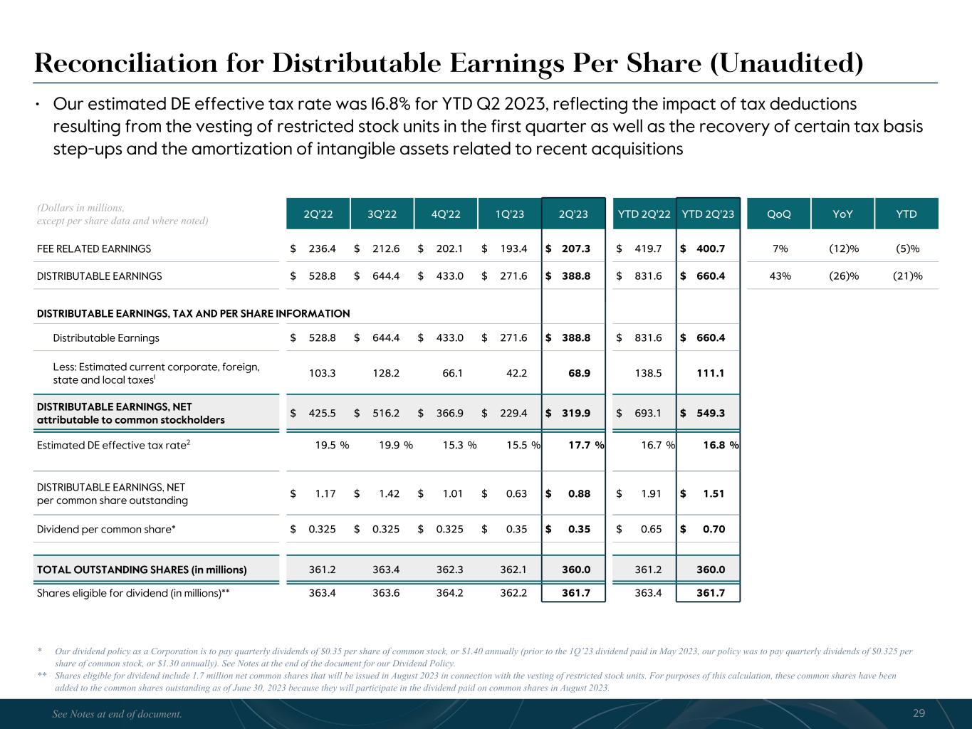R-14 7 G-19 5 B-19 7 R-88 G-15 9 B-16 5 R-13 6 G-18 0 B-83 R-16 3 G-14 3 B-18 7 R-0 G-74 B-13 6 R-18 5 G-21 1 B-15 3 R-11 8 G-92 B-15 0 R-22 0 G-22 1 B-23 2 R-14 0 G-14 1 B-15 2R-12 0 G-16 9 B-22 2 Old Colors R-88 G-89 B-91 58595B R-23 G-234 B-234 EAEAEA R-208 G-232 B-247 D0E8F7 R-65 G-64 B-66 414042 R-8 G-51 B-94 08335E R-167 G-169 B-171 A7A9AB R-9 G-102 B-112 096670 R-220 G-221 B-222 DCDDDE R-97 G-161 B-224 61A1E0 R-237 G-217 B-157 EDD99D R-147 G-195 B-197 93C3C5 Reconciliation for Distributable Earnings Per Share (Unaudited) * Our dividend policy as a Corporation is to pay quarterly dividends of $0.35 per share of common stock, or $1.40 annually (prior to the 1Q’23 dividend paid in May 2023, our policy was to pay quarterly dividends of $0.325 per share of common stock, or $1.30 annually). See Notes at the end of the document for our Dividend Policy. ** Shares eligible for dividend include 1.7 million net common shares that will be issued in August 2023 in connection with the vesting of restricted stock units. For purposes of this calculation, these common shares have been added to the common shares outstanding as of June 30, 2023 because they will participate in the dividend paid on common shares in August 2023. (Dollars in millions, except per share data and where noted) 2Q'22 3Q'22 4Q'22 1Q'23 2Q'23 YTD 2Q'22 YTD 2Q'23 QoQ YoY YTD FEE RELATED EARNINGS $ 236.4 $ 212.6 $ 202.1 $ 193.4 $ 207.3 $ 419.7 $ 400.7 7% (12)% (5)% DISTRIBUTABLE EARNINGS $ 528.8 $ 644.4 $ 433.0 $ 271.6 $ 388.8 $ 831.6 $ 660.4 43% (26)% (21)% DISTRIBUTABLE EARNINGS, TAX AND PER SHARE INFORMATION Distributable Earnings $ 528.8 $ 644.4 $ 433.0 $ 271.6 $ 388.8 $ 831.6 $ 660.4 Less: Estimated current corporate, foreign, state and local taxes1 103.3 128.2 66.1 42.2 68.9 138.5 111.1 DISTRIBUTABLE EARNINGS, NET attributable to common stockholders $ 425.5 $ 516.2 $ 366.9 $ 229.4 $ 319.9 $ 693.1 $ 549.3 Estimated DE effective tax rate2 19.5 % 19.9 % 15.3 % 15.5 % 17.7 % 16.7 % 16.8 % DISTRIBUTABLE EARNINGS, NET per common share outstanding $ 1.17 $ 1.42 $ 1.01 $ 0.63 $ 0.88 $ 1.91 $ 1.51 Dividend per common share* $ 0.325 $ 0.325 $ 0.325 $ 0.35 $ 0.35 $ 0.65 $ 0.70 TOTAL OUTSTANDING SHARES (in millions) 361.2 363.4 362.3 362.1 360.0 361.2 360.0 Shares eligible for dividend (in millions)** 363.4 363.6 364.2 362.2 361.7 363.4 361.7 29See Notes at end of document. • Our estimated DE effective tax rate was 16.8% for YTD Q2 2023, reflecting the impact of tax deductions resulting from the vesting of restricted stock units in the first quarter as well as the recovery of certain tax basis step-ups and the amortization of intangible assets related to recent acquisitions