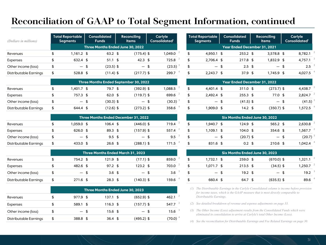 R-14 7 G-19 5 B-19 7 R-88 G-15 9 B-16 5 R-13 6 G-18 0 B-83 R-16 3 G-14 3 B-18 7 R-0 G-74 B-13 6 R-18 5 G-21 1 B-15 3 R-11 8 G-92 B-15 0 R-22 0 G-22 1 B-23 2 R-14 0 G-14 1 B-15 2R-12 0 G-16 9 B-22 2 Old Colors R-88 G-89 B-91 58595B R-23 G-234 B-234 EAEAEA R-208 G-232 B-247 D0E8F7 R-65 G-64 B-66 414042 R-8 G-51 B-94 08335E R-167 G-169 B-171 A7A9AB R-9 G-102 B-112 096670 R-220 G-221 B-222 DCDDDE R-97 G-161 B-224 61A1E0 R-237 G-217 B-157 EDD99D R-147 G-195 B-197 93C3C5 (Dollars in millions) Total Reportable Segments Consolidated Funds Reconciling Items Carlyle Consolidated1 Total Reportable Segments Consolidated Funds Reconciling Items Carlyle Consolidated1 Three Months Ended June 30, 2022 Year Ended December 31, 2021 Revenues $ 1,161.2 $ 63.2 $ (175.4) $ 1,049.0 2 $ 4,950.1 $ 253.2 $ 3,578.8 $ 8,782.1 2 Expenses $ 632.4 $ 51.1 $ 42.3 $ 725.8 2 $ 2,706.4 $ 217.8 $ 1,832.9 $ 4,757.1 2 Other income (loss) $ — $ (23.5) $ — $ (23.5) 3 $ — $ 2.5 $ — $ 2.5 3 Distributable Earnings $ 528.8 $ (11.4) $ (217.7) $ 299.7 4 $ 2,243.7 $ 37.9 $ 1,745.9 $ 4,027.5 4 Three Months Ended September 30, 2022 Year Ended December 31, 2022 Revenues $ 1,401.7 $ 79.7 $ (392.9) $ 1,088.5 2 $ 4,401.4 $ 311.0 $ (273.7) $ 4,438.7 2 Expenses $ 757.3 $ 62.0 $ (119.7) $ 699.6 2 $ 2,492.4 $ 255.3 $ 77.0 $ 2,824.7 2 Other income (loss) $ — $ (30.3) $ — $ (30.3) 3 $ — $ (41.5) $ — $ (41.5) 3 Distributable Earnings $ 644.4 $ (12.6) $ (273.2) $ 358.6 4 $ 1,909.0 $ 14.2 $ (350.7) $ 1,572.5 4 Three Months Ended December 31, 2022 Six Months Ended June 30, 2022 Revenues $ 1,059.0 $ 106.4 $ (446.0) $ 719.4 2 $ 1,940.7 $ 124.9 $ 565.2 $ 2,630.8 2 Expenses $ 626.0 $ 89.3 $ (157.9) $ 557.4 2 $ 1,109.1 $ 104.0 $ 354.6 $ 1,567.7 2 Other income (loss) $ — $ 9.5 $ — $ 9.5 3 $ — $ (20.7) $ — $ (20.7) 3 Distributable Earnings $ 433.0 $ 26.6 $ (288.1) $ 171.5 4 $ 831.6 $ 0.2 $ 210.6 $ 1,042.4 4 Three Months Ended March 31, 2023 Six Months Ended June 30, 2023 Revenues $ 754.2 $ 121.9 $ (17.1) $ 859.0 2 $ 1,732.1 $ 259.0 $ (670.0) $ 1,321.1 2 Expenses $ 482.6 $ 97.2 $ 123.2 $ 703.0 2 $ 1,071.7 $ 213.5 $ (34.5) $ 1,250.7 2 Other income (loss) $ — $ 3.6 $ — $ 3.6 3 $ — $ 19.2 $ — $ 19.2 3 Distributable Earnings $ 271.6 $ 28.3 $ (140.3) $ 159.6 4 $ 660.4 $ 64.7 $ (635.5) $ 89.6 4 Three Months Ended June 30, 2023 Revenues $ 977.9 $ 137.1 $ (652.9) $ 462.1 2 Expenses $ 589.1 $ 116.3 $ (157.7) $ 547.7 2 Other income (loss) $ — $ 15.6 $ — $ 15.6 3 Distributable Earnings $ 388.8 $ 36.4 $ (495.2) $ (70.0) 4 Reconciliation of GAAP to Total Segment Information, continued (1) The Distributable Earnings in the Carlyle Consolidated column is income before provision for income taxes, which is the GAAP measure that is most directly comparable to Distributable Earnings. (2) See detailed breakdown of revenue and expense adjustments on page 33. (3) The Other Income (Loss) adjustment results from the Consolidated Funds which were eliminated in consolidation to arrive at Carlyle's total Other Income (Loss). (4) See the reconciliation for Distributable Earnings and Fee Related Earnings on page 30. 31