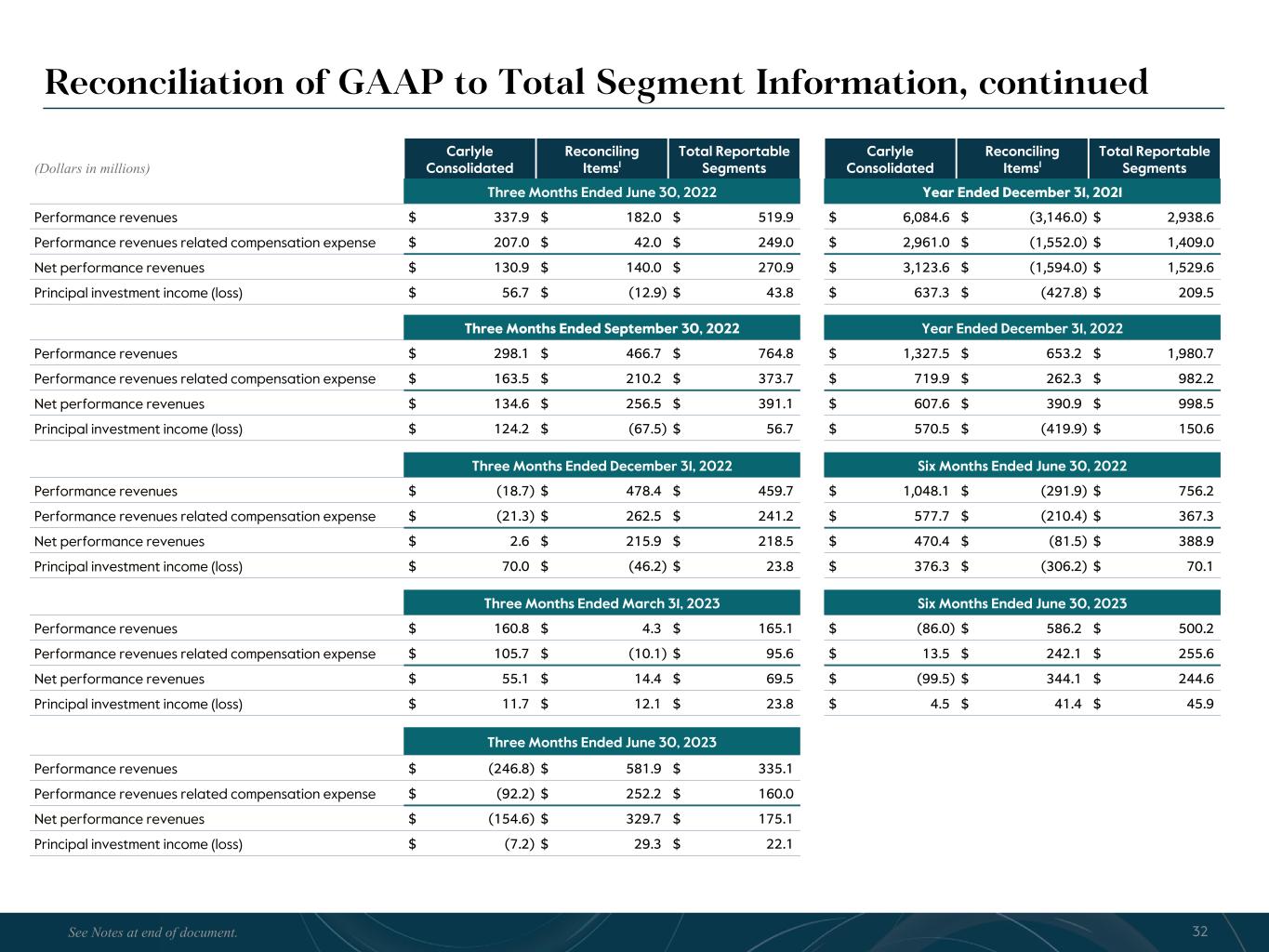 R-14 7 G-19 5 B-19 7 R-88 G-15 9 B-16 5 R-13 6 G-18 0 B-83 R-16 3 G-14 3 B-18 7 R-0 G-74 B-13 6 R-18 5 G-21 1 B-15 3 R-11 8 G-92 B-15 0 R-22 0 G-22 1 B-23 2 R-14 0 G-14 1 B-15 2R-12 0 G-16 9 B-22 2 Old Colors R-88 G-89 B-91 58595B R-23 G-234 B-234 EAEAEA R-208 G-232 B-247 D0E8F7 R-65 G-64 B-66 414042 R-8 G-51 B-94 08335E R-167 G-169 B-171 A7A9AB R-9 G-102 B-112 096670 R-220 G-221 B-222 DCDDDE R-97 G-161 B-224 61A1E0 R-237 G-217 B-157 EDD99D R-147 G-195 B-197 93C3C5 Reconciliation of GAAP to Total Segment Information, continued 32 (Dollars in millions) Carlyle Consolidated Reconciling Items1 Total Reportable Segments Carlyle Consolidated Reconciling Items1 Total Reportable Segments Three Months Ended June 30, 2022 Year Ended December 31, 2021 Performance revenues $ 337.9 $ 182.0 $ 519.9 $ 6,084.6 $ (3,146.0) $ 2,938.6 Performance revenues related compensation expense $ 207.0 $ 42.0 $ 249.0 $ 2,961.0 $ (1,552.0) $ 1,409.0 Net performance revenues $ 130.9 $ 140.0 $ 270.9 $ 3,123.6 $ (1,594.0) $ 1,529.6 Principal investment income (loss) $ 56.7 $ (12.9) $ 43.8 $ 637.3 $ (427.8) $ 209.5 Three Months Ended September 30, 2022 Year Ended December 31, 2022 Performance revenues $ 298.1 $ 466.7 $ 764.8 $ 1,327.5 $ 653.2 $ 1,980.7 Performance revenues related compensation expense $ 163.5 $ 210.2 $ 373.7 $ 719.9 $ 262.3 $ 982.2 Net performance revenues $ 134.6 $ 256.5 $ 391.1 $ 607.6 $ 390.9 $ 998.5 Principal investment income (loss) $ 124.2 $ (67.5) $ 56.7 $ 570.5 $ (419.9) $ 150.6 Three Months Ended December 31, 2022 Six Months Ended June 30, 2022 Performance revenues $ (18.7) $ 478.4 $ 459.7 $ 1,048.1 $ (291.9) $ 756.2 Performance revenues related compensation expense $ (21.3) $ 262.5 $ 241.2 $ 577.7 $ (210.4) $ 367.3 Net performance revenues $ 2.6 $ 215.9 $ 218.5 $ 470.4 $ (81.5) $ 388.9 Principal investment income (loss) $ 70.0 $ (46.2) $ 23.8 $ 376.3 $ (306.2) $ 70.1 Three Months Ended March 31, 2023 Six Months Ended June 30, 2023 Performance revenues $ 160.8 $ 4.3 $ 165.1 $ (86.0) $ 586.2 $ 500.2 Performance revenues related compensation expense $ 105.7 $ (10.1) $ 95.6 $ 13.5 $ 242.1 $ 255.6 Net performance revenues $ 55.1 $ 14.4 $ 69.5 $ (99.5) $ 344.1 $ 244.6 Principal investment income (loss) $ 11.7 $ 12.1 $ 23.8 $ 4.5 $ 41.4 $ 45.9 Three Months Ended June 30, 2023 Performance revenues $ (246.8) $ 581.9 $ 335.1 Performance revenues related compensation expense $ (92.2) $ 252.2 $ 160.0 Net performance revenues $ (154.6) $ 329.7 $ 175.1 Principal investment income (loss) $ (7.2) $ 29.3 $ 22.1 See Notes at end of document.