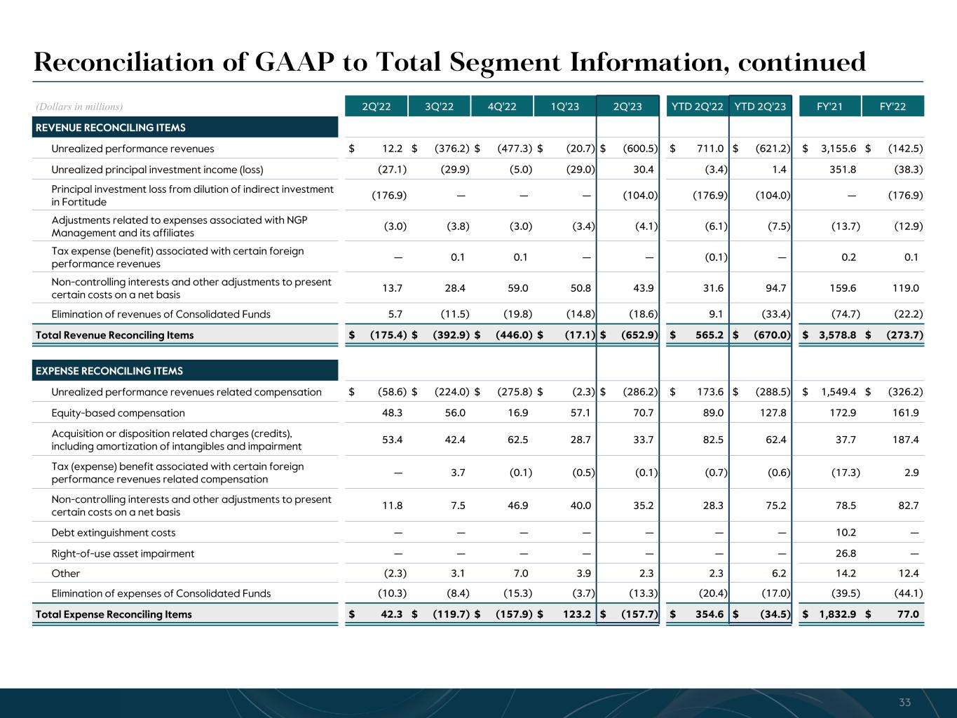 R-14 7 G-19 5 B-19 7 R-88 G-15 9 B-16 5 R-13 6 G-18 0 B-83 R-16 3 G-14 3 B-18 7 R-0 G-74 B-13 6 R-18 5 G-21 1 B-15 3 R-11 8 G-92 B-15 0 R-22 0 G-22 1 B-23 2 R-14 0 G-14 1 B-15 2R-12 0 G-16 9 B-22 2 Old Colors R-88 G-89 B-91 58595B R-23 G-234 B-234 EAEAEA R-208 G-232 B-247 D0E8F7 R-65 G-64 B-66 414042 R-8 G-51 B-94 08335E R-167 G-169 B-171 A7A9AB R-9 G-102 B-112 096670 R-220 G-221 B-222 DCDDDE R-97 G-161 B-224 61A1E0 R-237 G-217 B-157 EDD99D R-147 G-195 B-197 93C3C5 Reconciliation of GAAP to Total Segment Information, continued (Dollars in millions) 2Q'22 3Q'22 4Q'22 1Q'23 2Q'23 YTD 2Q'22 YTD 2Q'23 FY'21 FY'22 REVENUE RECONCILING ITEMS Unrealized performance revenues $ 12.2 $ (376.2) $ (477.3) $ (20.7) $ (600.5) $ 711.0 $ (621.2) $ 3,155.6 $ (142.5) Unrealized principal investment income (loss) (27.1) (29.9) (5.0) (29.0) 30.4 (3.4) 1.4 351.8 (38.3) Principal investment loss from dilution of indirect investment in Fortitude (176.9) — — — (104.0) (176.9) (104.0) — (176.9) Adjustments related to expenses associated with NGP Management and its affiliates (3.0) (3.8) (3.0) (3.4) (4.1) (6.1) (7.5) (13.7) (12.9) Tax expense (benefit) associated with certain foreign performance revenues — 0.1 0.1 — — (0.1) — 0.2 0.1 Non-controlling interests and other adjustments to present certain costs on a net basis 13.7 28.4 59.0 50.8 43.9 31.6 94.7 159.6 119.0 Elimination of revenues of Consolidated Funds 5.7 (11.5) (19.8) (14.8) (18.6) 9.1 (33.4) (74.7) (22.2) Total Revenue Reconciling Items $ (175.4) $ (392.9) $ (446.0) $ (17.1) $ (652.9) $ 565.2 $ (670.0) $ 3,578.8 $ (273.7) EXPENSE RECONCILING ITEMS Unrealized performance revenues related compensation $ (58.6) $ (224.0) $ (275.8) $ (2.3) $ (286.2) $ 173.6 $ (288.5) $ 1,549.4 $ (326.2) Equity-based compensation 48.3 56.0 16.9 57.1 70.7 89.0 127.8 172.9 161.9 Acquisition or disposition related charges (credits), including amortization of intangibles and impairment 53.4 42.4 62.5 28.7 33.7 82.5 62.4 37.7 187.4 Tax (expense) benefit associated with certain foreign performance revenues related compensation — 3.7 (0.1) (0.5) (0.1) (0.7) (0.6) (17.3) 2.9 Non-controlling interests and other adjustments to present certain costs on a net basis 11.8 7.5 46.9 40.0 35.2 28.3 75.2 78.5 82.7 Debt extinguishment costs — — — — — — — 10.2 — Right-of-use asset impairment — — — — — — — 26.8 — Other (2.3) 3.1 7.0 3.9 2.3 2.3 6.2 14.2 12.4 Elimination of expenses of Consolidated Funds (10.3) (8.4) (15.3) (3.7) (13.3) (20.4) (17.0) (39.5) (44.1) Total Expense Reconciling Items $ 42.3 $ (119.7) $ (157.9) $ 123.2 $ (157.7) $ 354.6 $ (34.5) $ 1,832.9 $ 77.0 33