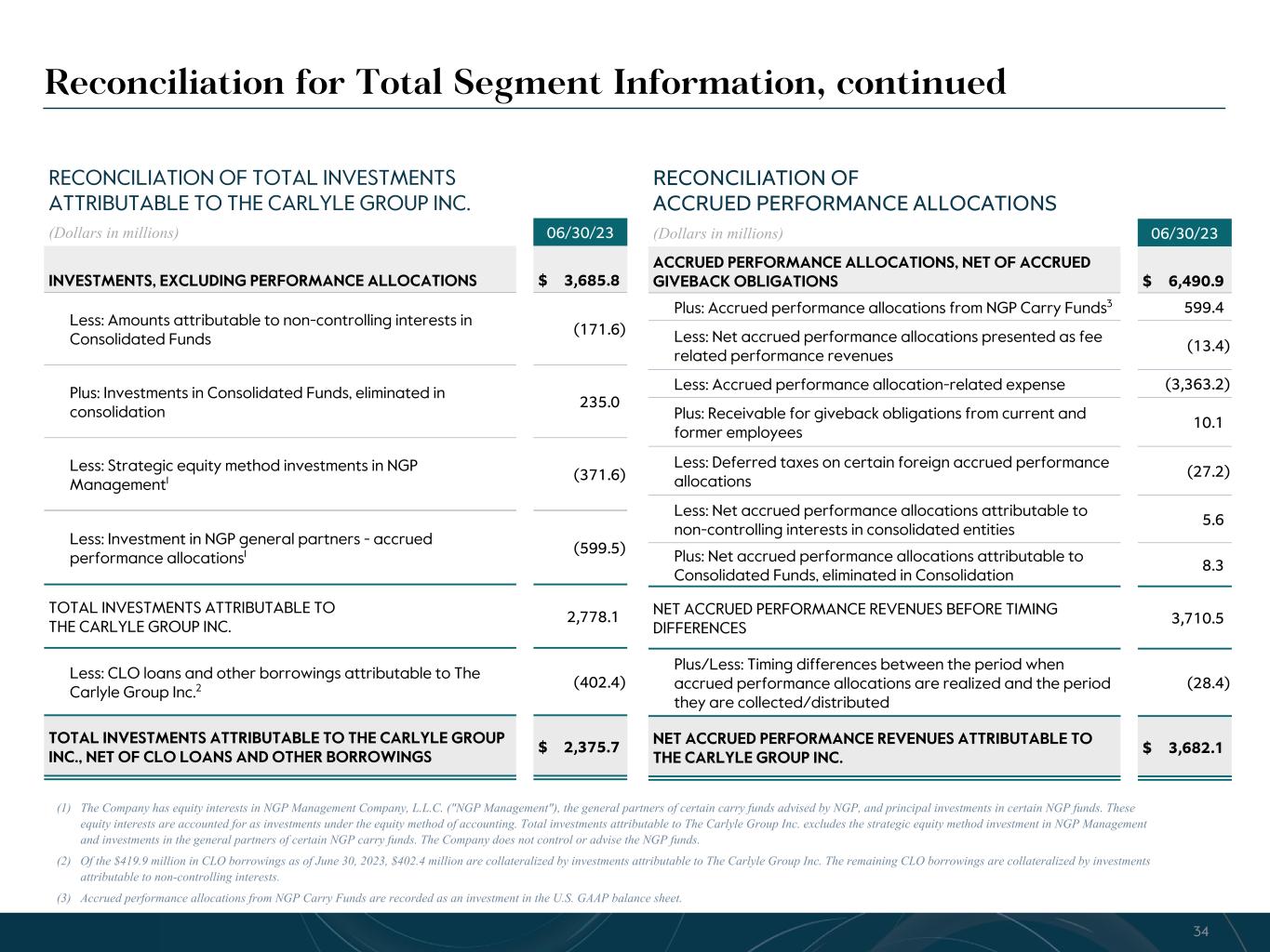 R-14 7 G-19 5 B-19 7 R-88 G-15 9 B-16 5 R-13 6 G-18 0 B-83 R-16 3 G-14 3 B-18 7 R-0 G-74 B-13 6 R-18 5 G-21 1 B-15 3 R-11 8 G-92 B-15 0 R-22 0 G-22 1 B-23 2 R-14 0 G-14 1 B-15 2R-12 0 G-16 9 B-22 2 Old Colors R-88 G-89 B-91 58595B R-23 G-234 B-234 EAEAEA R-208 G-232 B-247 D0E8F7 R-65 G-64 B-66 414042 R-8 G-51 B-94 08335E R-167 G-169 B-171 A7A9AB R-9 G-102 B-112 096670 R-220 G-221 B-222 DCDDDE R-97 G-161 B-224 61A1E0 R-237 G-217 B-157 EDD99D R-147 G-195 B-197 93C3C5 Reconciliation for Total Segment Information, continued (1) The Company has equity interests in NGP Management Company, L.L.C. ("NGP Management"), the general partners of certain carry funds advised by NGP, and principal investments in certain NGP funds. These equity interests are accounted for as investments under the equity method of accounting. Total investments attributable to The Carlyle Group Inc. excludes the strategic equity method investment in NGP Management and investments in the general partners of certain NGP carry funds. The Company does not control or advise the NGP funds. (2) Of the $419.9 million in CLO borrowings as of June 30, 2023, $402.4 million are collateralized by investments attributable to The Carlyle Group Inc. The remaining CLO borrowings are collateralized by investments attributable to non-controlling interests. (3) Accrued performance allocations from NGP Carry Funds are recorded as an investment in the U.S. GAAP balance sheet. RECONCILIATION OF TOTAL INVESTMENTS ATTRIBUTABLE TO THE CARLYLE GROUP INC. (Dollars in millions) 06/30/23 INVESTMENTS, EXCLUDING PERFORMANCE ALLOCATIONS $ 3,685.8 Less: Amounts attributable to non-controlling interests in Consolidated Funds (171.6) Plus: Investments in Consolidated Funds, eliminated in consolidation 235.0 Less: Strategic equity method investments in NGP Management1 (371.6) Less: Investment in NGP general partners - accrued performance allocations1 (599.5) TOTAL INVESTMENTS ATTRIBUTABLE TO THE CARLYLE GROUP INC. 2,778.1 Less: CLO loans and other borrowings attributable to The Carlyle Group Inc.2 (402.4) TOTAL INVESTMENTS ATTRIBUTABLE TO THE CARLYLE GROUP INC., NET OF CLO LOANS AND OTHER BORROWINGS $ 2,375.7 RECONCILIATION OF ACCRUED PERFORMANCE ALLOCATIONS (Dollars in millions) 06/30/23 ACCRUED PERFORMANCE ALLOCATIONS, NET OF ACCRUED GIVEBACK OBLIGATIONS $ 6,490.9 Plus: Accrued performance allocations from NGP Carry Funds3 599.4 Less: Net accrued performance allocations presented as fee related performance revenues (13.4) Less: Accrued performance allocation-related expense (3,363.2) Plus: Receivable for giveback obligations from current and former employees 10.1 Less: Deferred taxes on certain foreign accrued performance allocations (27.2) Less: Net accrued performance allocations attributable to non-controlling interests in consolidated entities 5.6 Plus: Net accrued performance allocations attributable to Consolidated Funds, eliminated in Consolidation 8.3 NET ACCRUED PERFORMANCE REVENUES BEFORE TIMING DIFFERENCES 3,710.5 Plus/Less: Timing differences between the period when accrued performance allocations are realized and the period they are collected/distributed (28.4) NET ACCRUED PERFORMANCE REVENUES ATTRIBUTABLE TO THE CARLYLE GROUP INC. $ 3,682.1 34