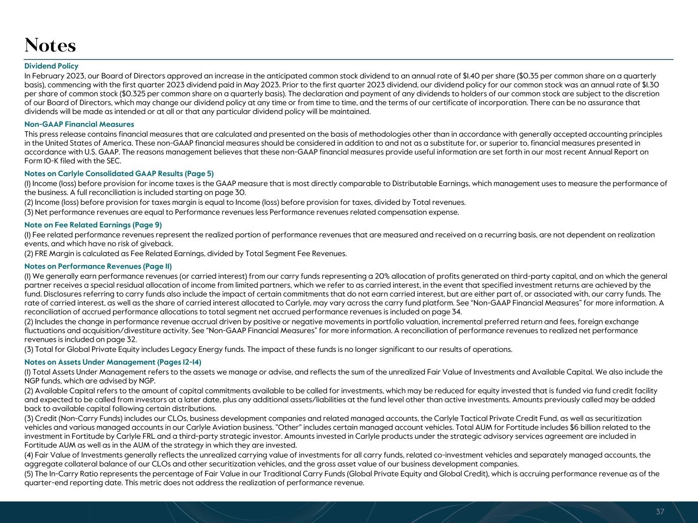 R-14 7 G-19 5 B-19 7 R-88 G-15 9 B-16 5 R-13 6 G-18 0 B-83 R-16 3 G-14 3 B-18 7 R-0 G-74 B-13 6 R-18 5 G-21 1 B-15 3 R-11 8 G-92 B-15 0 R-22 0 G-22 1 B-23 2 R-14 0 G-14 1 B-15 2R-12 0 G-16 9 B-22 2 Old Colors R-88 G-89 B-91 58595B R-23 G-234 B-234 EAEAEA R-208 G-232 B-247 D0E8F7 R-65 G-64 B-66 414042 R-8 G-51 B-94 08335E R-167 G-169 B-171 A7A9AB R-9 G-102 B-112 096670 R-220 G-221 B-222 DCDDDE R-97 G-161 B-224 61A1E0 R-237 G-217 B-157 EDD99D R-147 G-195 B-197 93C3C5 Notes Dividend Policy In February 2023, our Board of Directors approved an increase in the anticipated common stock dividend to an annual rate of $1.40 per share ($0.35 per common share on a quarterly basis), commencing with the first quarter 2023 dividend paid in May 2023. Prior to the first quarter 2023 dividend, our dividend policy for our common stock was an annual rate of $1.30 per share of common stock ($0.325 per common share on a quarterly basis). The declaration and payment of any dividends to holders of our common stock are subject to the discretion of our Board of Directors, which may change our dividend policy at any time or from time to time, and the terms of our certificate of incorporation. There can be no assurance that dividends will be made as intended or at all or that any particular dividend policy will be maintained. Non-GAAP Financial Measures This press release contains financial measures that are calculated and presented on the basis of methodologies other than in accordance with generally accepted accounting principles in the United States of America. These non-GAAP financial measures should be considered in addition to and not as a substitute for, or superior to, financial measures presented in accordance with U.S. GAAP. The reasons management believes that these non-GAAP financial measures provide useful information are set forth in our most recent Annual Report on Form 10-K filed with the SEC. Notes on Carlyle Consolidated GAAP Results (Page 5) (1) Income (loss) before provision for income taxes is the GAAP measure that is most directly comparable to Distributable Earnings, which management uses to measure the performance of the business. A full reconciliation is included starting on page 30. (2) Income (loss) before provision for taxes margin is equal to Income (loss) before provision for taxes, divided by Total revenues. (3) Net performance revenues are equal to Performance revenues less Performance revenues related compensation expense. Note on Fee Related Earnings (Page 9) (1) Fee related performance revenues represent the realized portion of performance revenues that are measured and received on a recurring basis, are not dependent on realization events, and which have no risk of giveback. (2) FRE Margin is calculated as Fee Related Earnings, divided by Total Segment Fee Revenues. Notes on Performance Revenues (Page 11) (1) We generally earn performance revenues (or carried interest) from our carry funds representing a 20% allocation of profits generated on third-party capital, and on which the general partner receives a special residual allocation of income from limited partners, which we refer to as carried interest, in the event that specified investment returns are achieved by the fund. Disclosures referring to carry funds also include the impact of certain commitments that do not earn carried interest, but are either part of, or associated with, our carry funds. The rate of carried interest, as well as the share of carried interest allocated to Carlyle, may vary across the carry fund platform. See “Non-GAAP Financial Measures” for more information. A reconciliation of accrued performance allocations to total segment net accrued performance revenues is included on page 34. (2) Includes the change in performance revenue accrual driven by positive or negative movements in portfolio valuation, incremental preferred return and fees, foreign exchange fluctuations and acquisition/divestiture activity. See “Non-GAAP Financial Measures” for more information. A reconciliation of performance revenues to realized net performance revenues is included on page 32. (3) Total for Global Private Equity includes Legacy Energy funds. The impact of these funds is no longer significant to our results of operations. Notes on Assets Under Management (Pages 12-14) (1) Total Assets Under Management refers to the assets we manage or advise, and reflects the sum of the unrealized Fair Value of Investments and Available Capital. We also include the NGP funds, which are advised by NGP. (2) Available Capital refers to the amount of capital commitments available to be called for investments, which may be reduced for equity invested that is funded via fund credit facility and expected to be called from investors at a later date, plus any additional assets/liabilities at the fund level other than active investments. Amounts previously called may be added back to available capital following certain distributions. (3) Credit (Non-Carry Funds) includes our CLOs, business development companies and related managed accounts, the Carlyle Tactical Private Credit Fund, as well as securitization vehicles and various managed accounts in our Carlyle Aviation business. "Other" includes certain managed account vehicles. Total AUM for Fortitude includes $6 billion related to the investment in Fortitude by Carlyle FRL and a third-party strategic investor. Amounts invested in Carlyle products under the strategic advisory services agreement are included in Fortitude AUM as well as in the AUM of the strategy in which they are invested. (4) Fair Value of Investments generally reflects the unrealized carrying value of investments for all carry funds, related co-investment vehicles and separately managed accounts, the aggregate collateral balance of our CLOs and other securitization vehicles, and the gross asset value of our business development companies. (5) The In-Carry Ratio represents the percentage of Fair Value in our Traditional