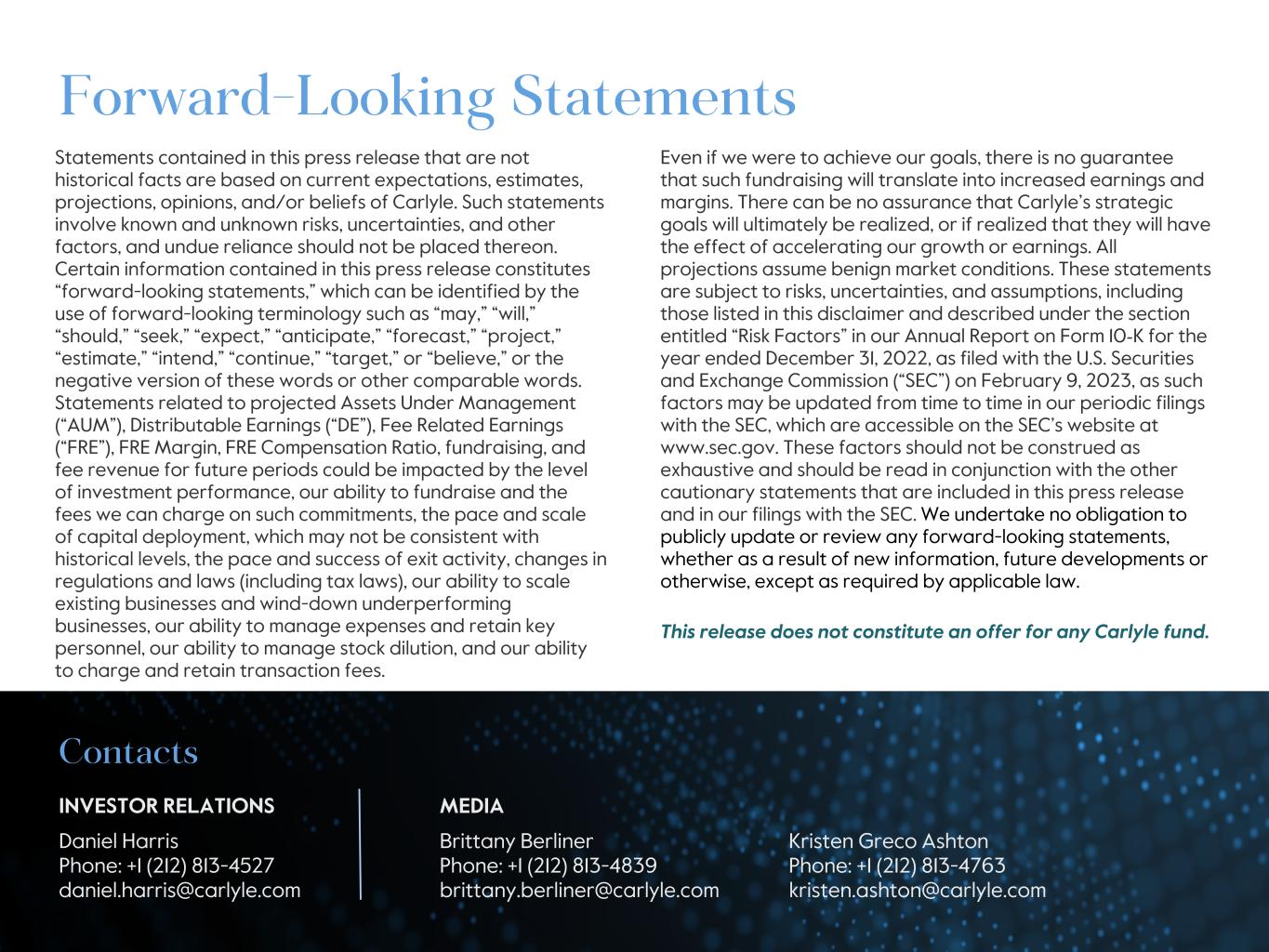 Statements contained in this press release that are not historical facts are based on current expectations, estimates, projections, opinions, and/or beliefs of Carlyle. Such statements involve known and unknown risks, uncertainties, and other factors, and undue reliance should not be placed thereon. Certain information contained in this press release constitutes “forward-looking statements,” which can be identified by the use of forward-looking terminology such as “may,” “will,” “should,” “seek,” “expect,” “anticipate,” “forecast,” “project,” “estimate,” “intend,” “continue,” “target,” or “believe,” or the negative version of these words or other comparable words. Statements related to projected Assets Under Management (“AUM”), Distributable Earnings (“DE”), Fee Related Earnings (“FRE”), FRE Margin, FRE Compensation Ratio, fundraising, and fee revenue for future periods could be impacted by the level of investment performance, our ability to fundraise and the fees we can charge on such commitments, the pace and scale of capital deployment, which may not be consistent with historical levels, the pace and success of exit activity, changes in regulations and laws (including tax laws), our ability to scale existing businesses and wind-down underperforming businesses, our ability to manage expenses and retain key personnel, our ability to manage stock dilution, and our ability to charge and retain transaction fees. Forward-Looking Statements Even if we were to achieve our goals, there is no guarantee that such fundraising will translate into increased earnings and margins. There can be no assurance that Carlyle’s strategic goals will ultimately be realized, or if realized that they will have the effect of accelerating our growth or earnings. All projections assume benign market conditions. These statements are subject to risks, uncertainties, and assumptions, including those listed in this disclaimer and described under the section entitled “Risk Factors” in our Annual Report on Form 10-K for the year ended December 31, 2022, as filed with the U.S. Securities and Exchange Commission (“SEC”) on February 9, 2023, as such factors may be updated from time to time in our periodic filings with the SEC, which are accessible on the SEC’s website at www.sec.gov. These factors should not be construed as exhaustive and should be read in conjunction with the other cautionary statements that are included in this press release and in our filings with the SEC. We undertake no obligation to publicly update or review any forward-looking statements, whether as a result of new information, future developments or otherwise, except as required by applicable law. This release does not constitute an offer for any Carlyle fund. Contacts INVESTOR RELATIONS MEDIA Daniel Harris Brittany Berliner Kristen Greco Ashton Phone: +1 (212) 813-4527 Phone: +1 (212) 813-4839 Phone: +1 (212) 813-4763 daniel.harris@carlyle.com brittany.berliner@carlyle.com kristen.ashton@carlyle.com