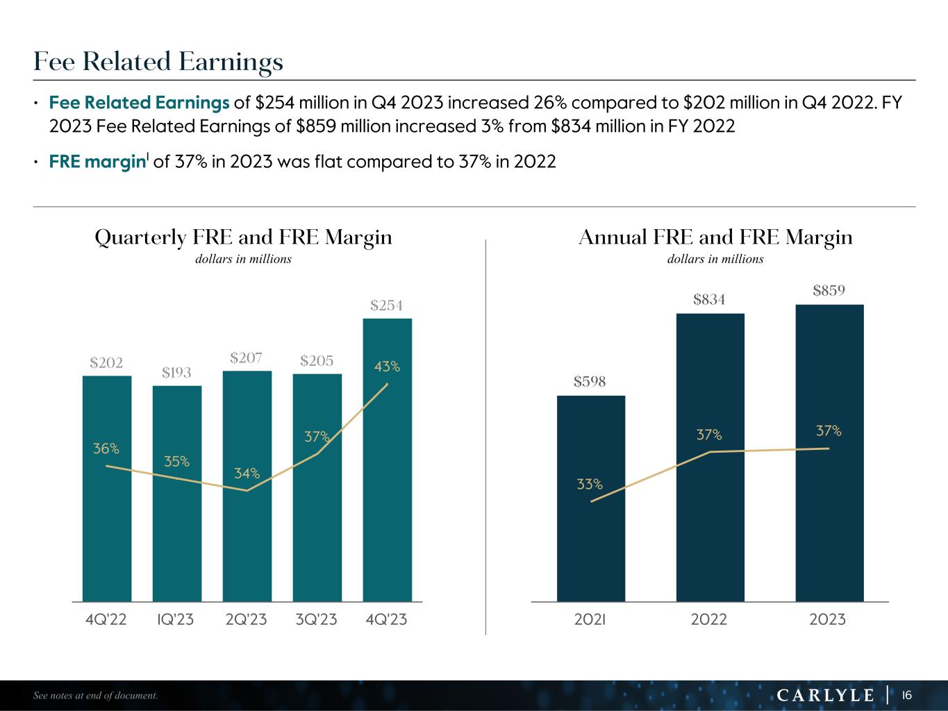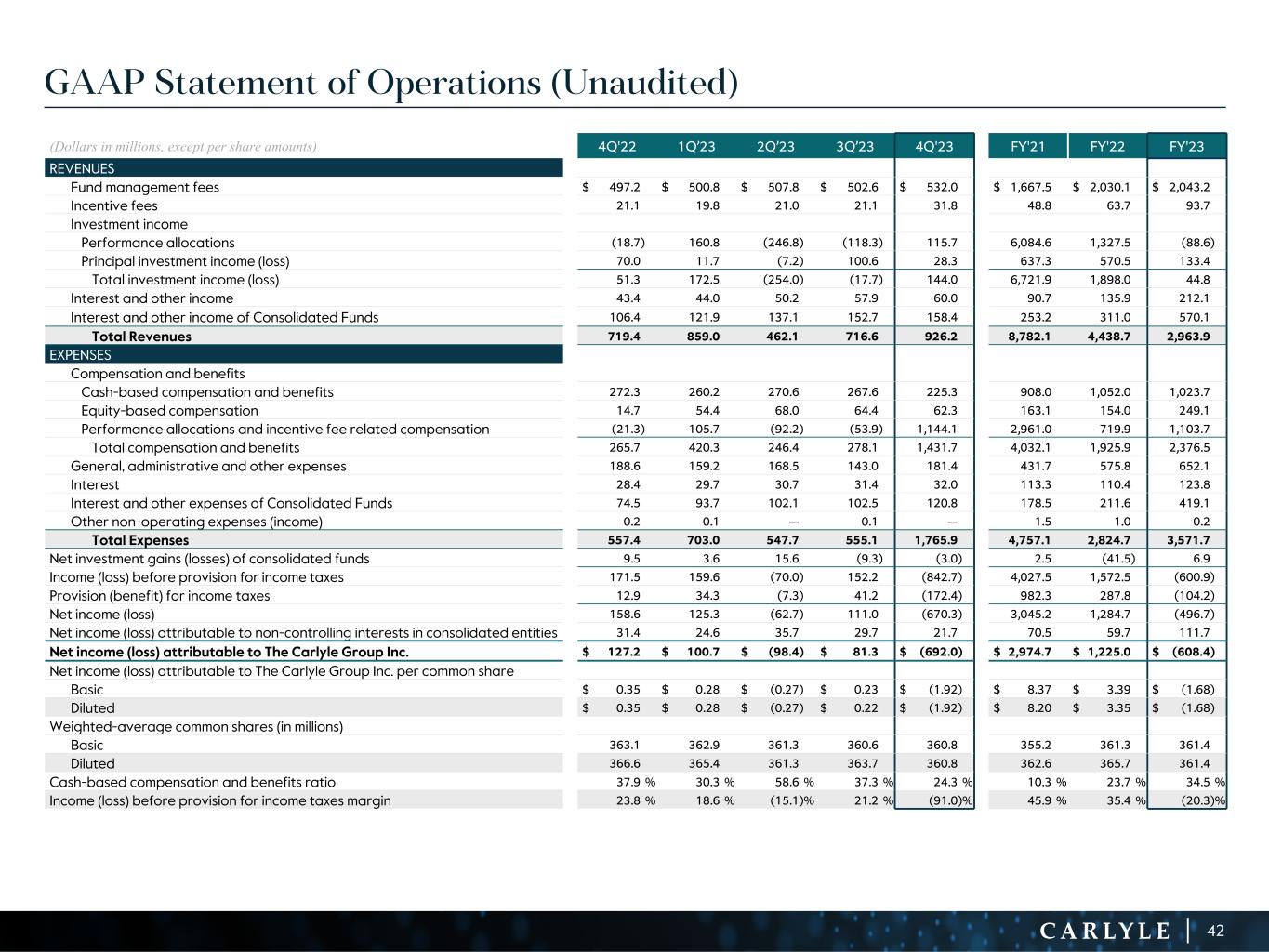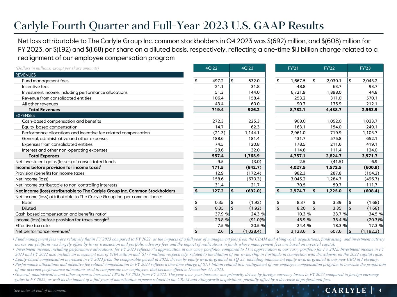 R-14 7 G-19 5 B-19 7 R-88 G-15 9 B-16 5 R-13 6 G-18 0 B-83 R-16 3 G-14 3 B-18 7 R-0 G-74 B-13 6 R-18 5 G-21 1 B-15 3 R-11 8 G-92 B-15 0 R-22 0 G-22 1 B-23 2 R-14 0 G-14 1 B-15 2R-12 0 G-16 9 B-22 2 Old Colors R-88 G-89 B-91 58595B R-23 G-234 B-234 EAEAEA R-208 G-232 B-247 D0E8F7 R-65 G-64 B-66 414042 R-8 G-51 B-94 08335E R-167 G-169 B-171 A7A9AB R-9 G-102 B-112 096670 R-220 G-221 B-222 DCDDDE R-97 G-161 B-224 61A1E0 R-237 G-217 B-157 EDD99D R-147 G-195 B-197 93C3C5 GAAP Statement of Operations (Unaudited) (Dollars in millions, except per share amounts) 4Q'22 1Q’23 2Q’23 3Q’23 4Q'23 FY'21 FY'22 FY'23 REVENUES Fund management fees $ 497.2 $ 500.8 $ 507.8 $ 502.6 $ 532.0 $ 1,667.5 $ 2,030.1 $ 2,043.2 Incentive fees 21.1 19.8 21.0 21.1 31.8 48.8 63.7 93.7 Investment income Performance allocations (18.7) 160.8 (246.8) (118.3) 115.7 6,084.6 1,327.5 (88.6) Principal investment income (loss) 70.0 11.7 (7.2) 100.6 28.3 637.3 570.5 133.4 Total investment income (loss) 51.3 172.5 (254.0) (17.7) 144.0 6,721.9 1,898.0 44.8 Interest and other income 43.4 44.0 50.2 57.9 60.0 90.7 135.9 212.1 Interest and other income of Consolidated Funds 106.4 121.9 137.1 152.7 158.4 253.2 311.0 570.1 Total Revenues 719.4 859.0 462.1 716.6 926.2 8,782.1 4,438.7 2,963.9 EXPENSES Compensation and benefits Cash-based compensation and benefits 272.3 260.2 270.6 267.6 225.3 908.0 1,052.0 1,023.7 Equity-based compensation 14.7 54.4 68.0 64.4 62.3 163.1 154.0 249.1 Performance allocations and incentive fee related compensation (21.3) 105.7 (92.2) (53.9) 1,144.1 2,961.0 719.9 1,103.7 Total compensation and benefits 265.7 420.3 246.4 278.1 1,431.7 4,032.1 1,925.9 2,376.5 General, administrative and other expenses 188.6 159.2 168.5 143.0 181.4 431.7 575.8 652.1 Interest 28.4 29.7 30.7 31.4 32.0 113.3 110.4 123.8 Interest and other expenses of Consolidated Funds 74.5 93.7 102.1 102.5 120.8 178.5 211.6 419.1 Other non-operating expenses (income) 0.2 0.1 — 0.1 — 1.5 1.0 0.2 Total Expenses 557.4 703.0 547.7 555.1 1,765.9 4,757.1 2,824.7 3,571.7 Net investment gains (losses) of consolidated funds 9.5 3.6 15.6 (9.3) (3.0) 2.5 (41.5) 6.9 Income (loss) before provision for income taxes 171.5 159.6 (70.0) 152.2 (842.7) 4,027.5 1,572.5 (600.9) Provision (benefit) for income taxes 12.9 34.3 (7.3) 41.2 (172.4) 982.3 287.8 (104.2) Net income (loss) 158.6 125.3 (62.7) 111.0 (670.3) 3,045.2 1,284.7 (496.7) Net income (loss) attributable to non-controlling interests in consolidated entities 31.4 24.6 35.7 29.7 21.7 70.5 59.7 111.7 Net income (loss) attributable to The Carlyle Group Inc. $ 127.2 $ 100.7 $ (98.4) $ 81.3 $ (692.0) $ 2,974.7 $ 1,225.0 $ (608.4) Net income (loss) attributable to The Carlyle Group Inc. per common share Basic $ 0.35 $ 0.28 $ (0.27) $ 0.23 $ (1.92) $ 8.37 $ 3.39 $ (1.68) Diluted $ 0.35 $ 0.28 $ (0.27) $ 0.22 $ (1.92) $ 8.20 $ 3.35 $ (1.68) Weighted-average common shares (in millions) Basic 363.1 362.9 361.3 360.6 360.8 355.2 361.3 361.4 Diluted 366.6 365.4 361.3 363.7 360.8 362.6 365.7 361.4 Cash-based compensation and benefits ratio 37.9 % 30.3 % 58.6 % 37.3 % 24.3 % 10.3 % 23.7 % 34.5 % Income (loss) before provision for income taxes margin 23.8 % 18.6 % (15.1) % 21.2 % (91.0) % 45.9 % 35.4 % (20.3) % 42