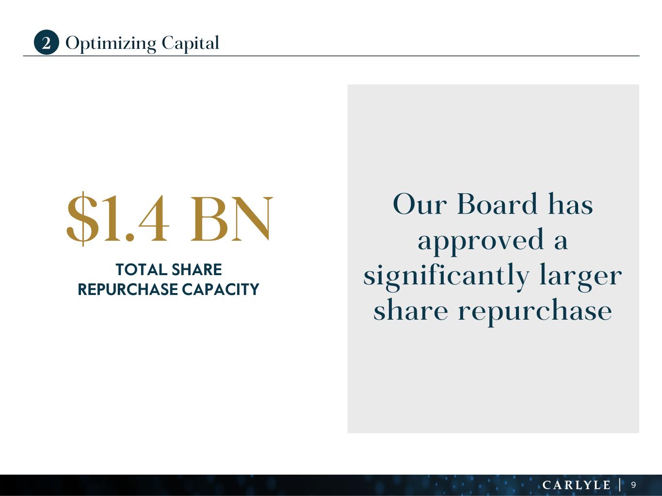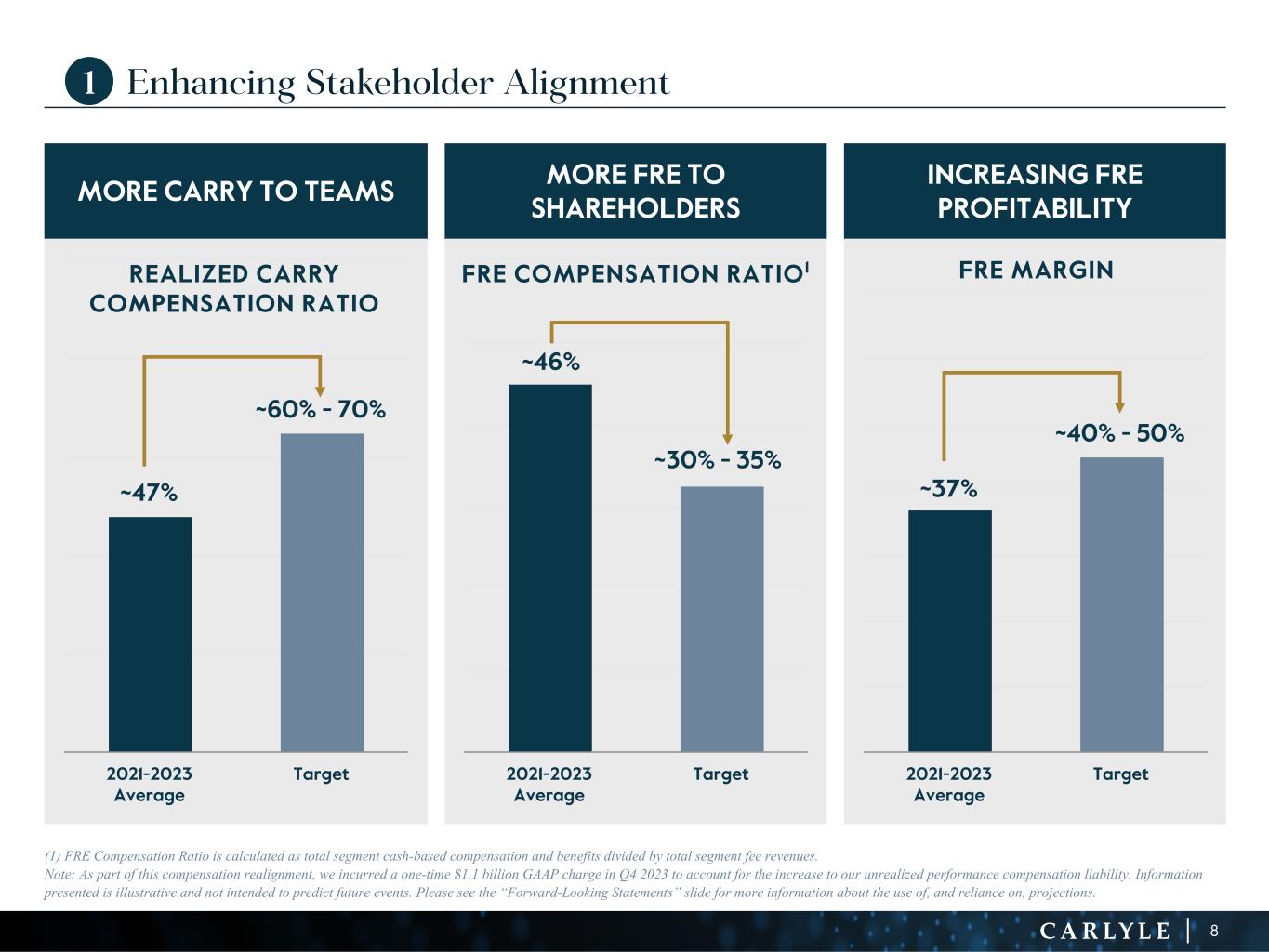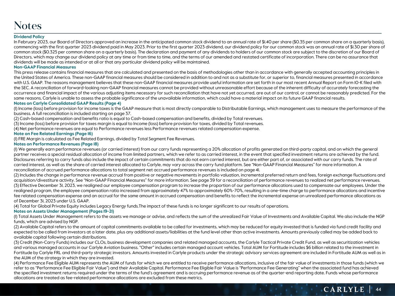 R-14 7 G-19 5 B-19 7 R-88 G-15 9 B-16 5 R-13 6 G-18 0 B-83 R-16 3 G-14 3 B-18 7 R-0 G-74 B-13 6 R-18 5 G-21 1 B-15 3 R-11 8 G-92 B-15 0 R-22 0 G-22 1 B-23 2 R-14 0 G-14 1 B-15 2R-12 0 G-16 9 B-22 2 Old Colors R-88 G-89 B-91 58595B R-23 G-234 B-234 EAEAEA R-208 G-232 B-247 D0E8F7 R-65 G-64 B-66 414042 R-8 G-51 B-94 08335E R-167 G-169 B-171 A7A9AB R-9 G-102 B-112 096670 R-220 G-221 B-222 DCDDDE R-97 G-161 B-224 61A1E0 R-237 G-217 B-157 EDD99D R-147 G-195 B-197 93C3C5 Notes Dividend Policy In February 2023, our Board of Directors approved an increase in the anticipated common stock dividend to an annual rate of $1.40 per share ($0.35 per common share on a quarterly basis), commencing with the first quarter 2023 dividend paid in May 2023. Prior to the first quarter 2023 dividend, our dividend policy for our common stock was an annual rate of $1.30 per share of common stock ($0.325 per common share on a quarterly basis). The declaration and payment of any dividends to holders of our common stock are subject to the discretion of our Board of Directors, which may change our dividend policy at any time or from time to time, and the terms of our amended and restated certificate of incorporation. There can be no assurance that dividends will be made as intended or at all or that any particular dividend policy will be maintained. Non-GAAP Financial Measures This press release contains financial measures that are calculated and presented on the basis of methodologies other than in accordance with generally accepted accounting principles in the United States of America. These non-GAAP financial measures should be considered in addition to and not as a substitute for, or superior to, financial measures presented in accordance with U.S. GAAP. The reasons management believes that these non-GAAP financial measures provide useful information are set forth in our most recent Annual Report on Form 10-K filed with the SEC. A reconciliation of forward-looking non-GAAP financial measures cannot be provided without unreasonable effort because of the inherent difficulty of accurately forecasting the occurrence and financial impact of the various adjusting items necessary for such reconciliation that have not yet occurred, are out of our control, or cannot be reasonably predicted. For the same reasons, Carlyle is unable to assess the probable significance of the unavailable information, which could have a material impact on its future GAAP financial results. Notes on Carlyle Consolidated GAAP Results (Page 4) (1) Income (loss) before provision for income taxes is the GAAP measure that is most directly comparable to Distributable Earnings, which management uses to measure the performance of the business. A full reconciliation is included starting on page 37. (2) Cash-based compensation and benefits ratio is equal to Cash-based compensation and benefits, divided by Total revenues. (3) Income (loss) before provision for taxes margin is equal to Income (loss) before provision for taxes, divided by Total revenues. (4) Net performance revenues are equal to Performance revenues less Performance revenues related compensation expense. Note on Fee Related Earnings (Page 16) (1) FRE Margin is calculated as Fee Related Earnings, divided by Total Segment Fee Revenues. Notes on Performance Revenues (Page 18) (1) We generally earn performance revenues (or carried interest) from our carry funds representing a 20% allocation of profits generated on third-party capital, and on which the general partner receives a special residual allocation of income from limited partners, which we refer to as carried interest, in the event that specified investment returns are achieved by the fund. Disclosures referring to carry funds also include the impact of certain commitments that do not earn carried interest, but are either part of, or associated with our carry funds. The rate of carried interest, as well as the share of carried interest allocated to Carlyle, may vary across the carry fund platform. See “Non-GAAP Financial Measures” for more information. A reconciliation of accrued performance allocations to total segment net accrued performance revenues is included on page 41. (2) Includes the change in performance revenue accrual from positive or negative movements in portfolio valuation, incremental preferred return and fees, foreign exchange fluctuations and acquisition/divestiture activity. See “Non-GAAP Financial Measures” for more information. See page 39 for a reconciliation of performance revenues to realized net performance revenues. (3) Effective December 31, 2023, we realigned our employee compensation program to increase the proportion of our performance allocations used to compensate our employees. Under the realigned program, the employee compensation ratio increased from approximately 47% to approximately 60%-70%, resulting in a one-time charge to performance allocations and incentive fee related compensation expense and an accrual for the same amount in accrued compensation and benefits to reflect the incremental expense on unrealized performance allocations as of December 31, 2023 under U.S. GAAP. (4) Total for Global Private Equity includes Legacy Energy funds.The impact of these funds is no longer significant to our results of operations. Notes on Assets Under Management (Pages 19-21) (1) Total Assets Under Management refers to the assets we manage or advise, and reflects the sum of the unrealized Fair Value of Investments and Available Capital. We also include the NGP funds, which are advised by NGP. (2) Available Capital refers to the amount of capital commitments available to be called for investments, which may be reduced for equity invested that is funded via fund credit facility and expected to be called from investors at a later date, plus any additional assets/liabilities at the fund level other than active investments. Amounts previously called may be added back to available capital following certain dis
