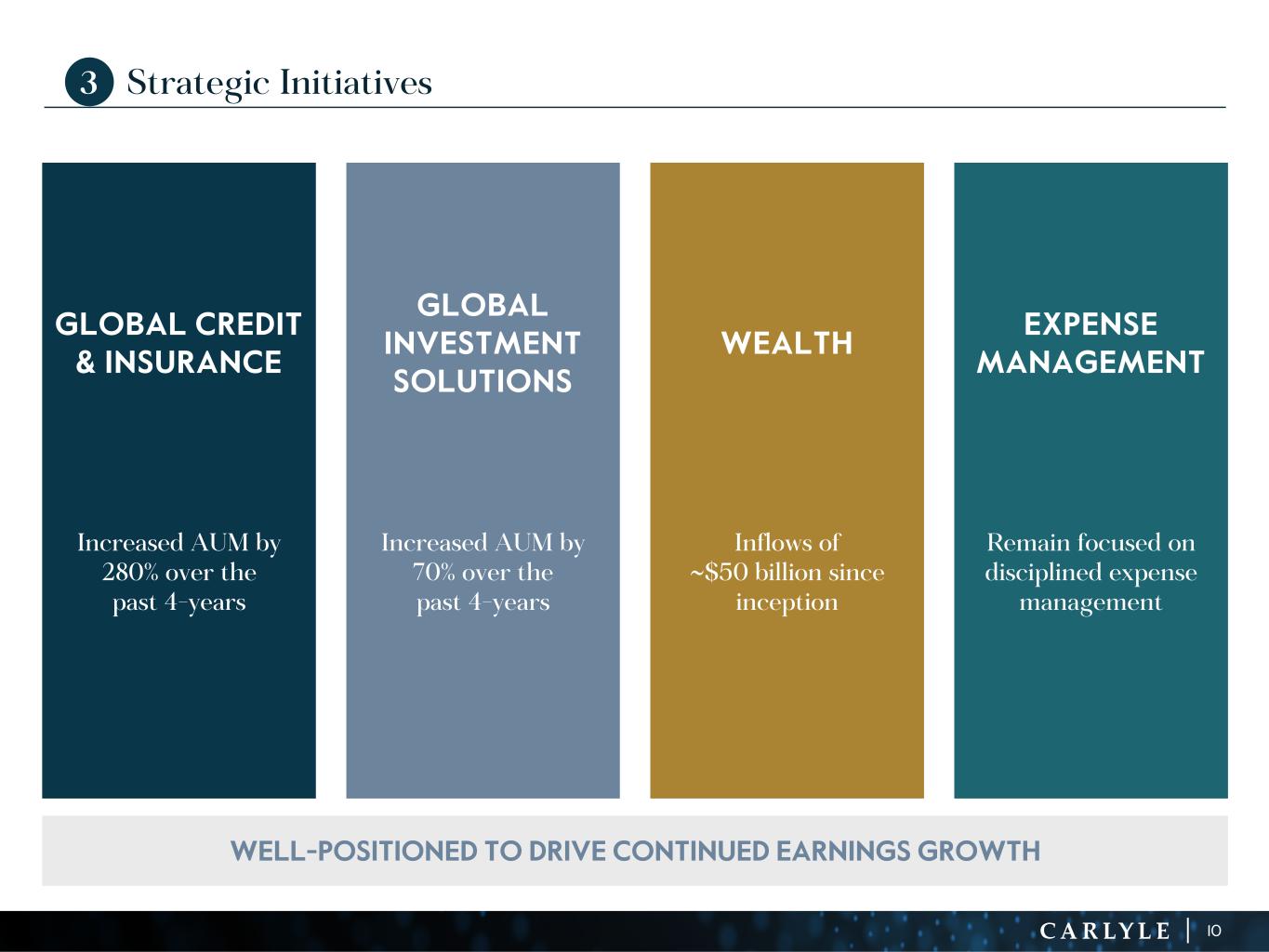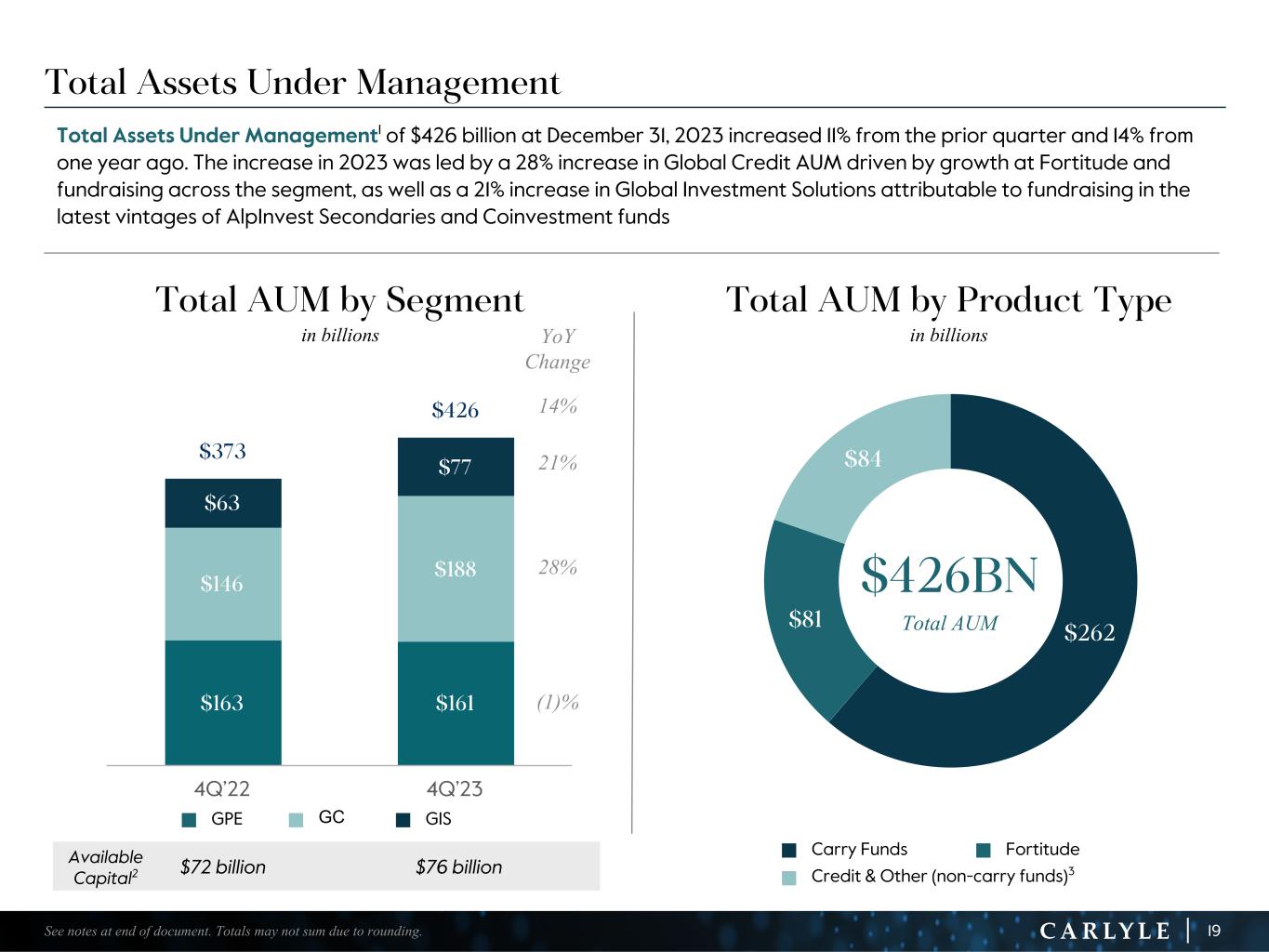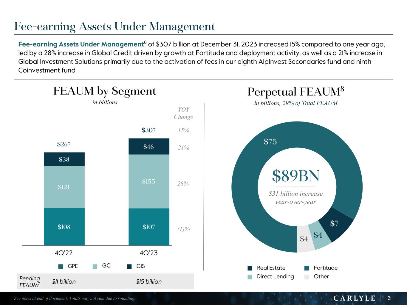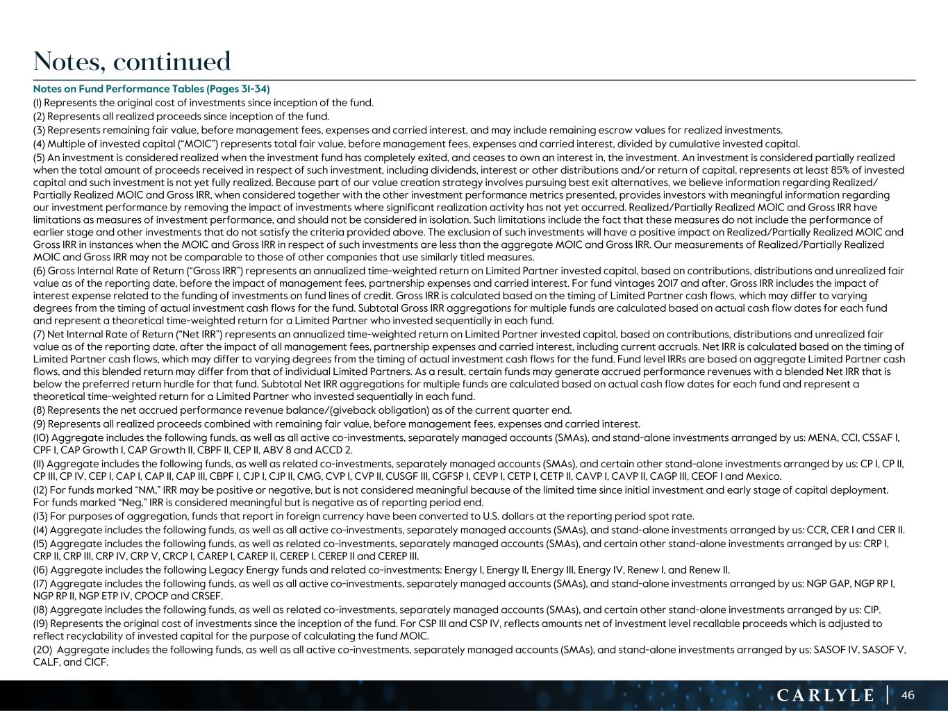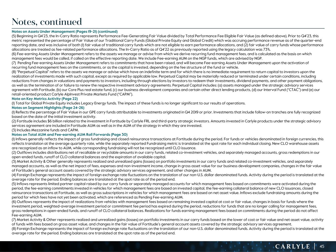 R-14 7 G-19 5 B-19 7 R-88 G-15 9 B-16 5 R-13 6 G-18 0 B-83 R-16 3 G-14 3 B-18 7 R-0 G-74 B-13 6 R-18 5 G-21 1 B-15 3 R-11 8 G-92 B-15 0 R-22 0 G-22 1 B-23 2 R-14 0 G-14 1 B-15 2R-12 0 G-16 9 B-22 2 Old Colors R-88 G-89 B-91 58595B R-23 G-234 B-234 EAEAEA R-208 G-232 B-247 D0E8F7 R-65 G-64 B-66 414042 R-8 G-51 B-94 08335E R-167 G-169 B-171 A7A9AB R-9 G-102 B-112 096670 R-220 G-221 B-222 DCDDDE R-97 G-161 B-224 61A1E0 R-237 G-217 B-157 EDD99D R-147 G-195 B-197 93C3C5 Notes, continued Notes on Assets Under Management (Pages 19-21) (continued) (5) Beginning in Q4’23, the In-Carry Ratio represents Performance Fee-Generating Fair Value divided by Total Performance Fee Eligible Fair Value (as defined above). Prior to Q4’23, this metric represented the percentage of Fair Value of our Traditional Carry Funds (Global Private Equity and Global Credit) which was accruing performance revenue as of the quarter-end reporting date, and was inclusive of both (1) fair value of traditional carry funds which are not eligible to earn performance allocations, and (2) fair value of carry funds whose performance allocations are treated as fee-related performance allocations. The In-Carry Ratio as of Q4’22 as previously reported using the legacy calculation was 73%. (6) Fee-earning Assets Under Management refers to the assets we manage or advise from which we derive recurring fund management fees, and is calculated as the basis on which management fees would be called, if called on the effective reporting date. We include Fee-earning AUM on the NGP funds, which are advised by NGP. (7) Pending Fee-earning Assets Under Management refers to commitments that have been raised, and will become Fee-earning Assets Under Management upon the activation of recurring fund management fees on the commitments, or as the capital is invested, depending on the fee structure of the fund or vehicle. (8) “Perpetual Capital” refers to the assets we manage or advise which have an indefinite term and for which there is no immediate requirement to return capital to investors upon the realization of investments made with such capital, except as required by applicable law. Perpetual Capital may be materially reduced or terminated under certain conditions, including reductions from changes in valuations and payments to investors, including through elections by investors to redeem their investments, dividend payments, and other payment obligations, as well as the termination of or failure to renew the respective investment advisory agreements. Perpetual Capital includes: (a) assets managed under the strategic advisory services agreement with Fortitude, (b) our Core Plus real estate fund, (c) our business development companies and certain other direct lending products, (d) our Interval Fund (“CTAC”) and (e) our retail-oriented product Carlyle AlpInvest Private Markets Fund (“CAPM”). Note on Key Metrics Activity (Page 22) (1) Total for Global Private Equity includes Legacy Energy funds. The impact of these funds is no longer significant to our results of operations. Notes on Segment Highlights (Page 24-26) (1) Reflects the percentage of Fair Value in our GPE carry funds attributable to investments originated in Q4 2019 or prior. Investments that include follow-on tranches are fully recognized based on the date of the initial investment activity. (2) Fortitude includes $6 billion related to the investment in Fortitude by Carlyle FRL and third-party strategic investors. Amounts invested in Carlyle products under the strategic advisory services agreement are included in Fortitude AUM as well as in the AUM of the strategy in which they are invested. (3) Includes Mezzanine funds and CAPM. Notes on Total AUM and Fee-earning AUM Roll Forwards (Page 30) (1) Inflows generally reflects the impact of gross fundraising and closed reinsurance transactions at Fortitude during the period. For funds or vehicles denominated in foreign currencies, this reflects translation at the average quarterly rate, while the separately reported Fundraising metric is translated at the spot rate for each individual closing. New CLO warehouse assets are recognized as an inflow to AUM, while corresponding fundraising will not be recognized until CLO issuance. (2) Outflows includes distributions net of recallable or recyclable amounts in our carry funds, related co-investment vehicles, and separately managed accounts, gross redemptions in our open-ended funds, runoff of CLO collateral balances and the expiration of available capital. (3) Market Activity & Other generally represents realized and unrealized gains (losses) on portfolio investments in our carry funds and related co-investment vehicles, and separately managed accounts, as well as the net impact of fees, expenses and non-investment income, change in gross asset value for our business development companies, changes in the fair value of Fortitude’s general account assets covered by the strategic advisory services agreement, and other changes in AUM. (4) Foreign Exchange represents the impact of foreign exchange rate fluctuations on the translation of our non-U.S. dollar denominated funds. Activity during the period is translated at the average rate for the period. Ending balances are translated at the spot rate as of the period end. (5) Inflows represents limited partner capital raised by our carry funds or separately managed accounts for which management fees based on commitments were activated during the period, the fee-earning commitments invested in vehicles for which management fees are based on invested capital, the fee-earning collateral balance of new CLO issuances, closed reinsurance transactions at Fortitude, as well as gross subscriptions in vehicles for which management fees are based on net asset value. Inflows exclude fundraising amounts during the period for which fees have not yet been activated, which are referenced as Pending Fee-earning AUM. (6) Outflows represents the impact of 