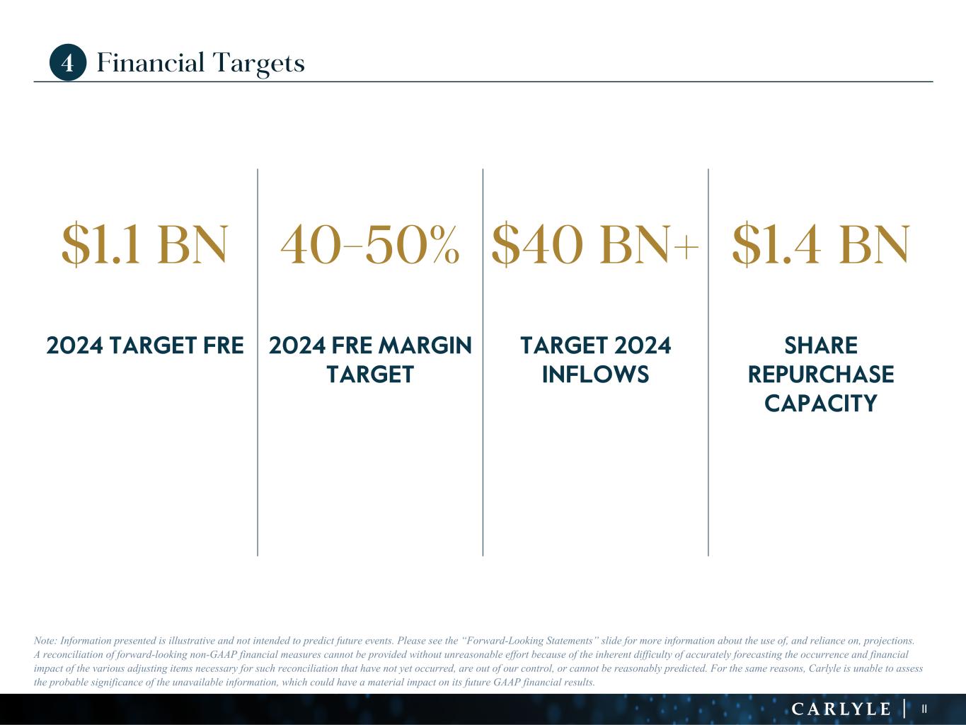 R-14 7 G-19 5 B-19 7 R-88 G-15 9 B-16 5 R-13 6 G-18 0 B-83 R-16 3 G-14 3 B-18 7 R-0 G-74 B-13 6 R-18 5 G-21 1 B-15 3 R-11 8 G-92 B-15 0 R-22 0 G-22 1 B-23 2 R-14 0 G-14 1 B-15 2R-12 0 G-16 9 B-22 2 Old Colors R-88 G-89 B-91 58595B R-23 G-234 B-234 EAEAEA R-208 G-232 B-247 D0E8F7 R-65 G-64 B-66 414042 R-8 G-51 B-94 08335E R-167 G-169 B-171 A7A9AB R-9 G-102 B-112 096670 R-220 G-221 B-222 DCDDDE R-97 G-161 B-224 61A1E0 R-237 G-217 B-157 EDD99D R-147 G-195 B-197 93C3C5 $1.1 BN 40-50% $40 BN+ $1.4 BN 2024 TARGET FRE 2024 FRE MARGIN TARGET TARGET 2024 INFLOWS SHARE REPURCHASE CAPACITY Financial Targets 11 Note: Information presented is illustrative and not intended to predict future events. Please see the “Forward-Looking Statements” slide for more information about the use of, and reliance on, projections. A reconciliation of forward-looking non-GAAP financial measures cannot be provided without unreasonable effort because of the inherent difficulty of accurately forecasting the occurrence and financial impact of the various adjusting items necessary for such reconciliation that have not yet occurred, are out of our control, or cannot be reasonably predicted. For the same reasons, Carlyle is unable to assess the probable significance of the unavailable information, which could have a material impact on its future GAAP financial results. 4