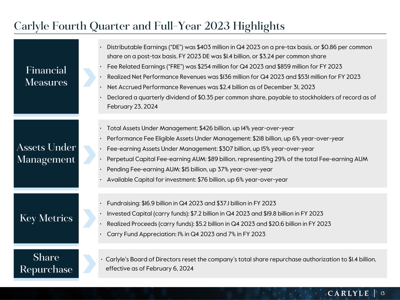 R-14 7 G-19 5 B-19 7 R-88 G-15 9 B-16 5 R-13 6 G-18 0 B-83 R-16 3 G-14 3 B-18 7 R-0 G-74 B-13 6 R-18 5 G-21 1 B-15 3 R-11 8 G-92 B-15 0 R-22 0 G-22 1 B-23 2 R-14 0 G-14 1 B-15 2R-12 0 G-16 9 B-22 2 Old Colors R-88 G-89 B-91 58595B R-23 G-234 B-234 EAEAEA R-208 G-232 B-247 D0E8F7 R-65 G-64 B-66 414042 R-8 G-51 B-94 08335E R-167 G-169 B-171 A7A9AB R-9 G-102 B-112 096670 R-220 G-221 B-222 DCDDDE R-97 G-161 B-224 61A1E0 R-237 G-217 B-157 EDD99D R-147 G-195 B-197 93C3C5 Financial Measures • Distributable Earnings (“DE”) was $403 million in Q4 2023 on a pre-tax basis, or $0.86 per common share on a post-tax basis. FY 2023 DE was $1.4 billion, or $3.24 per common share • Fee Related Earnings (“FRE”) was $254 million for Q4 2023 and $859 million for FY 2023 • Realized Net Performance Revenues was $136 million for Q4 2023 and $531 million for FY 2023 • Net Accrued Performance Revenues was $2.4 billion as of December 31, 2023 • Declared a quarterly dividend of $0.35 per common share, payable to stockholders of record as of February 23, 2024 Assets Under Management • Total Assets Under Management: $426 billion, up 14% year-over-year • Performance Fee Eligible Assets Under Management: $218 billion, up 6% year-over-year • Fee-earning Assets Under Management: $307 billion, up 15% year-over-year • Perpetual Capital Fee-earning AUM: $89 billion, representing 29% of the total Fee-earning AUM • Pending Fee-earning AUM: $15 billion, up 37% year-over-year • Available Capital for investment: $76 billion, up 6% year-over-year Key Metrics • Fundraising: $16.9 billion in Q4 2023 and $37.1 billion in FY 2023 • Invested Capital (carry funds): $7.2 billion in Q4 2023 and $19.8 billion in FY 2023 • Realized Proceeds (carry funds): $5.2 billion in Q4 2023 and $20.6 billion in FY 2023 • Carry Fund Appreciation: 1% in Q4 2023 and 7% in FY 2023 Share Repurchase • Carlyle’s Board of Directors reset the company’s total share repurchase authorization to $1.4 billion, effective as of February 6, 2024 Carlyle Fourth Quarter and Full-Year 2023 Highlights 13