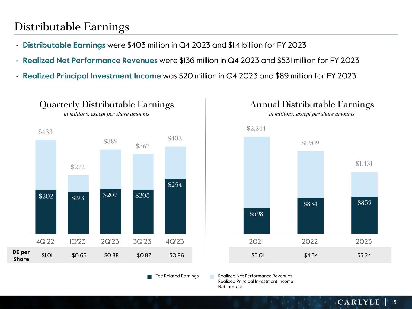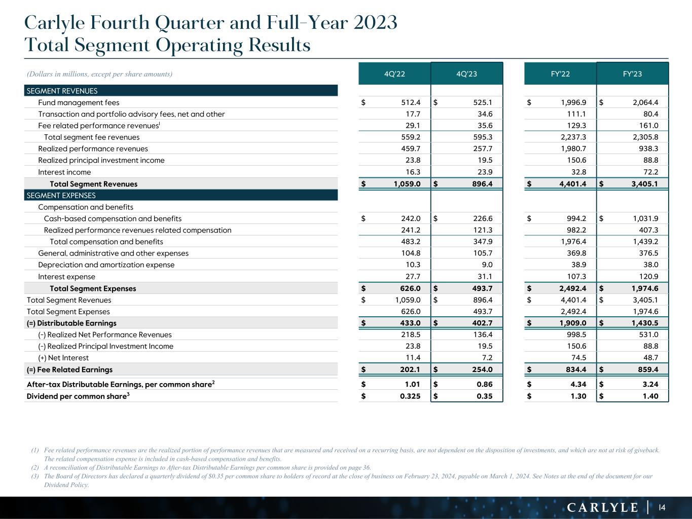 R-14 7 G-19 5 B-19 7 R-88 G-15 9 B-16 5 R-13 6 G-18 0 B-83 R-16 3 G-14 3 B-18 7 R-0 G-74 B-13 6 R-18 5 G-21 1 B-15 3 R-11 8 G-92 B-15 0 R-22 0 G-22 1 B-23 2 R-14 0 G-14 1 B-15 2R-12 0 G-16 9 B-22 2 Old Colors R-88 G-89 B-91 58595B R-23 G-234 B-234 EAEAEA R-208 G-232 B-247 D0E8F7 R-65 G-64 B-66 414042 R-8 G-51 B-94 08335E R-167 G-169 B-171 A7A9AB R-9 G-102 B-112 096670 R-220 G-221 B-222 DCDDDE R-97 G-161 B-224 61A1E0 R-237 G-217 B-157 EDD99D R-147 G-195 B-197 93C3C5 Carlyle Fourth Quarter and Full-Year 2023 Total Segment Operating Results (1) Fee related performance revenues are the realized portion of performance revenues that are measured and received on a recurring basis, are not dependent on the disposition of investments, and which are not at risk of giveback. The related compensation expense is included in cash-based compensation and benefits. (2) A reconciliation of Distributable Earnings to After-tax Distributable Earnings per common share is provided on page 36. (3) The Board of Directors has declared a quarterly dividend of $0.35 per common share to holders of record at the close of business on February 23, 2024, payable on March 1, 2024. See Notes at the end of the document for our Dividend Policy. (Dollars in millions, except per share amounts) 4Q'22 4Q'23 FY'22 FY'23 SEGMENT REVENUES Fund management fees $ 512.4 $ 525.1 $ 1,996.9 $ 2,064.4 Transaction and portfolio advisory fees, net and other 17.7 34.6 111.1 80.4 Fee related performance revenues1 29.1 35.6 129.3 161.0 Total segment fee revenues 559.2 595.3 2,237.3 2,305.8 Realized performance revenues 459.7 257.7 1,980.7 938.3 Realized principal investment income 23.8 19.5 150.6 88.8 Interest income 16.3 23.9 32.8 72.2 Total Segment Revenues $ 1,059.0 $ 896.4 $ 4,401.4 $ 3,405.1 SEGMENT EXPENSES Compensation and benefits Cash-based compensation and benefits $ 242.0 $ 226.6 $ 994.2 $ 1,031.9 Realized performance revenues related compensation 241.2 121.3 982.2 407.3 Total compensation and benefits 483.2 347.9 1,976.4 1,439.2 General, administrative and other expenses 104.8 105.7 369.8 376.5 Depreciation and amortization expense 10.3 9.0 38.9 38.0 Interest expense 27.7 31.1 107.3 120.9 Total Segment Expenses $ 626.0 $ 493.7 $ 2,492.4 $ 1,974.6 Total Segment Revenues $ 1,059.0 $ 896.4 $ 4,401.4 $ 3,405.1 Total Segment Expenses 626.0 493.7 2,492.4 1,974.6 (=) Distributable Earnings $ 433.0 $ 402.7 $ 1,909.0 $ 1,430.5 (-) Realized Net Performance Revenues 218.5 136.4 998.5 531.0 (-) Realized Principal Investment Income 23.8 19.5 150.6 88.8 (+) Net Interest 11.4 7.2 74.5 48.7 (=) Fee Related Earnings $ 202.1 $ 254.0 $ 834.4 $ 859.4 After-tax Distributable Earnings, per common share2 $ 1.01 $ 0.86 $ 4.34 $ 3.24 Dividend per common share3 $ 0.325 $ 0.35 $ 1.30 $ 1.40 14