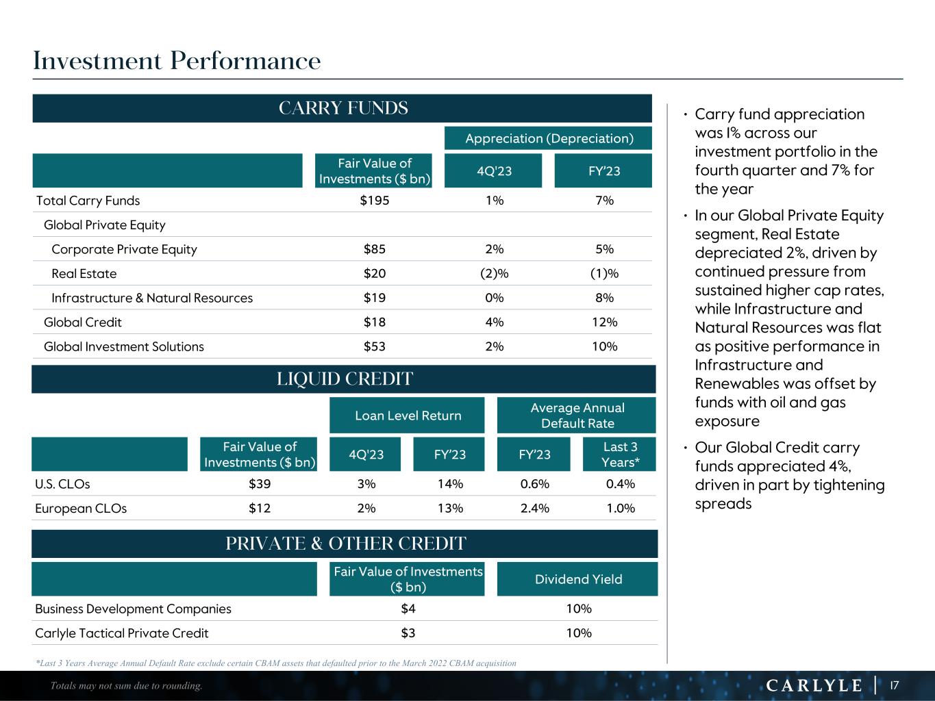R-14 7 G-19 5 B-19 7 R-88 G-15 9 B-16 5 R-13 6 G-18 0 B-83 R-16 3 G-14 3 B-18 7 R-0 G-74 B-13 6 R-18 5 G-21 1 B-15 3 R-11 8 G-92 B-15 0 R-22 0 G-22 1 B-23 2 R-14 0 G-14 1 B-15 2R-12 0 G-16 9 B-22 2 Old Colors R-88 G-89 B-91 58595B R-23 G-234 B-234 EAEAEA R-208 G-232 B-247 D0E8F7 R-65 G-64 B-66 414042 R-8 G-51 B-94 08335E R-167 G-169 B-171 A7A9AB R-9 G-102 B-112 096670 R-220 G-221 B-222 DCDDDE R-97 G-161 B-224 61A1E0 R-237 G-217 B-157 EDD99D R-147 G-195 B-197 93C3C5 Investment Performance 17Totals may not sum due to rounding. $490 LIQUID CREDIT Loan Level Return Average Annual Default Rate Fair Value of Investments ($ bn) 4Q'23 FY’23 FY’23 Last 3 Years* U.S. CLOs $39 3% 14% 0.6% 0.4% European CLOs $12 2% 13% 2.4% 1.0% CARRY FUNDS Appreciation (Depreciation) Fair Value of Investments ($ bn) 4Q'23 FY’23 Total Carry Funds $195 1% 7% Global Private Equity Corporate Private Equity $85 2% 5% Real Estate $20 (2)% (1)% Infrastructure & Natural Resources $19 0% 8% Global Credit $18 4% 12% Global Investment Solutions $53 2% 10% PRIVATE & OTHER CREDIT Fair Value of Investments ($ bn) Dividend Yield Business Development Companies $4 10% Carlyle Tactical Private Credit $3 10% *Last 3 Years Average Annual Default Rate exclude certain CBAM assets that defaulted prior to the March 2022 CBAM acquisition • Carry fund appreciation was 1% across our investment portfolio in the fourth quarter and 7% for the year • In our Global Private Equity segment, Real Estate depreciated 2%, driven by continued pressure from sustained higher cap rates, while Infrastructure and Natural Resources was flat as positive performance in Infrastructure and Renewables was offset by funds with oil and gas exposure • Our Global Credit carry funds appreciated 4%, driven in part by tightening spreads