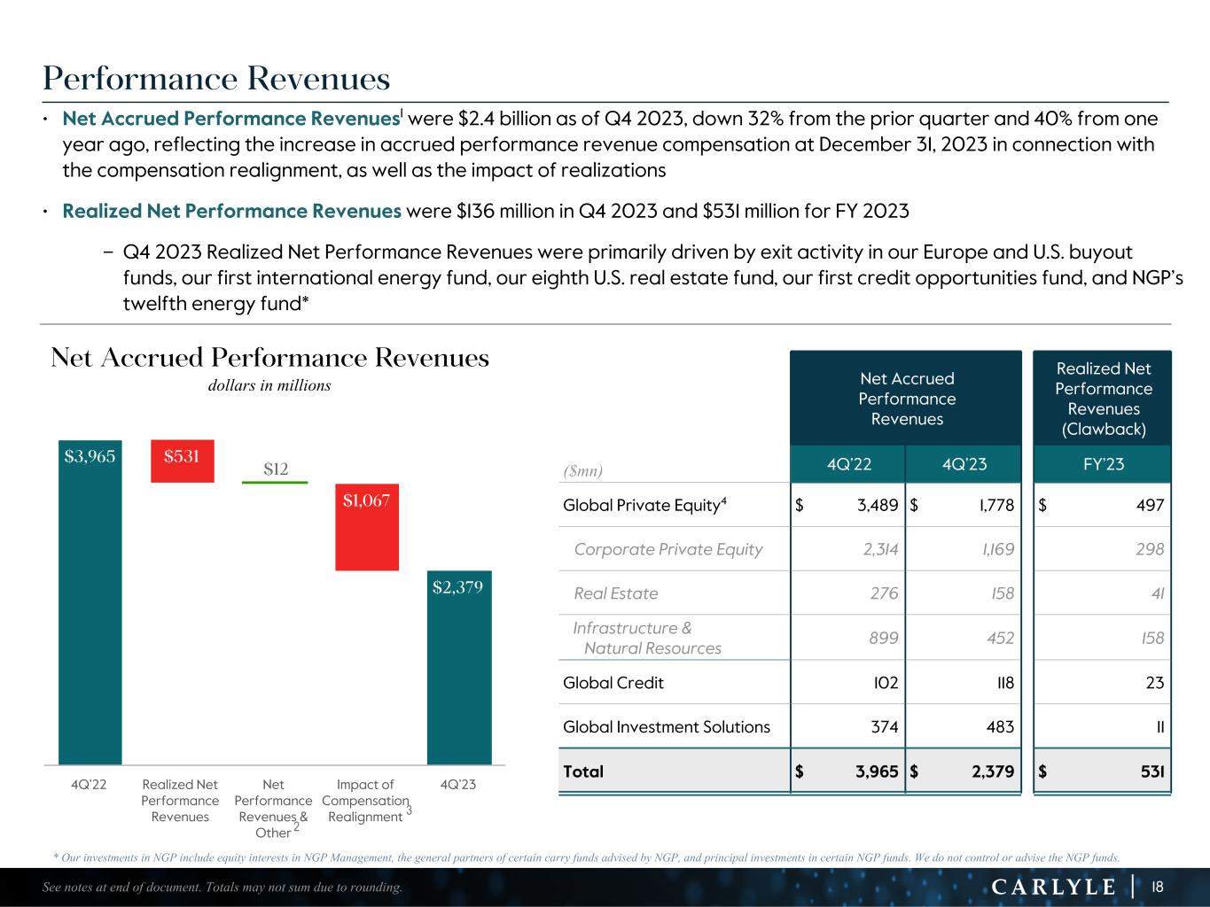 R-14 7 G-19 5 B-19 7 R-88 G-15 9 B-16 5 R-13 6 G-18 0 B-83 R-16 3 G-14 3 B-18 7 R-0 G-74 B-13 6 R-18 5 G-21 1 B-15 3 R-11 8 G-92 B-15 0 R-22 0 G-22 1 B-23 2 R-14 0 G-14 1 B-15 2R-12 0 G-16 9 B-22 2 Old Colors R-88 G-89 B-91 58595B R-23 G-234 B-234 EAEAEA R-208 G-232 B-247 D0E8F7 R-65 G-64 B-66 414042 R-8 G-51 B-94 08335E R-167 G-169 B-171 A7A9AB R-9 G-102 B-112 096670 R-220 G-221 B-222 DCDDDE R-97 G-161 B-224 61A1E0 R-237 G-217 B-157 EDD99D R-147 G-195 B-197 93C3C5 • Net Accrued Performance Revenues1 were $2.4 billion as of Q4 2023, down 32% from the prior quarter and 40% from one year ago, reflecting the increase in accrued performance revenue compensation at December 31, 2023 in connection with the compensation realignment, as well as the impact of realizations • Realized Net Performance Revenues were $136 million in Q4 2023 and $531 million for FY 2023 – Q4 2023 Realized Net Performance Revenues were primarily driven by exit activity in our Europe and U.S. buyout funds, our first international energy fund, our eighth U.S. real estate fund, our first credit opportunities fund, and NGP’s twelfth energy fund* $3,965 $3,434.0 $3,434.0 $2,367.0 $2,379 $531 $12 $1,067 4Q’22 Realized Net Performance Revenues Net Performance Revenues & Other Impact of Compensation Realignment 4Q’23 Performance Revenues 2 18 Net Accrued Performance Revenues Realized Net Performance Revenues (Clawback) ($mn) 4Q’22 4Q’23 FY’23 Global Private Equity4 $ 3,489 $ 1,778 $ 497 Corporate Private Equity 2,314 1,169 298 Real Estate 276 158 41 Infrastructure & Natural Resources 899 452 158 Global Credit 102 118 23 Global Investment Solutions 374 483 11 Total $ 3,965 $ 2,379 $ 531 See notes at end of document. Totals may not sum due to rounding. Net Accrued Performance Revenues dollars in millions $12 3 * Our investments in NGP include equity interests in NGP Management, the general partners of certain carry funds advised by NGP, and principal investments in certain NGP funds. We do not control or advise the NGP funds.