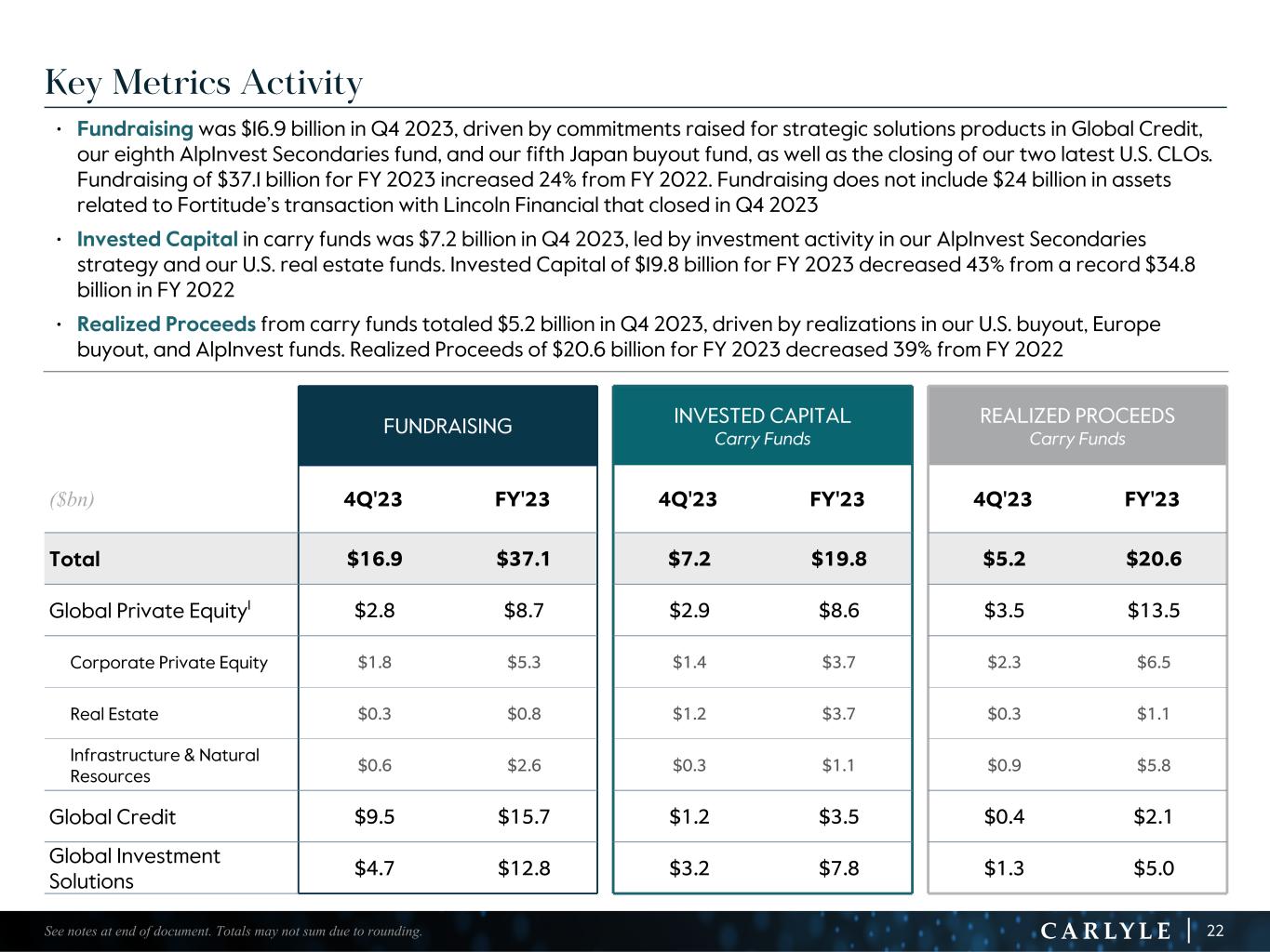 R-14 7 G-19 5 B-19 7 R-88 G-15 9 B-16 5 R-13 6 G-18 0 B-83 R-16 3 G-14 3 B-18 7 R-0 G-74 B-13 6 R-18 5 G-21 1 B-15 3 R-11 8 G-92 B-15 0 R-22 0 G-22 1 B-23 2 R-14 0 G-14 1 B-15 2R-12 0 G-16 9 B-22 2 Old Colors R-88 G-89 B-91 58595B R-23 G-234 B-234 EAEAEA R-208 G-232 B-247 D0E8F7 R-65 G-64 B-66 414042 R-8 G-51 B-94 08335E R-167 G-169 B-171 A7A9AB R-9 G-102 B-112 096670 R-220 G-221 B-222 DCDDDE R-97 G-161 B-224 61A1E0 R-237 G-217 B-157 EDD99D R-147 G-195 B-197 93C3C5 Key Metrics Activity • Fundraising was $16.9 billion in Q4 2023, driven by commitments raised for strategic solutions products in Global Credit, our eighth AlpInvest Secondaries fund, and our fifth Japan buyout fund, as well as the closing of our two latest U.S. CLOs. Fundraising of $37.1 billion for FY 2023 increased 24% from FY 2022. Fundraising does not include $24 billion in assets related to Fortitude’s transaction with Lincoln Financial that closed in Q4 2023 • Invested Capital in carry funds was $7.2 billion in Q4 2023, led by investment activity in our AlpInvest Secondaries strategy and our U.S. real estate funds. Invested Capital of $19.8 billion for FY 2023 decreased 43% from a record $34.8 billion in FY 2022 • Realized Proceeds from carry funds totaled $5.2 billion in Q4 2023, driven by realizations in our U.S. buyout, Europe buyout, and AlpInvest funds. Realized Proceeds of $20.6 billion for FY 2023 decreased 39% from FY 2022 FUNDRAISING INVESTED CAPITAL Carry Funds REALIZED PROCEEDS Carry Funds ($bn) 4Q'23 FY'23 4Q'23 FY'23 4Q'23 FY'23 Total $16.9 $37.1 $7.2 $19.8 $5.2 $20.6 Global Private Equity1 $2.8 $8.7 $2.9 $8.6 $3.5 $13.5 Corporate Private Equity $1.8 $5.3 $1.4 $3.7 $2.3 $6.5 Real Estate $0.3 $0.8 $1.2 $3.7 $0.3 $1.1 Infrastructure & Natural Resources $0.6 $2.6 $0.3 $1.1 $0.9 $5.8 Global Credit $9.5 $15.7 $1.2 $3.5 $0.4 $2.1 Global Investment Solutions $4.7 $12.8 $3.2 $7.8 $1.3 $5.0 22See notes at end of document. Totals may not sum due to rounding.