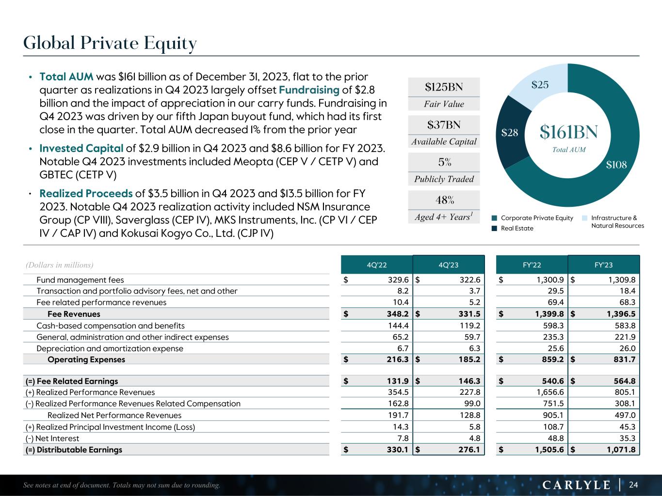 R-14 7 G-19 5 B-19 7 R-88 G-15 9 B-16 5 R-13 6 G-18 0 B-83 R-16 3 G-14 3 B-18 7 R-0 G-74 B-13 6 R-18 5 G-21 1 B-15 3 R-11 8 G-92 B-15 0 R-22 0 G-22 1 B-23 2 R-14 0 G-14 1 B-15 2R-12 0 G-16 9 B-22 2 Old Colors R-88 G-89 B-91 58595B R-23 G-234 B-234 EAEAEA R-208 G-232 B-247 D0E8F7 R-65 G-64 B-66 414042 R-8 G-51 B-94 08335E R-167 G-169 B-171 A7A9AB R-9 G-102 B-112 096670 R-220 G-221 B-222 DCDDDE R-97 G-161 B-224 61A1E0 R-237 G-217 B-157 EDD99D R-147 G-195 B-197 93C3C5 Global Private Equity • Total AUM was $161 billion as of December 31, 2023, flat to the prior quarter as realizations in Q4 2023 largely offset Fundraising of $2.8 billion and the impact of appreciation in our carry funds. Fundraising in Q4 2023 was driven by our fifth Japan buyout fund, which had its first close in the quarter. Total AUM decreased 1% from the prior year • Invested Capital of $2.9 billion in Q4 2023 and $8.6 billion for FY 2023. Notable Q4 2023 investments included Meopta (CEP V / CETP V) and GBTEC (CETP V) • Realized Proceeds of $3.5 billion in Q4 2023 and $13.5 billion for FY 2023. Notable Q4 2023 realization activity included NSM Insurance Group (CP VIII), Saverglass (CEP IV), MKS Instruments, Inc. (CP VI / CEP IV / CAP IV) and Kokusai Kogyo Co., Ltd. (CJP IV) $108 $28 $25 $161BN Total AUM (Dollars in millions) 4Q'22 4Q'23 FY'22 FY'23 Fund management fees $ 329.6 $ 322.6 $ 1,300.9 $ 1,309.8 Transaction and portfolio advisory fees, net and other 8.2 3.7 29.5 18.4 Fee related performance revenues 10.4 5.2 69.4 68.3 Fee Revenues $ 348.2 $ 331.5 $ 1,399.8 $ 1,396.5 Cash-based compensation and benefits 144.4 119.2 598.3 583.8 General, administration and other indirect expenses 65.2 59.7 235.3 221.9 Depreciation and amortization expense 6.7 6.3 25.6 26.0 Operating Expenses $ 216.3 $ 185.2 $ 859.2 $ 831.7 (=) Fee Related Earnings $ 131.9 $ 146.3 $ 540.6 $ 564.8 (+) Realized Performance Revenues 354.5 227.8 1,656.6 805.1 (-) Realized Performance Revenues Related Compensation 162.8 99.0 751.5 308.1 Realized Net Performance Revenues 191.7 128.8 905.1 497.0 (+) Realized Principal Investment Income (Loss) 14.3 5.8 108.7 45.3 (-) Net Interest 7.8 4.8 48.8 35.3 (=) Distributable Earnings $ 330.1 $ 276.1 $ 1,505.6 $ 1,071.8 24See notes at end of document. Totals may not sum due to rounding. $125BN Fair Value $37BN Available Capital 5% Publicly Traded 48% Aged 4+ Years1 n Corporate Private Equity n Infrastructure & Natural Resourcesn Real Estate