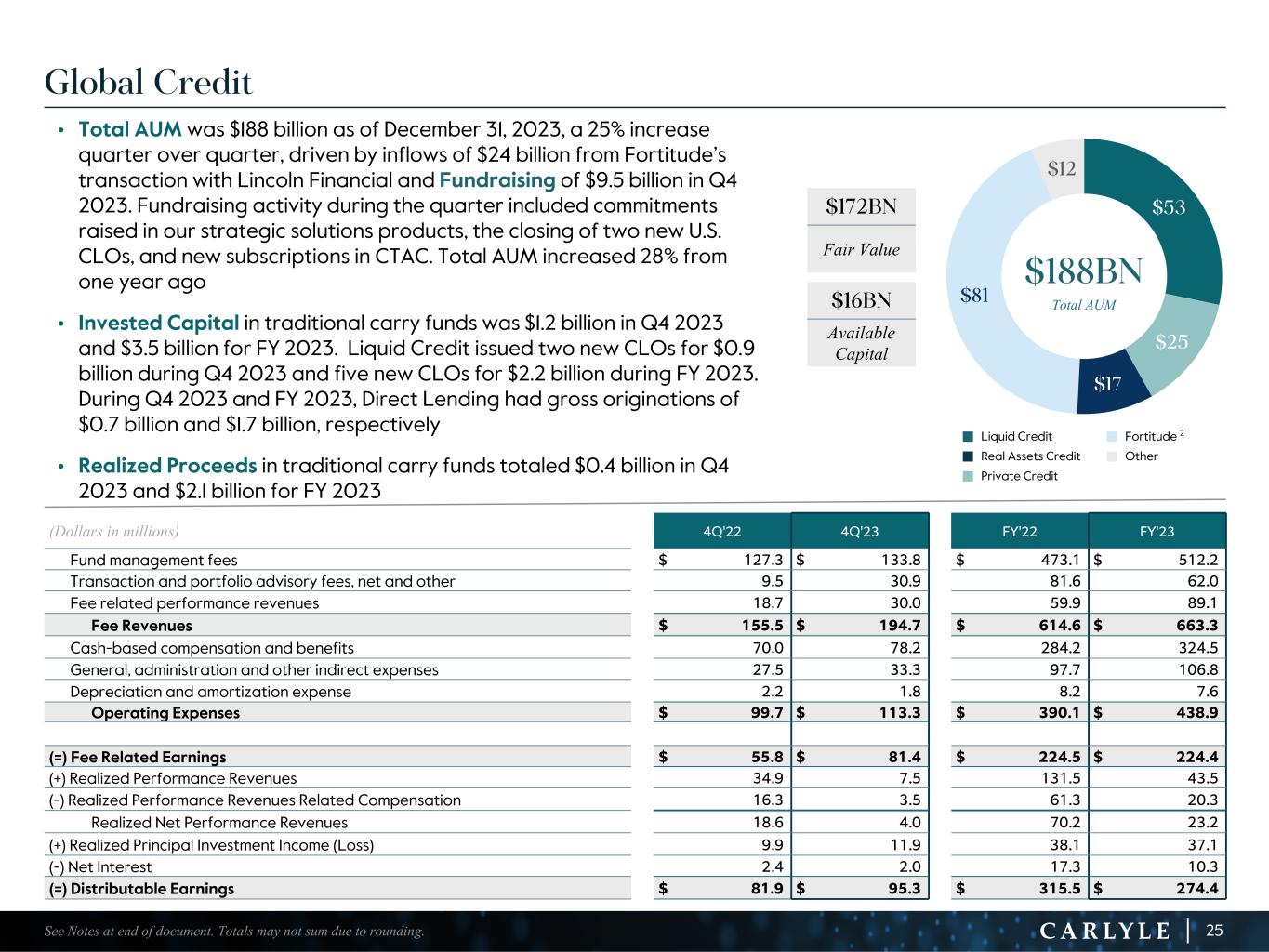 R-14 7 G-19 5 B-19 7 R-88 G-15 9 B-16 5 R-13 6 G-18 0 B-83 R-16 3 G-14 3 B-18 7 R-0 G-74 B-13 6 R-18 5 G-21 1 B-15 3 R-11 8 G-92 B-15 0 R-22 0 G-22 1 B-23 2 R-14 0 G-14 1 B-15 2R-12 0 G-16 9 B-22 2 Old Colors R-88 G-89 B-91 58595B R-23 G-234 B-234 EAEAEA R-208 G-232 B-247 D0E8F7 R-65 G-64 B-66 414042 R-8 G-51 B-94 08335E R-167 G-169 B-171 A7A9AB R-9 G-102 B-112 096670 R-220 G-221 B-222 DCDDDE R-97 G-161 B-224 61A1E0 R-237 G-217 B-157 EDD99D R-147 G-195 B-197 93C3C5 Global Credit • Total AUM was $188 billion as of December 31, 2023, a 25% increase quarter over quarter, driven by inflows of $24 billion from Fortitude’s transaction with Lincoln Financial and Fundraising of $9.5 billion in Q4 2023. Fundraising activity during the quarter included commitments raised in our strategic solutions products, the closing of two new U.S. CLOs, and new subscriptions in CTAC. Total AUM increased 28% from one year ago • Invested Capital in traditional carry funds was $1.2 billion in Q4 2023 and $3.5 billion for FY 2023. Liquid Credit issued two new CLOs for $0.9 billion during Q4 2023 and five new CLOs for $2.2 billion during FY 2023. During Q4 2023 and FY 2023, Direct Lending had gross originations of $0.7 billion and $1.7 billion, respectively • Realized Proceeds in traditional carry funds totaled $0.4 billion in Q4 2023 and $2.1 billion for FY 2023 (Dollars in millions) 4Q'22 4Q'23 FY'22 FY'23 Fund management fees $ 127.3 $ 133.8 $ 473.1 $ 512.2 Transaction and portfolio advisory fees, net and other 9.5 30.9 81.6 62.0 Fee related performance revenues 18.7 30.0 59.9 89.1 Fee Revenues $ 155.5 $ 194.7 $ 614.6 $ 663.3 Cash-based compensation and benefits 70.0 78.2 284.2 324.5 General, administration and other indirect expenses 27.5 33.3 97.7 106.8 Depreciation and amortization expense 2.2 1.8 8.2 7.6 Operating Expenses $ 99.7 $ 113.3 $ 390.1 $ 438.9 (=) Fee Related Earnings $ 55.8 $ 81.4 $ 224.5 $ 224.4 (+) Realized Performance Revenues 34.9 7.5 131.5 43.5 (-) Realized Performance Revenues Related Compensation 16.3 3.5 61.3 20.3 Realized Net Performance Revenues 18.6 4.0 70.2 23.2 (+) Realized Principal Investment Income (Loss) 9.9 11.9 38.1 37.1 (-) Net Interest 2.4 2.0 17.3 10.3 (=) Distributable Earnings $ 81.9 $ 95.3 $ 315.5 $ 274.4 $53 $25 $17 $81 $12 $188BN Total AUM 25See Notes at end of document. Totals may not sum due to rounding. $172BN Fair Value $16BN Available Capital n Liquid Credit n Fortitude 2 n Real Assets Credit n Other n Private Credit