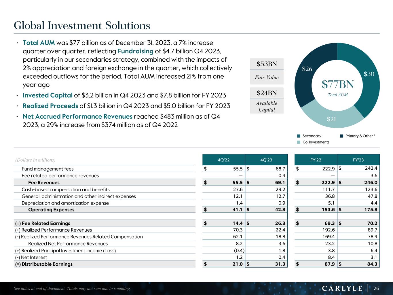 R-14 7 G-19 5 B-19 7 R-88 G-15 9 B-16 5 R-13 6 G-18 0 B-83 R-16 3 G-14 3 B-18 7 R-0 G-74 B-13 6 R-18 5 G-21 1 B-15 3 R-11 8 G-92 B-15 0 R-22 0 G-22 1 B-23 2 R-14 0 G-14 1 B-15 2R-12 0 G-16 9 B-22 2 Old Colors R-88 G-89 B-91 58595B R-23 G-234 B-234 EAEAEA R-208 G-232 B-247 D0E8F7 R-65 G-64 B-66 414042 R-8 G-51 B-94 08335E R-167 G-169 B-171 A7A9AB R-9 G-102 B-112 096670 R-220 G-221 B-222 DCDDDE R-97 G-161 B-224 61A1E0 R-237 G-217 B-157 EDD99D R-147 G-195 B-197 93C3C5 Global Investment Solutions • Total AUM was $77 billion as of December 31, 2023, a 7% increase quarter over quarter, reflecting Fundraising of $4.7 billion Q4 2023, particularly in our secondaries strategy, combined with the impacts of 2% appreciation and foreign exchange in the quarter, which collectively exceeded outflows for the period. Total AUM increased 21% from one year ago • Invested Capital of $3.2 billion in Q4 2023 and $7.8 billion for FY 2023 • Realized Proceeds of $1.3 billion in Q4 2023 and $5.0 billion for FY 2023 • Net Accrued Performance Revenues reached $483 million as of Q4 2023, a 29% increase from $374 million as of Q4 2022 (Dollars in millions) 4Q'22 4Q'23 FY'22 FY'23 Fund management fees $ 55.5 $ 68.7 $ 222.9 $ 242.4 Fee related performance revenues — 0.4 — 3.6 Fee Revenues $ 55.5 $ 69.1 $ 222.9 $ 246.0 Cash-based compensation and benefits 27.6 29.2 111.7 123.6 General, administration and other indirect expenses 12.1 12.7 36.8 47.8 Depreciation and amortization expense 1.4 0.9 5.1 4.4 Operating Expenses $ 41.1 $ 42.8 $ 153.6 $ 175.8 (=) Fee Related Earnings $ 14.4 $ 26.3 $ 69.3 $ 70.2 (+) Realized Performance Revenues 70.3 22.4 192.6 89.7 (-) Realized Performance Revenues Related Compensation 62.1 18.8 169.4 78.9 Realized Net Performance Revenues 8.2 3.6 23.2 10.8 (+) Realized Principal Investment Income (Loss) (0.4) 1.8 3.8 6.4 (-) Net Interest 1.2 0.4 8.4 3.1 (=) Distributable Earnings $ 21.0 $ 31.3 $ 87.9 $ 84.3 $30 $21 $26 $77BN Total AUM 26See notes at end of document. Totals may not sum due to rounding. $53BN Fair Value $24BN Available Capital n Secondary n Primary & Other 3 n Co-Investments
