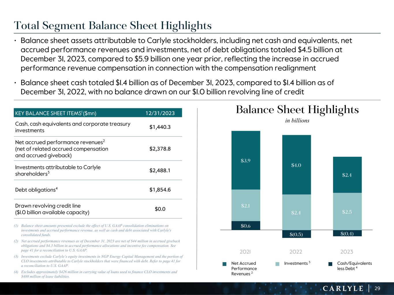 R-14 7 G-19 5 B-19 7 R-88 G-15 9 B-16 5 R-13 6 G-18 0 B-83 R-16 3 G-14 3 B-18 7 R-0 G-74 B-13 6 R-18 5 G-21 1 B-15 3 R-11 8 G-92 B-15 0 R-22 0 G-22 1 B-23 2 R-14 0 G-14 1 B-15 2R-12 0 G-16 9 B-22 2 Old Colors R-88 G-89 B-91 58595B R-23 G-234 B-234 EAEAEA R-208 G-232 B-247 D0E8F7 R-65 G-64 B-66 414042 R-8 G-51 B-94 08335E R-167 G-169 B-171 A7A9AB R-9 G-102 B-112 096670 R-220 G-221 B-222 DCDDDE R-97 G-161 B-224 61A1E0 R-237 G-217 B-157 EDD99D R-147 G-195 B-197 93C3C5 Total Segment Balance Sheet Highlights • Balance sheet assets attributable to Carlyle stockholders, including net cash and equivalents, net accrued performance revenues and investments, net of debt obligations totaled $4.5 billion at December 31, 2023, compared to $5.9 billion one year prior, reflecting the increase in accrued performance revenue compensation in connection with the compensation realignment • Balance sheet cash totaled $1.4 billion as of December 31, 2023, compared to $1.4 billion as of December 31, 2022, with no balance drawn on our $1.0 billion revolving line of credit KEY BALANCE SHEET ITEMS1 ($mn) 12/31/2023 Cash, cash equivalents and corporate treasury investments $1,440.3 Net accrued performance revenues2 (net of related accrued compensation and accrued giveback) $2,378.8 Investments attributable to Carlyle shareholders3 $2,488.1 Debt obligations4 $1,854.6 Drawn revolving credit line ($1.0 billion available capacity) $0.0 (1) Balance sheet amounts presented exclude the effect of U.S. GAAP consolidation eliminations on investments and accrued performance revenue, as well as cash and debt associated with Carlyle's consolidated funds. (2) Net accrued performance revenues as of December 31, 2023 are net of $44 million in accrued giveback obligations and $4.3 billion in accrued performance allocations and incentive fee compensation. See page 41 for a reconciliation to U.S. GAAP. (3) Investments exclude Carlyle’s equity investments in NGP Energy Capital Management and the portion of CLO investments attributable to Carlyle stockholders that were financed with debt. Refer to page 41 for a reconciliation to U.S. GAAP. (4) Excludes approximately $426 million in carrying value of loans used to finance CLO investments and $488 million of lease liabilities. $0.6 $(0.5) $(0.4) $2.1 $2.4 $2.5 $3.9 $4.0 $2.4 2021 2022 2023 29 Balance Sheet Highlights in billions n Net Accrued Performance Revenues 2 n Investments 3 n Cash/Equivalents less Debt 4