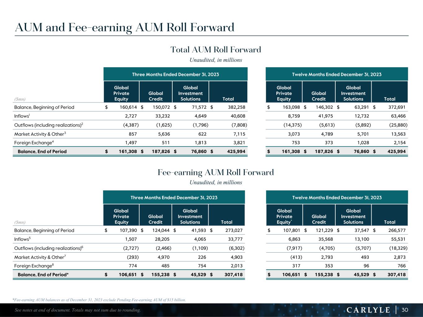 R-14 7 G-19 5 B-19 7 R-88 G-15 9 B-16 5 R-13 6 G-18 0 B-83 R-16 3 G-14 3 B-18 7 R-0 G-74 B-13 6 R-18 5 G-21 1 B-15 3 R-11 8 G-92 B-15 0 R-22 0 G-22 1 B-23 2 R-14 0 G-14 1 B-15 2R-12 0 G-16 9 B-22 2 Old Colors R-88 G-89 B-91 58595B R-23 G-234 B-234 EAEAEA R-208 G-232 B-247 D0E8F7 R-65 G-64 B-66 414042 R-8 G-51 B-94 08335E R-167 G-169 B-171 A7A9AB R-9 G-102 B-112 096670 R-220 G-221 B-222 DCDDDE R-97 G-161 B-224 61A1E0 R-237 G-217 B-157 EDD99D R-147 G-195 B-197 93C3C5 AUM and Fee-earning AUM Roll Forward Total AUM Roll Forward Unaudited, in millions Three Months Ended December 31, 2023 Twelve Months Ended December 31, 2023 ($mn) Global Private Equity Global Credit Global Investment Solutions Total Global Private Equity Global Credit Global Investment Solutions Total Balance, Beginning of Period $ 160,614 $ 150,072 $ 71,572 $ 382,258 $ 163,098 $ 146,302 $ 63,291 $ 372,691 Inflows1 2,727 33,232 4,649 40,608 8,759 41,975 12,732 63,466 Outflows (including realizations)2 (4,387) (1,625) (1,796) (7,808) (14,375) (5,613) (5,892) (25,880) Market Activity & Other3 857 5,636 622 7,115 3,073 4,789 5,701 13,563 Foreign Exchange4 1,497 511 1,813 3,821 753 373 1,028 2,154 Balance, End of Period $ 161,308 $ 187,826 $ 76,860 $ 425,994 $ 161,308 $ 187,826 $ 76,860 $ 425,994 Fee-earning AUM Roll Forward Unaudited, in millions Three Months Ended December 31, 2023 Twelve Months Ended December 31, 2023 ($mn) Global Private Equity Global Credit Global Investment Solutions Total Global Private Equity* Global Credit Global Investment Solutions Total Balance, Beginning of Period $ 107,390 $ 124,044 $ 41,593 $ 273,027 $ 107,801 $ 121,229 $ 37,547 $ 266,577 Inflows5 1,507 28,205 4,065 33,777 6,863 35,568 13,100 55,531 Outflows (including realizations)6 (2,727) (2,466) (1,109) (6,302) (7,917) (4,705) (5,707) (18,329) Market Activity & Other7 (293) 4,970 226 4,903 (413) 2,793 493 2,873 Foreign Exchange8 774 485 754 2,013 317 353 96 766 Balance, End of Period* $ 106,651 $ 155,238 $ 45,529 $ 307,418 $ 106,651 $ 155,238 $ 45,529 $ 307,418 30See notes at end of document. Totals may not sum due to rounding. *Fee-earning AUM balances as of December 31, 2023 exclude Pending Fee-earning AUM of $15 billion.