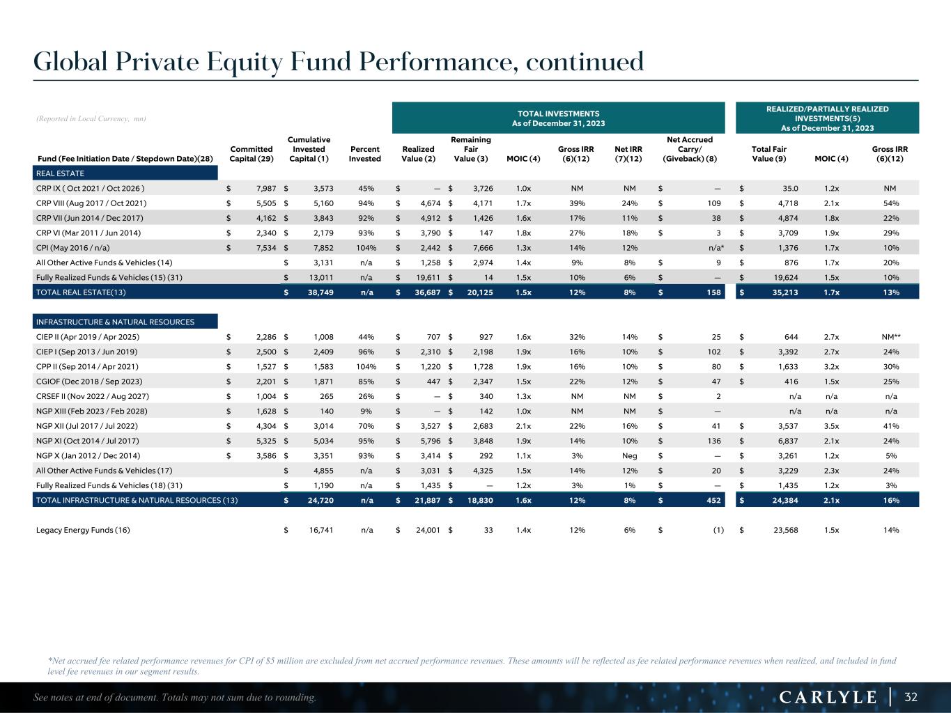 R-14 7 G-19 5 B-19 7 R-88 G-15 9 B-16 5 R-13 6 G-18 0 B-83 R-16 3 G-14 3 B-18 7 R-0 G-74 B-13 6 R-18 5 G-21 1 B-15 3 R-11 8 G-92 B-15 0 R-22 0 G-22 1 B-23 2 R-14 0 G-14 1 B-15 2R-12 0 G-16 9 B-22 2 Old Colors R-88 G-89 B-91 58595B R-23 G-234 B-234 EAEAEA R-208 G-232 B-247 D0E8F7 R-65 G-64 B-66 414042 R-8 G-51 B-94 08335E R-167 G-169 B-171 A7A9AB R-9 G-102 B-112 096670 R-220 G-221 B-222 DCDDDE R-97 G-161 B-224 61A1E0 R-237 G-217 B-157 EDD99D R-147 G-195 B-197 93C3C5 Global Private Equity Fund Performance, continued (Reported in Local Currency, mn) TOTAL INVESTMENTS As of December 31, 2023 REALIZED/PARTIALLY REALIZED INVESTMENTS(5) As of December 31, 2023 Fund (Fee Initiation Date / Stepdown Date)(28) Committed Capital (29) Cumulative Invested Capital (1) Percent Invested Realized Value (2) Remaining Fair Value (3) MOIC (4) Gross IRR (6)(12) Net IRR (7)(12) Net Accrued Carry/ (Giveback) (8) Total Fair Value (9) MOIC (4) Gross IRR (6)(12) REAL ESTATE CRP IX ( Oct 2021 / Oct 2026 ) $ 7,987 $ 3,573 45% $ — $ 3,726 1.0x NM NM $ — $ 35.0 1.2x NM CRP VIII (Aug 2017 / Oct 2021) $ 5,505 $ 5,160 94% $ 4,674 $ 4,171 1.7x 39% 24% $ 109 $ 4,718 2.1x 54% CRP VII (Jun 2014 / Dec 2017) $ 4,162 $ 3,843 92% $ 4,912 $ 1,426 1.6x 17% 11% $ 38 $ 4,874 1.8x 22% CRP VI (Mar 2011 / Jun 2014) $ 2,340 $ 2,179 93% $ 3,790 $ 147 1.8x 27% 18% $ 3 $ 3,709 1.9x 29% CPI (May 2016 / n/a) $ 7,534 $ 7,852 104% $ 2,442 $ 7,666 1.3x 14% 12% n/a* $ 1,376 1.7x 10% All Other Active Funds & Vehicles (14) $ 3,131 n/a $ 1,258 $ 2,974 1.4x 9% 8% $ 9 $ 876 1.7x 20% Fully Realized Funds & Vehicles (15) (31) $ 13,011 n/a $ 19,611 $ 14 1.5x 10% 6% $ — $ 19,624 1.5x 10% TOTAL REAL ESTATE(13) $ 38,749 n/a $ 36,687 $ 20,125 1.5x 12% 8% $ 158 $ 35,213 1.7x 13% INFRASTRUCTURE & NATURAL RESOURCES CIEP II (Apr 2019 / Apr 2025) $ 2,286 $ 1,008 44% $ 707 $ 927 1.6x 32% 14% $ 25 $ 644 2.7x NM** CIEP I (Sep 2013 / Jun 2019) $ 2,500 $ 2,409 96% $ 2,310 $ 2,198 1.9x 16% 10% $ 102 $ 3,392 2.7x 24% CPP II (Sep 2014 / Apr 2021) $ 1,527 $ 1,583 104% $ 1,220 $ 1,728 1.9x 16% 10% $ 80 $ 1,633 3.2x 30% CGIOF (Dec 2018 / Sep 2023) $ 2,201 $ 1,871 85% $ 447 $ 2,347 1.5x 22% 12% $ 47 $ 416 1.5x 25% CRSEF II (Nov 2022 / Aug 2027) $ 1,004 $ 265 26% $ — $ 340 1.3x NM NM $ 2 n/a n/a n/a NGP XIII (Feb 2023 / Feb 2028) $ 1,628 $ 140 9% $ — $ 142 1.0x NM NM $ — n/a n/a n/a NGP XII (Jul 2017 / Jul 2022) $ 4,304 $ 3,014 70% $ 3,527 $ 2,683 2.1x 22% 16% $ 41 $ 3,537 3.5x 41% NGP XI (Oct 2014 / Jul 2017) $ 5,325 $ 5,034 95% $ 5,796 $ 3,848 1.9x 14% 10% $ 136 $ 6,837 2.1x 24% NGP X (Jan 2012 / Dec 2014) $ 3,586 $ 3,351 93% $ 3,414 $ 292 1.1x 3% Neg $ — $ 3,261 1.2x 5% All Other Active Funds & Vehicles (17) $ 4,855 n/a $ 3,031 $ 4,325 1.5x 14% 12% $ 20 $ 3,229 2.3x 24% Fully Realized Funds & Vehicles (18) (31) $ 1,190 n/a $ 1,435 $ — 1.2x 3% 1% $ — $ 1,435 1.2x 3% TOTAL INFRASTRUCTURE & NATURAL RESOURCES (13) $ 24,720 n/a $ 21,887 $ 18,830 1.6x 12% 8% $ 452 $ 24,384 2.1x 16% Legacy Energy Funds (16) $ 16,741 n/a $ 24,001 $ 33 1.4x 12% 6% $ (1) $ 23,568 1.5x 14% 32See notes at end of document. Totals may not sum due to rounding. *Net accrued fee related performance revenues for CPI of $5 million are excluded from net accrued performance revenues. These amounts will be reflected as fee related performance revenues when realized, and included in fund level fee revenues in our segment results.