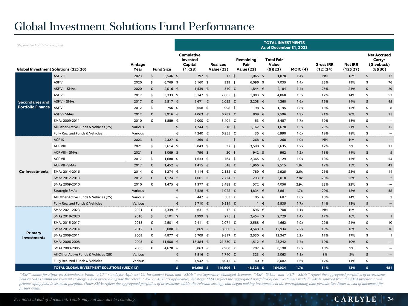 R-14 7 G-19 5 B-19 7 R-88 G-15 9 B-16 5 R-13 6 G-18 0 B-83 R-16 3 G-14 3 B-18 7 R-0 G-74 B-13 6 R-18 5 G-21 1 B-15 3 R-11 8 G-92 B-15 0 R-22 0 G-22 1 B-23 2 R-14 0 G-14 1 B-15 2R-12 0 G-16 9 B-22 2 Old Colors R-88 G-89 B-91 58595B R-23 G-234 B-234 EAEAEA R-208 G-232 B-247 D0E8F7 R-65 G-64 B-66 414042 R-8 G-51 B-94 08335E R-167 G-169 B-171 A7A9AB R-9 G-102 B-112 096670 R-220 G-221 B-222 DCDDDE R-97 G-161 B-224 61A1E0 R-237 G-217 B-157 EDD99D R-147 G-195 B-197 93C3C5 Global Credit Fund Performance (Carry Funds Only) 33 ($ mn) TOTAL INVESTMENTS As of December 31, 2023 Fund (Fee Initiation Date / Stepdown Date) (28) Committed Capital (29) Cumulative Invested Capital (19) Percent Invested Realized Value (2) Remaining Fair Value (3) MOIC (4) Gross IRR (6)(12) Net IRR (7)(12) Net Accrued Carry/(Giveback) (8) GLOBAL CREDIT CARRY FUNDS CCOF III (Feb 2023 / Jun 2028) $ 2,273 $ 896 39% $ 14 $ 949 1.1x NM NM $ 1 CCOF II (Nov 2020 / Oct 2025) $ 4,430 $ 5,148 116% $ 1,073 $ 5,228 1.2x 16% 11% $ 65 CCOF I (Nov 2017 / Sep 2022) $ 2,373 $ 3,471 146% $ 3,005 $ 1,740 1.4x 17% 12% $ 27 CSP IV (Apr 2016 / Dec 2020) $ 2,500 $ 2,500 100% $ 948 $ 2,319 1.3x 11% 5% $ — CSP III (Dec 2011 / Aug 2015) $ 703 $ 703 100% $ 931 $ 31 1.4x 18% 8% $ — CEMOF II (Dec 2015 / Jun 2019) $ 1,692 $ 1,713 101% $ 1,841 $ 333 1.3x 7% 3% $ — SASOF III (Nov 2014 / n/a) $ 833 $ 991 119% $ 1,197 $ 63 1.3x 18% 10% $ 5 All Other Active Funds & Vehicles (20) $ 9,828 n/a $ 2,208 $ 8,256 1.1x 4% 3% $ 20 Fully Realized Funds & Vehicles (21) (31) $ 6,625 n/a $ 8,190 $ — 1.2x 9% 3% $ — TOTAL GLOBAL CREDIT CARRY FUNDS $ 31,875 n/a $ 19,406 $ 18,918 1.2x 10% 5% $ 118 See notes at end of document. Totals may not sum due to rounding.