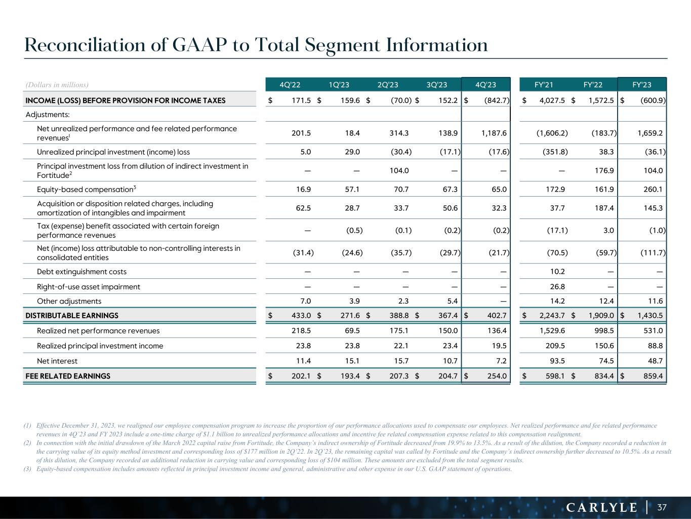 R-14 7 G-19 5 B-19 7 R-88 G-15 9 B-16 5 R-13 6 G-18 0 B-83 R-16 3 G-14 3 B-18 7 R-0 G-74 B-13 6 R-18 5 G-21 1 B-15 3 R-11 8 G-92 B-15 0 R-22 0 G-22 1 B-23 2 R-14 0 G-14 1 B-15 2R-12 0 G-16 9 B-22 2 Old Colors R-88 G-89 B-91 58595B R-23 G-234 B-234 EAEAEA R-208 G-232 B-247 D0E8F7 R-65 G-64 B-66 414042 R-8 G-51 B-94 08335E R-167 G-169 B-171 A7A9AB R-9 G-102 B-112 096670 R-220 G-221 B-222 DCDDDE R-97 G-161 B-224 61A1E0 R-237 G-217 B-157 EDD99D R-147 G-195 B-197 93C3C5 Reconciliation of GAAP to Total Segment Information (1) Effective December 31, 2023, we realigned our employee compensation program to increase the proportion of our performance allocations used to compensate our employees. Net realized performance and fee related performance revenues in 4Q’23 and FY 2023 include a one-time charge of $1.1 billion to unrealized performance allocations and incentive fee related compensation expense related to this compensation realignment. (2) In connection with the initial drawdown of the March 2022 capital raise from Fortitude, the Company’s indirect ownership of Fortitude decreased from 19.9% to 13.5%. As a result of the dilution, the Company recorded a reduction in the carrying value of its equity method investment and corresponding loss of $177 million in 2Q’22. In 2Q’23, the remaining capital was called by Fortitude and the Company’s indirect ownership further decreased to 10.5%. As a result of this dilution, the Company recorded an additional reduction in carrying value and corresponding loss of $104 million. These amounts are excluded from the total segment results. (3) Equity-based compensation includes amounts reflected in principal investment income and general, administrative and other expense in our U.S. GAAP statement of operations. (Dollars in millions) 4Q'22 1Q'23 2Q'23 3Q'23 4Q'23 FY'21 FY'22 FY'23 INCOME (LOSS) BEFORE PROVISION FOR INCOME TAXES $ 171.5 $ 159.6 $ (70.0) $ 152.2 $ (842.7) $ 4,027.5 $ 1,572.5 $ (600.9) Adjustments: Net unrealized performance and fee related performance revenues1 201.5 18.4 314.3 138.9 1,187.6 (1,606.2) (183.7) 1,659.2 Unrealized principal investment (income) loss 5.0 29.0 (30.4) (17.1) (17.6) (351.8) 38.3 (36.1) Principal investment loss from dilution of indirect investment in Fortitude2 — — 104.0 — — — 176.9 104.0 Equity-based compensation3 16.9 57.1 70.7 67.3 65.0 172.9 161.9 260.1 Acquisition or disposition related charges, including amortization of intangibles and impairment 62.5 28.7 33.7 50.6 32.3 37.7 187.4 145.3 Tax (expense) benefit associated with certain foreign performance revenues — (0.5) (0.1) (0.2) (0.2) (17.1) 3.0 (1.0) Net (income) loss attributable to non-controlling interests in consolidated entities (31.4) (24.6) (35.7) (29.7) (21.7) (70.5) (59.7) (111.7) Debt extinguishment costs — — — — — 10.2 — — Right-of-use asset impairment — — — — — 26.8 — — Other adjustments 7.0 3.9 2.3 5.4 — 14.2 12.4 11.6 DISTRIBUTABLE EARNINGS $ 433.0 $ 271.6 $ 388.8 $ 367.4 $ 402.7 $ 2,243.7 $ 1,909.0 $ 1,430.5 Realized net performance revenues 218.5 69.5 175.1 150.0 136.4 1,529.6 998.5 531.0 Realized principal investment income 23.8 23.8 22.1 23.4 19.5 209.5 150.6 88.8 Net interest 11.4 15.1 15.7 10.7 7.2 93.5 74.5 48.7 FEE RELATED EARNINGS $ 202.1 $ 193.4 $ 207.3 $ 204.7 $ 254.0 $ 598.1 $ 834.4 $ 859.4 37