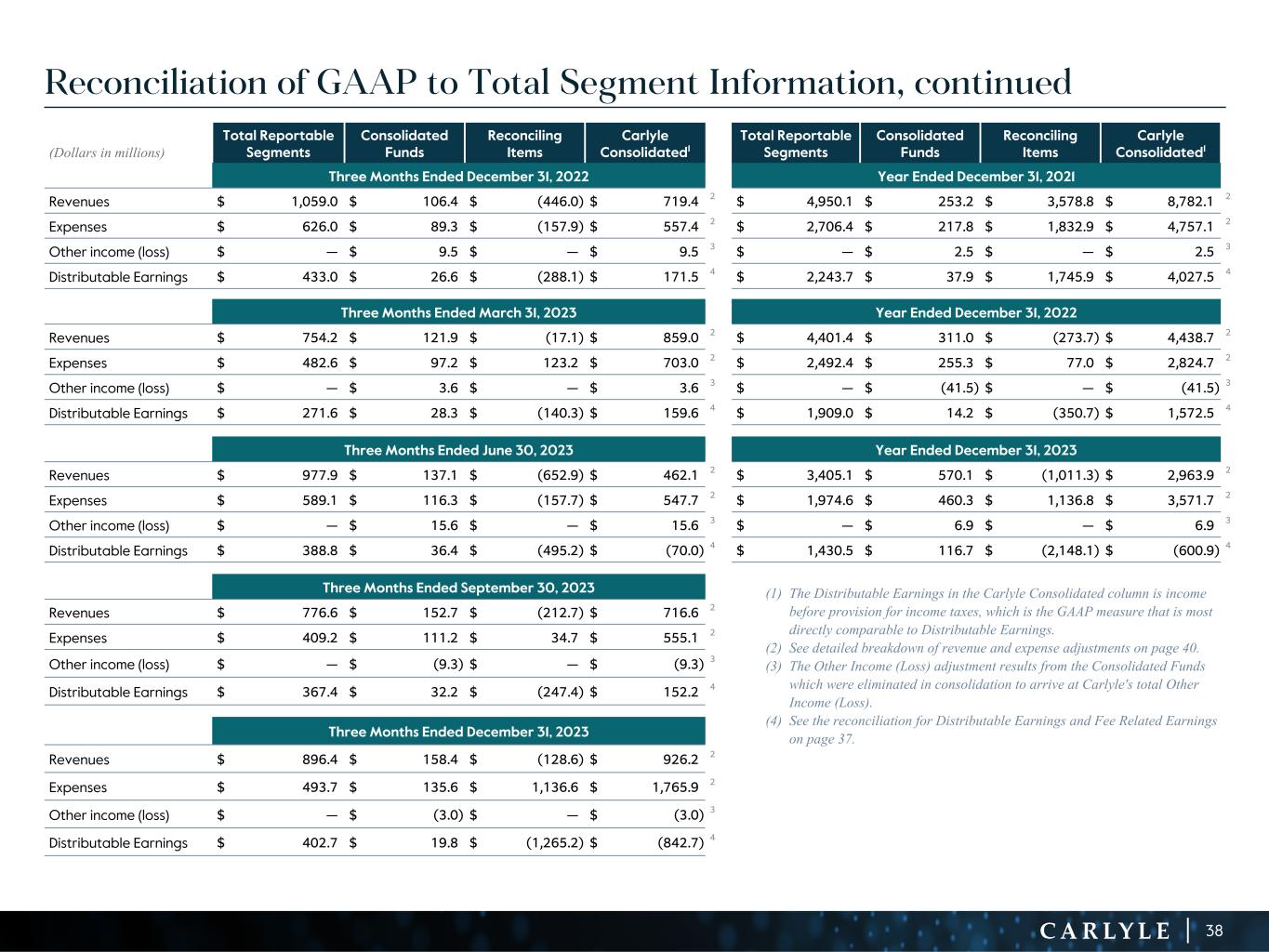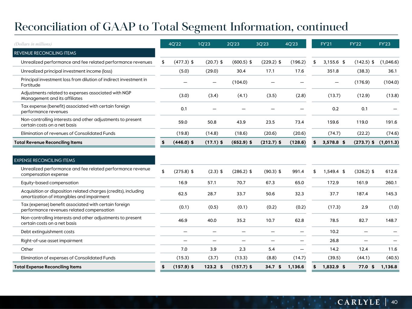 R-14 7 G-19 5 B-19 7 R-88 G-15 9 B-16 5 R-13 6 G-18 0 B-83 R-16 3 G-14 3 B-18 7 R-0 G-74 B-13 6 R-18 5 G-21 1 B-15 3 R-11 8 G-92 B-15 0 R-22 0 G-22 1 B-23 2 R-14 0 G-14 1 B-15 2R-12 0 G-16 9 B-22 2 Old Colors R-88 G-89 B-91 58595B R-23 G-234 B-234 EAEAEA R-208 G-232 B-247 D0E8F7 R-65 G-64 B-66 414042 R-8 G-51 B-94 08335E R-167 G-169 B-171 A7A9AB R-9 G-102 B-112 096670 R-220 G-221 B-222 DCDDDE R-97 G-161 B-224 61A1E0 R-237 G-217 B-157 EDD99D R-147 G-195 B-197 93C3C5 Reconciliation of GAAP to Total Segment Information, continued 39 (Dollars in millions) Carlyle Consolidated Reconciling Items 1 Total Reportable Segments Carlyle Consolidated Reconciling Items 1 Total Reportable Segments Three Months Ended December 31, 2022 Year Ended December 31, 2021 Performance revenues $ (18.7) $ 478.4 $ 459.7 $ 6,084.6 $ (3,146.0) $ 2,938.6 Performance revenues related compensation expense $ (21.3) $ 262.5 $ 241.2 $ 2,961.0 $ (1,552.0) $ 1,409.0 Net performance revenues $ 2.6 $ 215.9 $ 218.5 $ 3,123.6 $ (1,594.0) $ 1,529.6 Principal investment income (loss) $ 70.0 $ (46.2) $ 23.8 $ 637.3 $ (427.8) $ 209.5 Three Months Ended March 31, 2023 Year Ended December 31, 2022 Performance revenues $ 160.8 $ 4.3 $ 165.1 $ 1,327.5 $ 653.2 $ 1,980.7 Performance revenues related compensation expense $ 105.7 $ (10.1) $ 95.6 $ 719.9 $ 262.3 $ 982.2 Net performance revenues $ 55.1 $ 14.4 $ 69.5 $ 607.6 $ 390.9 $ 998.5 Principal investment income (loss) $ 11.7 $ 12.1 $ 23.8 $ 570.5 $ (419.9) $ 150.6 Three Months Ended June 30, 2023 Year Ended December 31, 2023 Performance revenues $ (246.8) $ 581.9 $ 335.1 $ (88.6) $ 1,026.9 $ 938.3 Performance revenues related compensation expense $ (92.2) $ 252.2 $ 160.0 $ 1,103.7 $ (696.4) $ 407.3 Net performance revenues $ (154.6) $ 329.7 $ 175.1 $ (1,192.3) $ 1,723.3 $ 531.0 Principal investment income (loss) $ (7.2) $ 29.3 $ 22.1 $ 133.4 $ (44.6) $ 88.8 Three Months Ended September 30, 2023 Performance revenues $ (118.3) $ 298.7 $ 180.4 Performance revenues related compensation expense $ (53.9) $ 84.3 $ 30.4 Net performance revenues $ (64.4) $ 214.4 $ 150.0 Principal investment income (loss) $ 100.6 $ (77.2) $ 23.4 Three Months Ended December 31, 2023 Performance revenues $ 115.7 $ 142.0 $ 257.7 Performance revenues related compensation expense $ 1,144.1 $ (1,022.8) $ 121.3 Net performance revenues $ (1,028.4) $ 1,164.8 $ 136.4 Principal investment income (loss) $ 28.3 $ (8.8) $ 19.5 See notes at end of document.