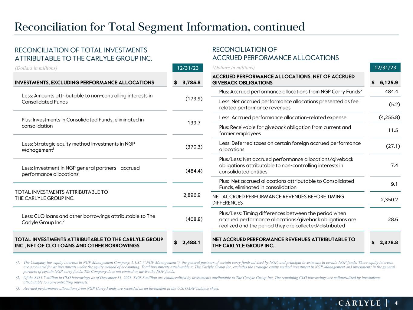 R-14 7 G-19 5 B-19 7 R-88 G-15 9 B-16 5 R-13 6 G-18 0 B-83 R-16 3 G-14 3 B-18 7 R-0 G-74 B-13 6 R-18 5 G-21 1 B-15 3 R-11 8 G-92 B-15 0 R-22 0 G-22 1 B-23 2 R-14 0 G-14 1 B-15 2R-12 0 G-16 9 B-22 2 Old Colors R-88 G-89 B-91 58595B R-23 G-234 B-234 EAEAEA R-208 G-232 B-247 D0E8F7 R-65 G-64 B-66 414042 R-8 G-51 B-94 08335E R-167 G-169 B-171 A7A9AB R-9 G-102 B-112 096670 R-220 G-221 B-222 DCDDDE R-97 G-161 B-224 61A1E0 R-237 G-217 B-157 EDD99D R-147 G-195 B-197 93C3C5 Reconciliation for Total Segment Information, continued (1) The Company has equity interests in NGP Management Company, L.L.C. (“NGP Management”), the general partners of certain carry funds advised by NGP, and principal investments in certain NGP funds. These equity interests are accounted for as investments under the equity method of accounting. Total investments attributable to The Carlyle Group Inc. excludes the strategic equity method investment in NGP Management and investments in the general partners of certain NGP carry funds. The Company does not control or advise the NGP funds. (2) Of the $431.7 million in CLO borrowings as of December 31, 2023, $408.8 million are collateralized by investments attributable to The Carlyle Group Inc. The remaining CLO borrowings are collateralized by investments attributable to non-controlling interests. (3) Accrued performance allocations from NGP Carry Funds are recorded as an investment in the U.S. GAAP balance sheet. RECONCILIATION OF TOTAL INVESTMENTS ATTRIBUTABLE TO THE CARLYLE GROUP INC. (Dollars in millions) 12/31/23 INVESTMENTS, EXCLUDING PERFORMANCE ALLOCATIONS $ 3,785.8 Less: Amounts attributable to non-controlling interests in Consolidated Funds (173.9) Plus: Investments in Consolidated Funds, eliminated in consolidation 139.7 Less: Strategic equity method investments in NGP Management1 (370.3) Less: Investment in NGP general partners - accrued performance allocations1 (484.4) TOTAL INVESTMENTS ATTRIBUTABLE TO THE CARLYLE GROUP INC. 2,896.9 Less: CLO loans and other borrowings attributable to The Carlyle Group Inc.2 (408.8) TOTAL INVESTMENTS ATTRIBUTABLE TO THE CARLYLE GROUP INC., NET OF CLO LOANS AND OTHER BORROWINGS $ 2,488.1 RECONCILIATION OF ACCRUED PERFORMANCE ALLOCATIONS (Dollars in millions) 12/31/23 ACCRUED PERFORMANCE ALLOCATIONS, NET OF ACCRUED GIVEBACK OBLIGATIONS $ 6,125.9 Plus: Accrued performance allocations from NGP Carry Funds3 484.4 Less: Net accrued performance allocations presented as fee related performance revenues (5.2) Less: Accrued performance allocation-related expense (4,255.8) Plus: Receivable for giveback obligation from current and former employees 11.5 Less: Deferred taxes on certain foreign accrued performance allocations (27.1) Plus/Less: Net accrued performance allocations/giveback obligations attributable to non-controlling interests in consolidated entities 7.4 Plus: Net accrued allocations attributable to Consolidated Funds, eliminated in consolidation 9.1 NET ACCRUED PERFORMANCE REVENUES BEFORE TIMING DIFFERENCES 2,350.2 Plus/Less: Timing differences between the period when accrued performance allocations/giveback obligations are realized and the period they are collected/distributed 28.6 NET ACCRUED PERFORMANCE REVENUES ATTRIBUTABLE TO THE CARLYLE GROUP INC. $ 2,378.8 41