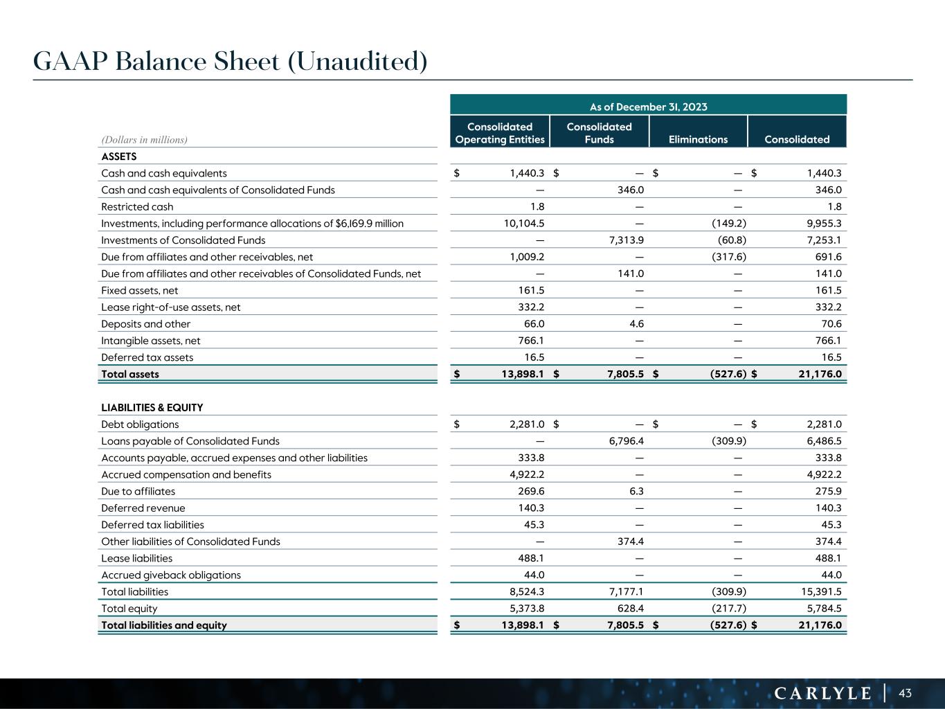 R-14 7 G-19 5 B-19 7 R-88 G-15 9 B-16 5 R-13 6 G-18 0 B-83 R-16 3 G-14 3 B-18 7 R-0 G-74 B-13 6 R-18 5 G-21 1 B-15 3 R-11 8 G-92 B-15 0 R-22 0 G-22 1 B-23 2 R-14 0 G-14 1 B-15 2R-12 0 G-16 9 B-22 2 Old Colors R-88 G-89 B-91 58595B R-23 G-234 B-234 EAEAEA R-208 G-232 B-247 D0E8F7 R-65 G-64 B-66 414042 R-8 G-51 B-94 08335E R-167 G-169 B-171 A7A9AB R-9 G-102 B-112 096670 R-220 G-221 B-222 DCDDDE R-97 G-161 B-224 61A1E0 R-237 G-217 B-157 EDD99D R-147 G-195 B-197 93C3C5 As of December 31, 2023 (Dollars in millions) Consolidated Operating Entities Consolidated Funds Eliminations Consolidated ASSETS Cash and cash equivalents $ 1,440.3 $ — $ — $ 1,440.3 Cash and cash equivalents of Consolidated Funds — 346.0 — 346.0 Restricted cash 1.8 — — 1.8 Investments, including performance allocations of $6,169.9 million 10,104.5 — (149.2) 9,955.3 Investments of Consolidated Funds — 7,313.9 (60.8) 7,253.1 Due from affiliates and other receivables, net 1,009.2 — (317.6) 691.6 Due from affiliates and other receivables of Consolidated Funds, net — 141.0 — 141.0 Fixed assets, net 161.5 — — 161.5 Lease right-of-use assets, net 332.2 — — 332.2 Deposits and other 66.0 4.6 — 70.6 Intangible assets, net 766.1 — — 766.1 Deferred tax assets 16.5 — — 16.5 Total assets $ 13,898.1 $ 7,805.5 $ (527.6) $ 21,176.0 LIABILITIES & EQUITY Debt obligations $ 2,281.0 $ — $ — $ 2,281.0 Loans payable of Consolidated Funds — 6,796.4 (309.9) 6,486.5 Accounts payable, accrued expenses and other liabilities 333.8 — — 333.8 Accrued compensation and benefits 4,922.2 — — 4,922.2 Due to affiliates 269.6 6.3 — 275.9 Deferred revenue 140.3 — — 140.3 Deferred tax liabilities 45.3 — — 45.3 Other liabilities of Consolidated Funds — 374.4 — 374.4 Lease liabilities 488.1 — — 488.1 Accrued giveback obligations 44.0 — — 44.0 Total liabilities 8,524.3 7,177.1 (309.9) 15,391.5 Total equity 5,373.8 628.4 (217.7) 5,784.5 Total liabilities and equity $ 13,898.1 $ 7,805.5 $ (527.6) $ 21,176.0 GAAP Balance Sheet (Unaudited) 43