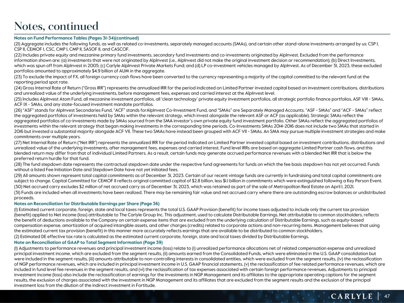 R-14 7 G-19 5 B-19 7 R-88 G-15 9 B-16 5 R-13 6 G-18 0 B-83 R-16 3 G-14 3 B-18 7 R-0 G-74 B-13 6 R-18 5 G-21 1 B-15 3 R-11 8 G-92 B-15 0 R-22 0 G-22 1 B-23 2 R-14 0 G-14 1 B-15 2R-12 0 G-16 9 B-22 2 Old Colors R-88 G-89 B-91 58595B R-23 G-234 B-234 EAEAEA R-208 G-232 B-247 D0E8F7 R-65 G-64 B-66 414042 R-8 G-51 B-94 08335E R-167 G-169 B-171 A7A9AB R-9 G-102 B-112 096670 R-220 G-221 B-222 DCDDDE R-97 G-161 B-224 61A1E0 R-237 G-217 B-157 EDD99D R-147 G-195 B-197 93C3C5 Notes, continued Notes on Fund Performance Tables (Pages 31-34)(continued) (21) Aggregate includes the following funds, as well as related co-investments, separately managed accounts (SMAs), and certain other stand-alone investments arranged by us: CSP I, CSP II, CEMOF I, CSC, CMP I, CMP II, SASOF II, and CASCOF. (22) Includes private equity and mezzanine primary fund investments, secondary fund investments and co-investments originated by AlpInvest. Excluded from the performance information shown are: (a) investments that were not originated by AlpInvest (i.e., AlpInvest did not make the original investment decision or recommendation); (b) Direct Investments, which was spun off from AlpInvest in 2005; (c) Carlyle AlpInvest Private Markets Fund; and (d) LP co-investment vehicles managed by AlpInvest. As of December 31, 2023, these excluded portfolios amounted to approximately $4.9 billion of AUM in the aggregate. (23) To exclude the impact of FX, all foreign currency cash flows have been converted to the currency representing a majority of the capital committed to the relevant fund at the reporting period spot rate. (24) Gross Internal Rate of Return (“Gross IRR”) represents the annualized IRR for the period indicated on Limited Partner invested capital based on investment contributions, distributions and unrealized value of the underlying investments, before management fees, expenses and carried interest at the AlpInvest level. (25) Includes AlpInvest Atom Fund, all mezzanine investment portfolios, all ‘clean technology’ private equity investment portfolios, all strategic portfolio finance portfolios, ASF VIII - SMAs, ACF IX - SMAs, and any state-focused investment mandate portfolios. (26) “ASF” stands for AlpInvest Secondaries Fund, “ACF” stands forAlpInvest Co-Investment Fund, and “SMAs” are Separately Managed Accounts. “ASF - SMAs” and “ACF - SMAs” reflect the aggregated portfolios of investments held by SMAs within the relevant strategy, which invest alongside the relevant ASF or ACF (as applicable). Strategic SMAs reflect the aggregated portfolios of co-investments made by SMAs sourced from the SMA investor’s own private equity fund investment portfolio. Other SMAs reflect the aggregated portfolios of investments within the relevant strategy that began making investments in the corresponding time periods. Co-Investments SMAs 2014-2016 does not include two SMAs that started in 2016 but invested a substantial majority alongside ACF VII. These two SMAs have instead been grouped with ACF VII - SMAs. An SMA may pursue multiple investment strategies and make commitments over multiple years. (27) Net Internal Rate of Return (“Net IRR”) represents the annualized IRR for the period indicated on Limited Partner invested capital based on investment contributions, distributions and unrealized value of the underlying investments, after management fees, expenses and carried interest. Fund level IRRs are based on aggregate Limited Partner cash flows, and this blended return may differ from that of individual Limited Partners. As a result, certain funds may generate accrued performance revenues with a blended Net IRR that is below the preferred return hurdle for that fund. (28) The fund stepdown date represents the contractual stepdown date under the respective fund agreements for funds on which the fee basis stepdown has not yet occurred. Funds without a listed Fee Initiation Date and Stepdown Date have not yet initiated fees. (29) All amounts shown represent total capital commitments as of December 31, 2023. Certain of our recent vintage funds are currently in fundraising and total capital commitments are subject to change. Capital Committed for CEMOF II reflects original committed capital of $2.8 billion, less $1.1 billion in commitments which were extinguished following a Key Person Event. (30) Net accrued carry excludes $2 million of net accrued carry as of December 31, 2023, which was retained as part of the sale of Metropolitan Real Estate on April 1, 2021. (31) Funds are included when all investments have been realized. There may be remaining fair value and net accrued carry where there are outstanding escrow balances or undistributed proceeds. Notes on Reconciliation for Distributable Earnings per Share (Page 36) (1) Estimated current corporate, foreign, state and local taxes represents the total U.S. GAAP Provision (benefit) for income taxes adjusted to include only the current tax provision (benefit) applied to Net income (loss) attributable to The Carlyle Group Inc. This adjustment, used to calculate Distributable Earnings, Net attributable to common stockholders, reflects the benefit of deductions available to the Company on certain expense items that are excluded from the underlying calculation of Distributable Earnings, such as equity-based compensation expense, amortization of acquired intangible assets, and other charges (credits) related to corporate actions and non-recurring items. Management believes that using the estimated current tax provision (benefit) in this manner more accurately reflects earnings that are available to be distributed to common stockholders. (2) Estimated DE effective tax rate is calculated as the estimated current corporate, foreign, state and local taxes divided by Distributable Earnings. Note on Reconciliation of GAAP to Total Segment Information (Page 39) (1) Adjustments to performance revenues and principal investment income (loss) relate to (i) unrealize