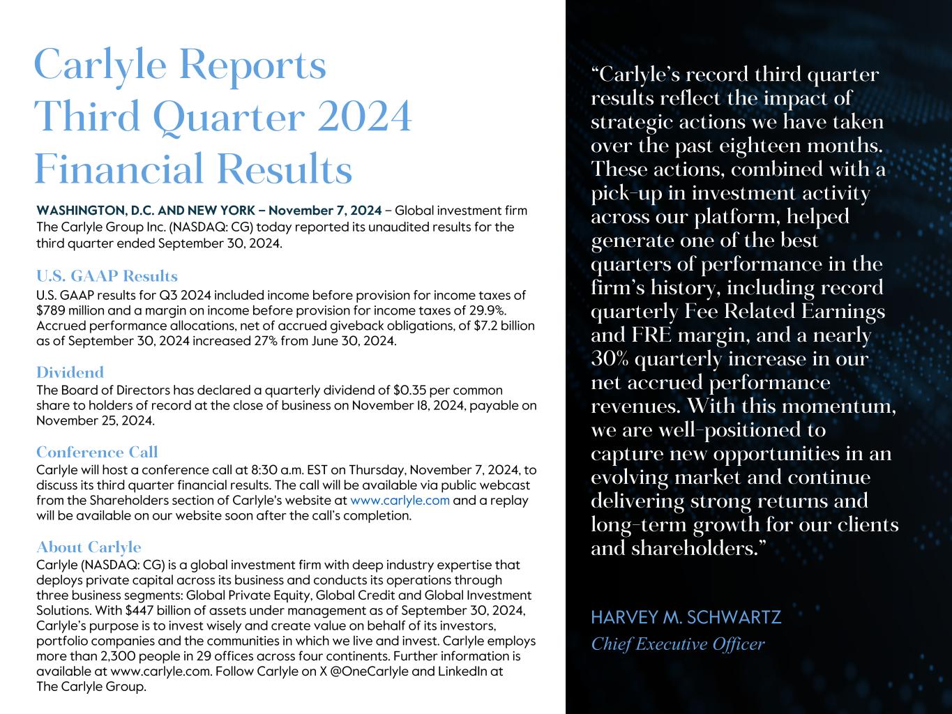 Carlyle Reports Third Quarter 2024 Financial Results WASHINGTON, D.C. AND NEW YORK – November 7, 2024 – Global investment firm The Carlyle Group Inc. (NASDAQ: CG) today reported its unaudited results for the third quarter ended September 30, 2024. U.S. GAAP Results U.S. GAAP results for Q3 2024 included income before provision for income taxes of $789 million and a margin on income before provision for income taxes of 29.9%. Accrued performance allocations, net of accrued giveback obligations, of $7.2 billion as of September 30, 2024 increased 27% from June 30, 2024. Dividend The Board of Directors has declared a quarterly dividend of $0.35 per common share to holders of record at the close of business on November 18, 2024, payable on November 25, 2024. Conference Call Carlyle will host a conference call at 8:30 a.m. EST on Thursday, November 7, 2024, to discuss its third quarter financial results. The call will be available via public webcast from the Shareholders section of Carlyle's website at www.carlyle.com and a replay will be available on our website soon after the call’s completion. About Carlyle Carlyle (NASDAQ: CG) is a global investment firm with deep industry expertise that deploys private capital across its business and conducts its operations through three business segments: Global Private Equity, Global Credit and Global Investment Solutions. With $447 billion of assets under management as of September 30, 2024, Carlyle’s purpose is to invest wisely and create value on behalf of its investors, portfolio companies and the communities in which we live and invest. Carlyle employs more than 2,300 people in 29 offices across four continents. Further information is available at www.carlyle.com. Follow Carlyle on X @OneCarlyle and LinkedIn at The Carlyle Group. “Carlyle’s record third quarter results reflect the impact of strategic actions we have taken over the past eighteen months. These actions, combined with a pick-up in investment activity across our platform, helped generate one of the best quarters of performance in the firm’s history, including record quarterly Fee Related Earnings and FRE margin, and a nearly 30% quarterly increase in our net accrued performance revenues. With this momentum, we are well-positioned to capture new opportunities in an evolving market and continue delivering strong returns and long-term growth for our clients and shareholders.” HARVEY M. SCHWARTZ Chief Executive Officer