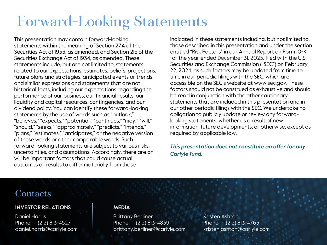 This presentation may contain forward-looking statements within the meaning of Section 27A of the Securities Act of 1933, as amended, and Section 21E of the Securities Exchange Act of 1934, as amended. These statements include, but are not limited to, statements related to our expectations, estimates, beliefs, projections, future plans and strategies, anticipated events or trends, and similar expressions and statements that are not historical facts, including our expectations regarding the performance of our business, our financial results, our liquidity and capital resources, contingencies, and our dividend policy. You can identify these forward-looking statements by the use of words such as “outlook,” “believes,” “expects,” “potential,” “continues,” “may,” “will,” “should,” “seeks,” “approximately,” “predicts,” “intends,” “plans,” “estimates,” “anticipates,” or the negative version of these words or other comparable words. Such forward-looking statements are subject to various risks, uncertainties, and assumptions. Accordingly, there are or will be important factors that could cause actual outcomes or results to differ materially from those Forward-Looking Statements indicated in these statements including, but not limited to, those described in this presentation and under the section entitled “Risk Factors” in our Annual Report on Form 10-K for the year ended December 31, 2023, filed with the U.S. Securities and Exchange Commission (“SEC”) on February 22, 2024, as such factors may be updated from time to time in our periodic filings with the SEC, which are accessible on the SEC’s website at www.sec.gov. These factors should not be construed as exhaustive and should be read in conjunction with the other cautionary statements that are included in this presentation and in our other periodic filings with the SEC. We undertake no obligation to publicly update or review any forward- looking statements, whether as a result of new information, future developments, or otherwise, except as required by applicable law. This presentation does not constitute an offer for any Carlyle fund. Contacts INVESTOR RELATIONS MEDIA Daniel Harris Brittany Berliner Kristen Ashton Phone: +1 (212) 813-4527 Phone: +1 (212) 813-4839 Phone: +1 (212) 813-4763 daniel.harris@carlyle.com brittany.berliner@carlyle.com kristen.ashton@carlyle.com