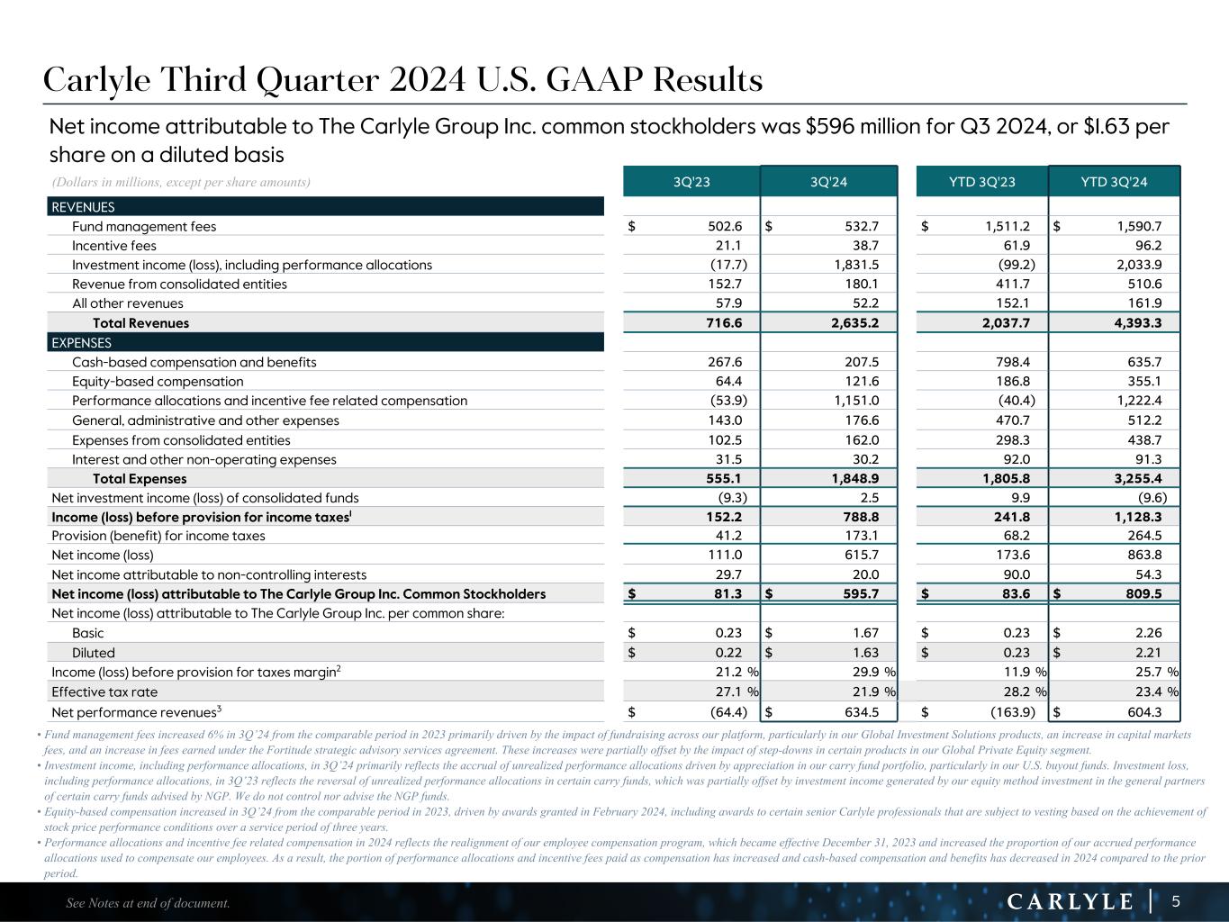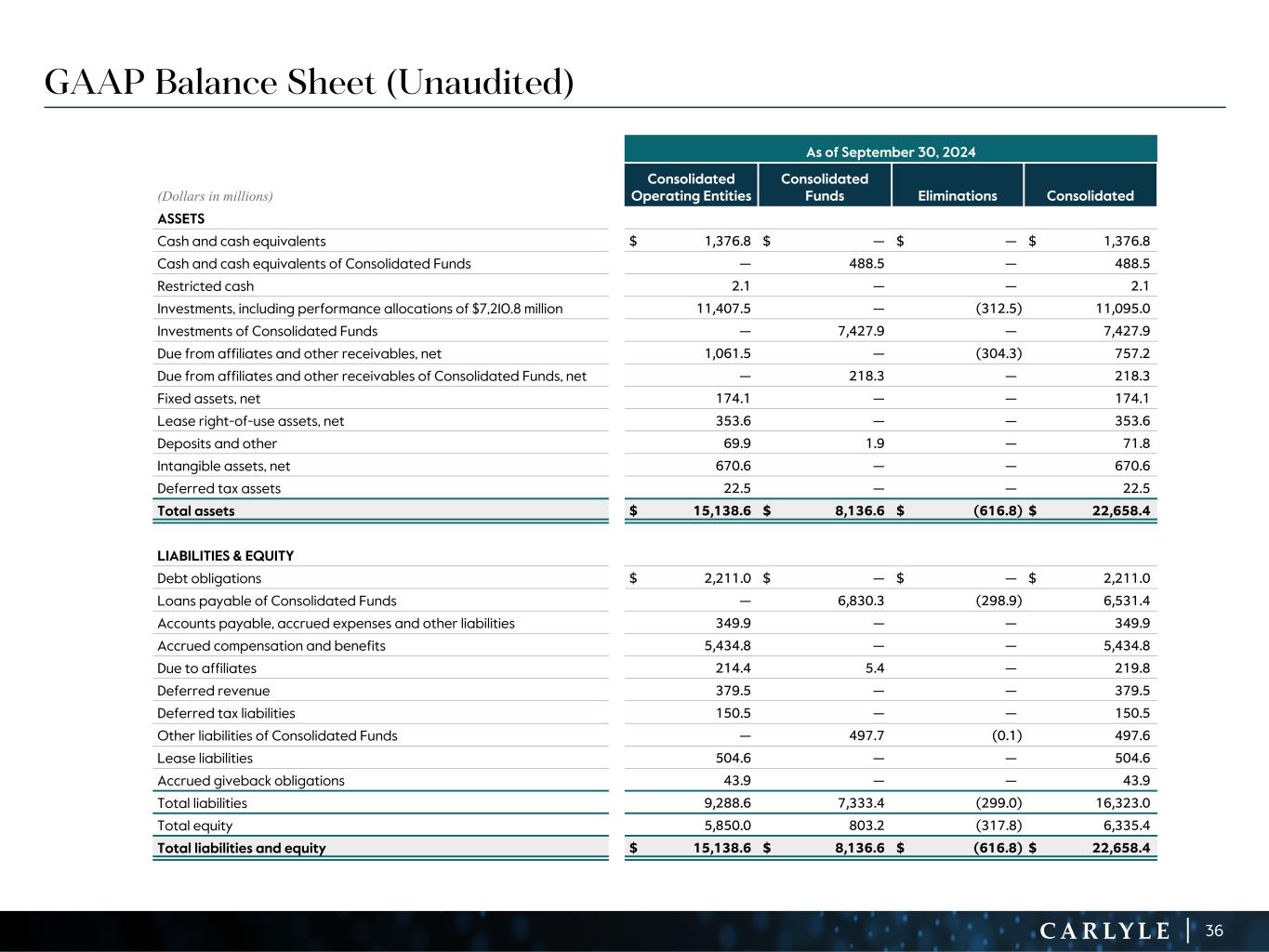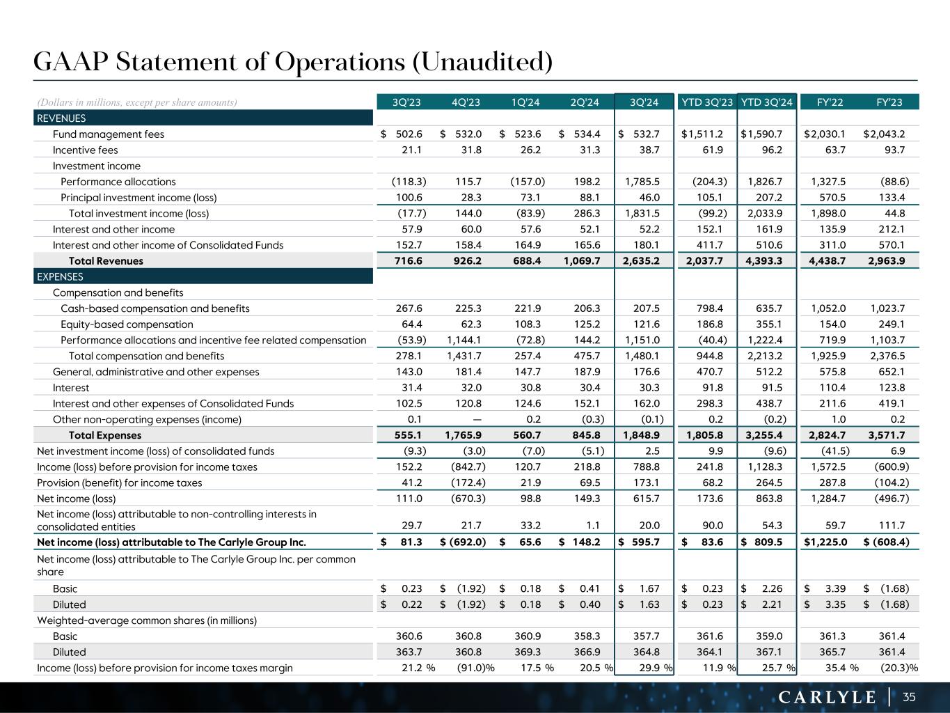 R-14 7 G-19 5 B-19 7 R-88 G-15 9 B-16 5 R-13 6 G-18 0 B-83 R-16 3 G-14 3 B-18 7 R-0 G-74 B-13 6 R-18 5 G-21 1 B-15 3 R-11 8 G-92 B-15 0 R-22 0 G-22 1 B-23 2 R-14 0 G-14 1 B-15 2R-12 0 G-16 9 B-22 2 Old Colors R-88 G-89 B-91 58595B R-23 G-234 B-234 EAEAEA R-208 G-232 B-247 D0E8F7 R-65 G-64 B-66 414042 R-8 G-51 B-94 08335E R-167 G-169 B-171 A7A9AB R-9 G-102 B-112 096670 R-220 G-221 B-222 DCDDDE R-97 G-161 B-224 61A1E0 R-237 G-217 B-157 EDD99D R-147 G-195 B-197 93C3C5 35 GAAP Statement of Operations (Unaudited) (Dollars in millions, except per share amounts) 3Q'23 4Q'23 1Q'24 2Q'24 3Q'24 YTD 3Q'23 YTD 3Q'24 FY'22 FY’23 REVENUES Fund management fees $ 502.6 $ 532.0 $ 523.6 $ 534.4 $ 532.7 $ 1,511.2 $ 1,590.7 $ 2,030.1 $ 2,043.2 Incentive fees 21.1 31.8 26.2 31.3 38.7 61.9 96.2 63.7 93.7 Investment income Performance allocations (118.3) 115.7 (157.0) 198.2 1,785.5 (204.3) 1,826.7 1,327.5 (88.6) Principal investment income (loss) 100.6 28.3 73.1 88.1 46.0 105.1 207.2 570.5 133.4 Total investment income (loss) (17.7) 144.0 (83.9) 286.3 1,831.5 (99.2) 2,033.9 1,898.0 44.8 Interest and other income 57.9 60.0 57.6 52.1 52.2 152.1 161.9 135.9 212.1 Interest and other income of Consolidated Funds 152.7 158.4 164.9 165.6 180.1 411.7 510.6 311.0 570.1 Total Revenues 716.6 926.2 688.4 1,069.7 2,635.2 2,037.7 4,393.3 4,438.7 2,963.9 EXPENSES Compensation and benefits Cash-based compensation and benefits 267.6 225.3 221.9 206.3 207.5 798.4 635.7 1,052.0 1,023.7 Equity-based compensation 64.4 62.3 108.3 125.2 121.6 186.8 355.1 154.0 249.1 Performance allocations and incentive fee related compensation (53.9) 1,144.1 (72.8) 144.2 1,151.0 (40.4) 1,222.4 719.9 1,103.7 Total compensation and benefits 278.1 1,431.7 257.4 475.7 1,480.1 944.8 2,213.2 1,925.9 2,376.5 General, administrative and other expenses 143.0 181.4 147.7 187.9 176.6 470.7 512.2 575.8 652.1 Interest 31.4 32.0 30.8 30.4 30.3 91.8 91.5 110.4 123.8 Interest and other expenses of Consolidated Funds 102.5 120.8 124.6 152.1 162.0 298.3 438.7 211.6 419.1 Other non-operating expenses (income) 0.1 — 0.2 (0.3) (0.1) 0.2 (0.2) 1.0 0.2 Total Expenses 555.1 1,765.9 560.7 845.8 1,848.9 1,805.8 3,255.4 2,824.7 3,571.7 Net investment income (loss) of consolidated funds (9.3) (3.0) (7.0) (5.1) 2.5 9.9 (9.6) (41.5) 6.9 Income (loss) before provision for income taxes 152.2 (842.7) 120.7 218.8 788.8 241.8 1,128.3 1,572.5 (600.9) Provision (benefit) for income taxes 41.2 (172.4) 21.9 69.5 173.1 68.2 264.5 287.8 (104.2) Net income (loss) 111.0 (670.3) 98.8 149.3 615.7 173.6 863.8 1,284.7 (496.7) Net income (loss) attributable to non-controlling interests in consolidated entities 29.7 21.7 33.2 1.1 20.0 90.0 54.3 59.7 111.7 Net income (loss) attributable to The Carlyle Group Inc. $ 81.3 $ (692.0) $ 65.6 $ 148.2 $ 595.7 $ 83.6 $ 809.5 $ 1,225.0 $ (608.4) Net income (loss) attributable to The Carlyle Group Inc. per common share Basic $ 0.23 $ (1.92) $ 0.18 $ 0.41 $ 1.67 $ 0.23 $ 2.26 $ 3.39 $ (1.68) Diluted $ 0.22 $ (1.92) $ 0.18 $ 0.40 $ 1.63 $ 0.23 $ 2.21 $ 3.35 $ (1.68) Weighted-average common shares (in millions) Basic 360.6 360.8 360.9 358.3 357.7 361.6 359.0 361.3 361.4 Diluted 363.7 360.8 369.3 366.9 364.8 364.1 367.1 365.7 361.4 Income (loss) before provision for income taxes margin 21.2 % (91.0) % 17.5 % 20.5 % 29.9 % 11.9 % 25.7 % 35.4 % (20.3) %
