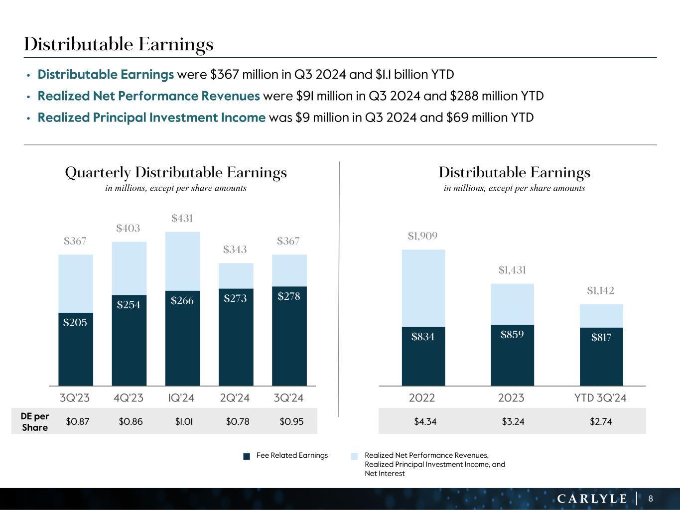 R-14 7 G-19 5 B-19 7 R-88 G-15 9 B-16 5 R-13 6 G-18 0 B-83 R-16 3 G-14 3 B-18 7 R-0 G-74 B-13 6 R-18 5 G-21 1 B-15 3 R-11 8 G-92 B-15 0 R-22 0 G-22 1 B-23 2 R-14 0 G-14 1 B-15 2R-12 0 G-16 9 B-22 2 Old Colors R-88 G-89 B-91 58595B R-23 G-234 B-234 EAEAEA R-208 G-232 B-247 D0E8F7 R-65 G-64 B-66 414042 R-8 G-51 B-94 08335E R-167 G-169 B-171 A7A9AB R-9 G-102 B-112 096670 R-220 G-221 B-222 DCDDDE R-97 G-161 B-224 61A1E0 R-237 G-217 B-157 EDD99D R-147 G-195 B-197 93C3C5 7 (1) Fee related performance revenues are the realized portion of performance revenues that are measured and received on a recurring basis, are not dependent on the disposition of investments, and which are not at risk of giveback. The related compensation expense is included in cash-based compensation and benefits. (2) A reconciliation of Distributable Earnings to After-tax Distributable Earnings per common share is provided on page 29. (3) The Board of Directors has declared a quarterly dividend of $0.35 per common share to holders of record at the close of business on November 18, 2024, payable on November 25, 2024. See Notes at the end of the document for our Dividend Policy. Carlyle Third Quarter 2024 Total Segment Operating Results (Dollars in millions, except per share amounts) 3Q'23 3Q'24 YTD 3Q'23 YTD 3Q'24 SEGMENT REVENUES Fund management fees $ 518.1 $ 526.5 $ 1,539.3 $ 1,567.6 Transaction and portfolio advisory fees, net and other 11.2 27.4 45.8 83.0 Fee related performance revenues1 23.4 36.3 125.4 98.5 Total segment fee revenues 552.7 590.2 1,710.5 1,749.1 Realized performance revenues 180.4 275.9 680.6 830.2 Realized principal investment income 23.4 9.1 69.3 69.4 Interest income 20.1 19.8 48.3 58.2 Total Segment Revenues $ 776.6 $ 895.0 $ 2,508.7 $ 2,706.9 SEGMENT EXPENSES Compensation and benefits Cash-based compensation and benefits $ 256.0 $ 207.6 $ 805.3 $ 627.2 Realized performance revenues related compensation 30.4 185.3 286.0 541.9 Total compensation and benefits 286.4 392.9 1,091.3 1,169.1 General, administrative and other expenses 81.6 92.9 270.8 270.5 Depreciation and amortization expense 10.4 11.8 29.0 34.2 Interest expense 30.8 30.3 89.8 91.5 Total Segment Expenses $ 409.2 $ 527.9 $ 1,480.9 $ 1,565.3 Total Segment Revenues $ 776.6 $ 895.0 $ 2,508.7 $ 2,706.9 Total Segment Expenses 409.2 527.9 1,480.9 1,565.3 (=) Distributable Earnings $ 367.4 $ 367.1 $ 1,027.8 $ 1,141.6 (-) Realized Net Performance Revenues 150.0 90.6 394.6 288.3 (-) Realized Principal Investment Income 23.4 9.1 69.3 69.4 (+) Net Interest 10.7 10.5 41.5 33.3 (=) Fee Related Earnings $ 204.7 $ 277.9 $ 605.4 $ 817.2 After-tax Distributable Earnings per common share2 $ 0.87 $ 0.95 $ 2.38 $ 2.74 Dividend per common share3 $ 0.35 $ 0.35 $ 1.05 $ 1.05