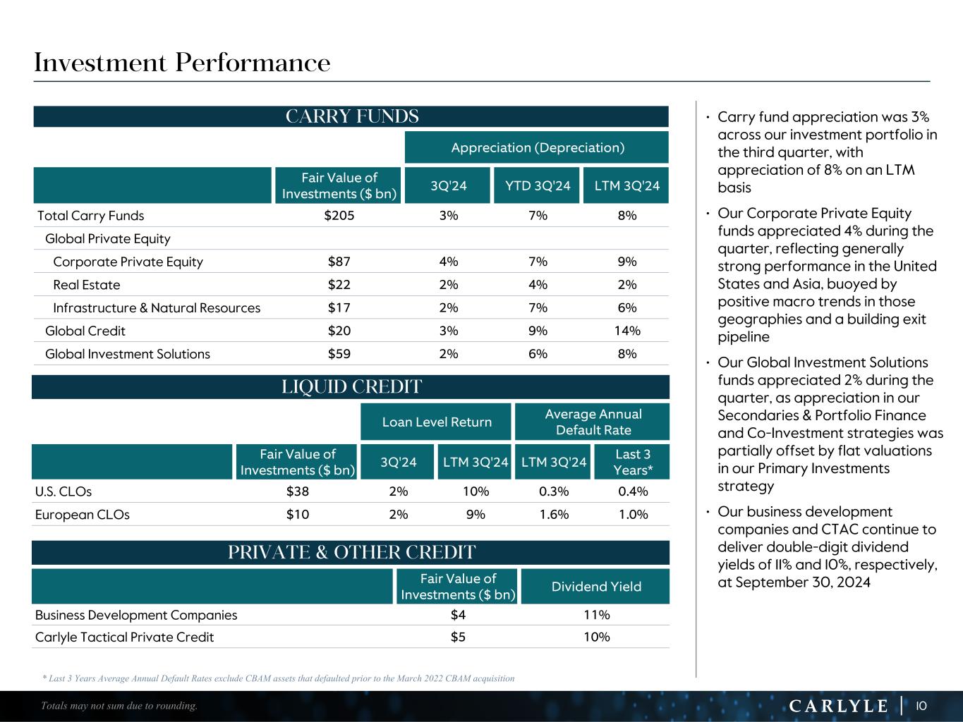 R-14 7 G-19 5 B-19 7 R-88 G-15 9 B-16 5 R-13 6 G-18 0 B-83 R-16 3 G-14 3 B-18 7 R-0 G-74 B-13 6 R-18 5 G-21 1 B-15 3 R-11 8 G-92 B-15 0 R-22 0 G-22 1 B-23 2 R-14 0 G-14 1 B-15 2R-12 0 G-16 9 B-22 2 Old Colors R-88 G-89 B-91 58595B R-23 G-234 B-234 EAEAEA R-208 G-232 B-247 D0E8F7 R-65 G-64 B-66 414042 R-8 G-51 B-94 08335E R-167 G-169 B-171 A7A9AB R-9 G-102 B-112 096670 R-220 G-221 B-222 DCDDDE R-97 G-161 B-224 61A1E0 R-237 G-217 B-157 EDD99D R-147 G-195 B-197 93C3C5 10 Investment Performance • Carry fund appreciation was 3% across our investment portfolio in the third quarter, with appreciation of 8% on an LTM basis • Our Corporate Private Equity funds appreciated 4% during the quarter, reflecting generally strong performance in the United States and Asia, buoyed by positive macro trends in those geographies and a building exit pipeline • Our Global Investment Solutions funds appreciated 2% during the quarter, as appreciation in our Secondaries & Portfolio Finance and Co-Investment strategies was partially offset by flat valuations in our Primary Investments strategy • Our business development companies and CTAC continue to deliver double-digit dividend yields of 11% and 10%, respectively, at September 30, 2024 Totals may not sum due to rounding. LIQUID CREDIT Loan Level Return Average Annual Default Rate Fair Value of Investments ($ bn) 3Q'24 LTM 3Q'24 LTM 3Q'24 Last 3 Years* U.S. CLOs $38 2% 10% 0.3% 0.4% European CLOs $10 2% 9% 1.6% 1.0% CARRY FUNDS Appreciation (Depreciation) Fair Value of Investments ($ bn) 3Q'24 YTD 3Q'24 LTM 3Q'24 Total Carry Funds $205 3% 7% 8% Global Private Equity Corporate Private Equity $87 4% 7% 9% Real Estate $22 2% 4% 2% Infrastructure & Natural Resources $17 2% 7% 6% Global Credit $20 3% 9% 14% Global Investment Solutions $59 2% 6% 8% PRIVATE & OTHER CREDIT Fair Value of Investments ($ bn) Dividend Yield Business Development Companies $4 11% Carlyle Tactical Private Credit $5 10% * Last 3 Years Average Annual Default Rates exclude CBAM assets that defaulted prior to the March 2022 CBAM acquisition