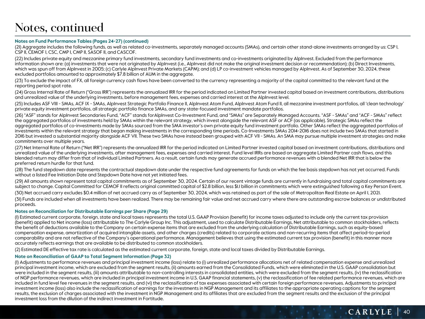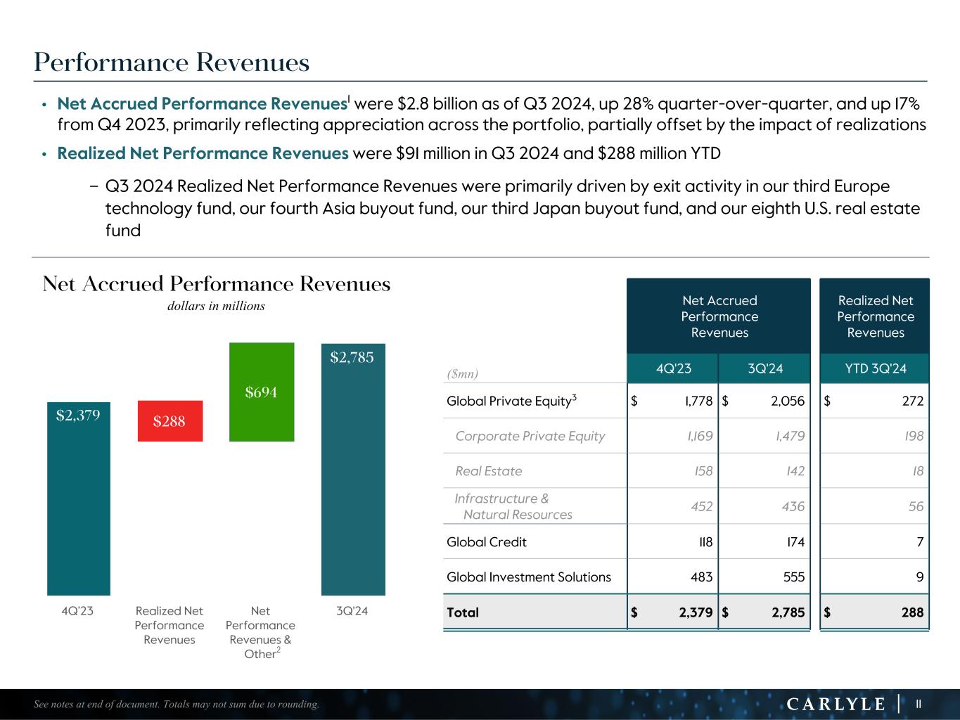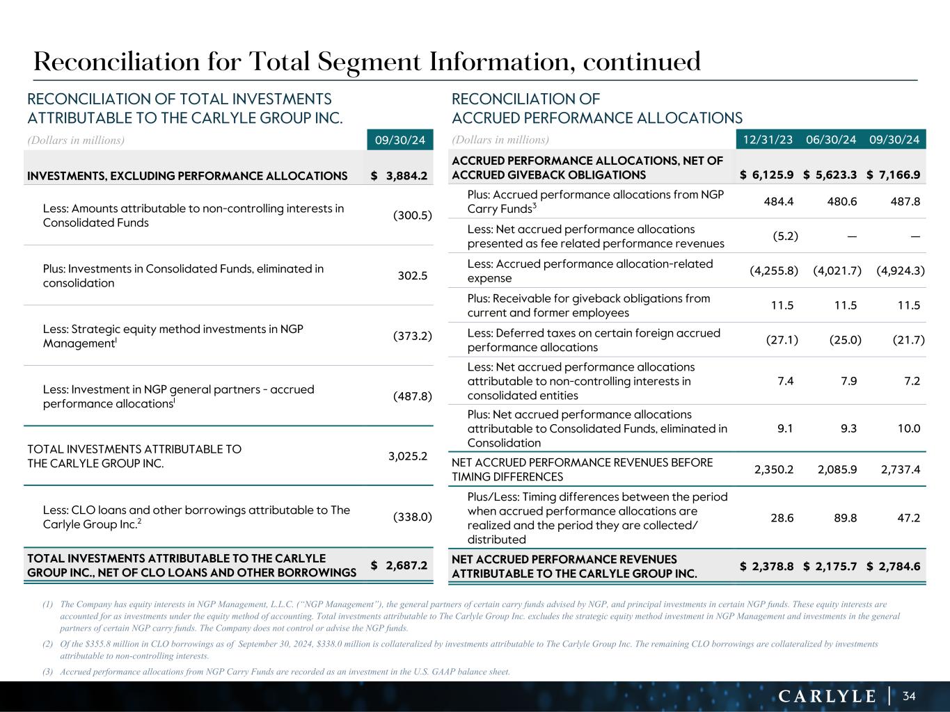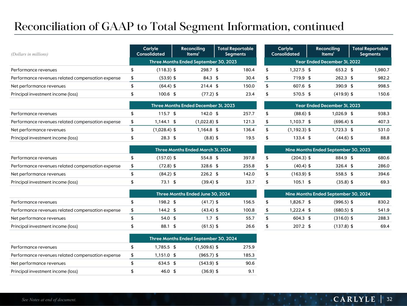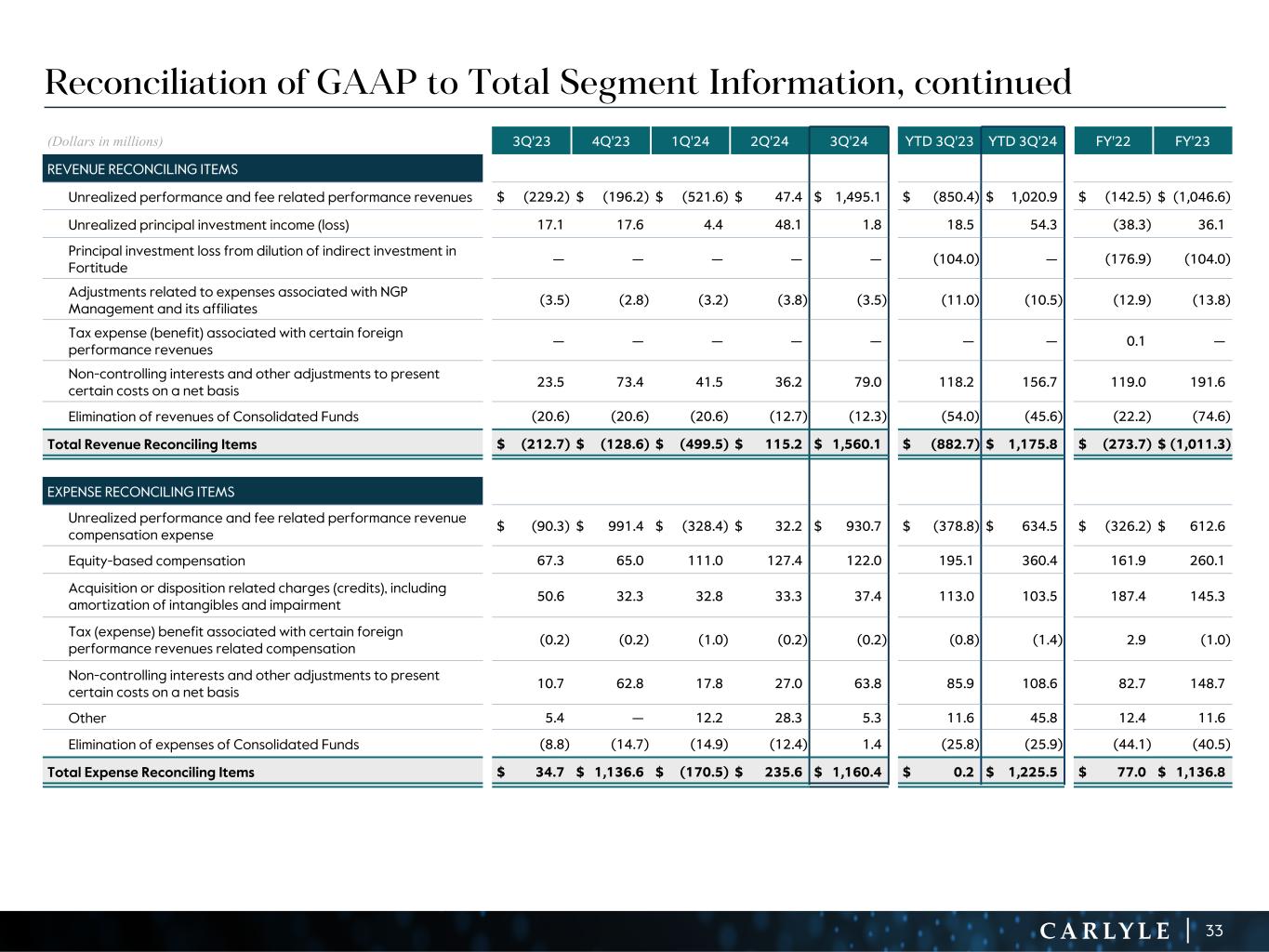 R-14 7 G-19 5 B-19 7 R-88 G-15 9 B-16 5 R-13 6 G-18 0 B-83 R-16 3 G-14 3 B-18 7 R-0 G-74 B-13 6 R-18 5 G-21 1 B-15 3 R-11 8 G-92 B-15 0 R-22 0 G-22 1 B-23 2 R-14 0 G-14 1 B-15 2R-12 0 G-16 9 B-22 2 Old Colors R-88 G-89 B-91 58595B R-23 G-234 B-234 EAEAEA R-208 G-232 B-247 D0E8F7 R-65 G-64 B-66 414042 R-8 G-51 B-94 08335E R-167 G-169 B-171 A7A9AB R-9 G-102 B-112 096670 R-220 G-221 B-222 DCDDDE R-97 G-161 B-224 61A1E0 R-237 G-217 B-157 EDD99D R-147 G-195 B-197 93C3C5 32 Reconciliation of GAAP to Total Segment Information, continued (Dollars in millions) Carlyle Consolidated Reconciling Items1 Total Reportable Segments Carlyle Consolidated Reconciling Items1 Total Reportable Segments Three Months Ended September 30, 2023 Year Ended December 31, 2022 Performance revenues $ (118.3) $ 298.7 $ 180.4 $ 1,327.5 $ 653.2 $ 1,980.7 Performance revenues related compensation expense $ (53.9) $ 84.3 $ 30.4 $ 719.9 $ 262.3 $ 982.2 Net performance revenues $ (64.4) $ 214.4 $ 150.0 $ 607.6 $ 390.9 $ 998.5 Principal investment income (loss) $ 100.6 $ (77.2) $ 23.4 $ 570.5 $ (419.9) $ 150.6 Three Months Ended December 31, 2023 Year Ended December 31, 2023 Performance revenues $ 115.7 $ 142.0 $ 257.7 $ (88.6) $ 1,026.9 $ 938.3 Performance revenues related compensation expense $ 1,144.1 $ (1,022.8) $ 121.3 $ 1,103.7 $ (696.4) $ 407.3 Net performance revenues $ (1,028.4) $ 1,164.8 $ 136.4 $ (1,192.3) $ 1,723.3 $ 531.0 Principal investment income (loss) $ 28.3 $ (8.8) $ 19.5 $ 133.4 $ (44.6) $ 88.8 Three Months Ended March 31, 2024 Nine Months Ended September 30, 2023 Performance revenues $ (157.0) $ 554.8 $ 397.8 $ (204.3) $ 884.9 $ 680.6 Performance revenues related compensation expense $ (72.8) $ 328.6 $ 255.8 $ (40.4) $ 326.4 $ 286.0 Net performance revenues $ (84.2) $ 226.2 $ 142.0 $ (163.9) $ 558.5 $ 394.6 Principal investment income (loss) $ 73.1 $ (39.4) $ 33.7 $ 105.1 $ (35.8) $ 69.3 Three Months Ended June 30, 2024 Nine Months Ended September 30, 2024 Performance revenues $ 198.2 $ (41.7) $ 156.5 $ 1,826.7 $ (996.5) $ 830.2 Performance revenues related compensation expense $ 144.2 $ (43.4) $ 100.8 $ 1,222.4 $ (680.5) $ 541.9 Net performance revenues $ 54.0 $ 1.7 $ 55.7 $ 604.3 $ (316.0) $ 288.3 Principal investment income (loss) $ 88.1 $ (61.5) $ 26.6 $ 207.2 $ (137.8) $ 69.4 Three Months Ended September 30, 2024 Performance revenues $ 1,785.5 $ (1,509.6) $ 275.9 Performance revenues related compensation expense $ 1,151.0 $ (965.7) $ 185.3 Net performance revenues $ 634.5 $ (543.9) $ 90.6 Principal investment income (loss) $ 46.0 $ (36.9) $ 9.1 See Notes at end of document.
