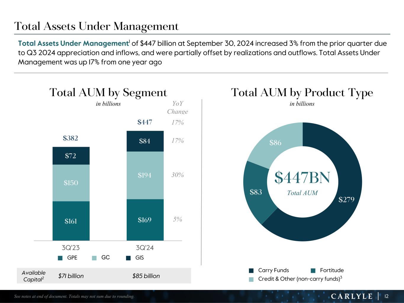 R-14 7 G-19 5 B-19 7 R-88 G-15 9 B-16 5 R-13 6 G-18 0 B-83 R-16 3 G-14 3 B-18 7 R-0 G-74 B-13 6 R-18 5 G-21 1 B-15 3 R-11 8 G-92 B-15 0 R-22 0 G-22 1 B-23 2 R-14 0 G-14 1 B-15 2R-12 0 G-16 9 B-22 2 Old Colors R-88 G-89 B-91 58595B R-23 G-234 B-234 EAEAEA R-208 G-232 B-247 D0E8F7 R-65 G-64 B-66 414042 R-8 G-51 B-94 08335E R-167 G-169 B-171 A7A9AB R-9 G-102 B-112 096670 R-220 G-221 B-222 DCDDDE R-97 G-161 B-224 61A1E0 R-237 G-217 B-157 EDD99D R-147 G-195 B-197 93C3C5 12 $279 $83 $86 $161 $169 $150 $194 $72 $84$382 $447 3Q'23 3Q'24 Total Assets Under Management Total Assets Under Management1 of $447 billion at September 30, 2024 increased 3% from the prior quarter due to Q3 2024 appreciation and inflows, and were partially offset by realizations and outflows. Total Assets Under Management was up 17% from one year ago $447BN Total AUM See notes at end of document. Totals may not sum due to rounding. n Carry Funds n Fortitude n Credit & Other (non-carry funds)3 Total AUM by Segment in billions Total AUM by Product Type in billions Available Capital2 $71 billion $85 billion n GPE n GC n GIS YoY Change 17% 17% 30% 5%